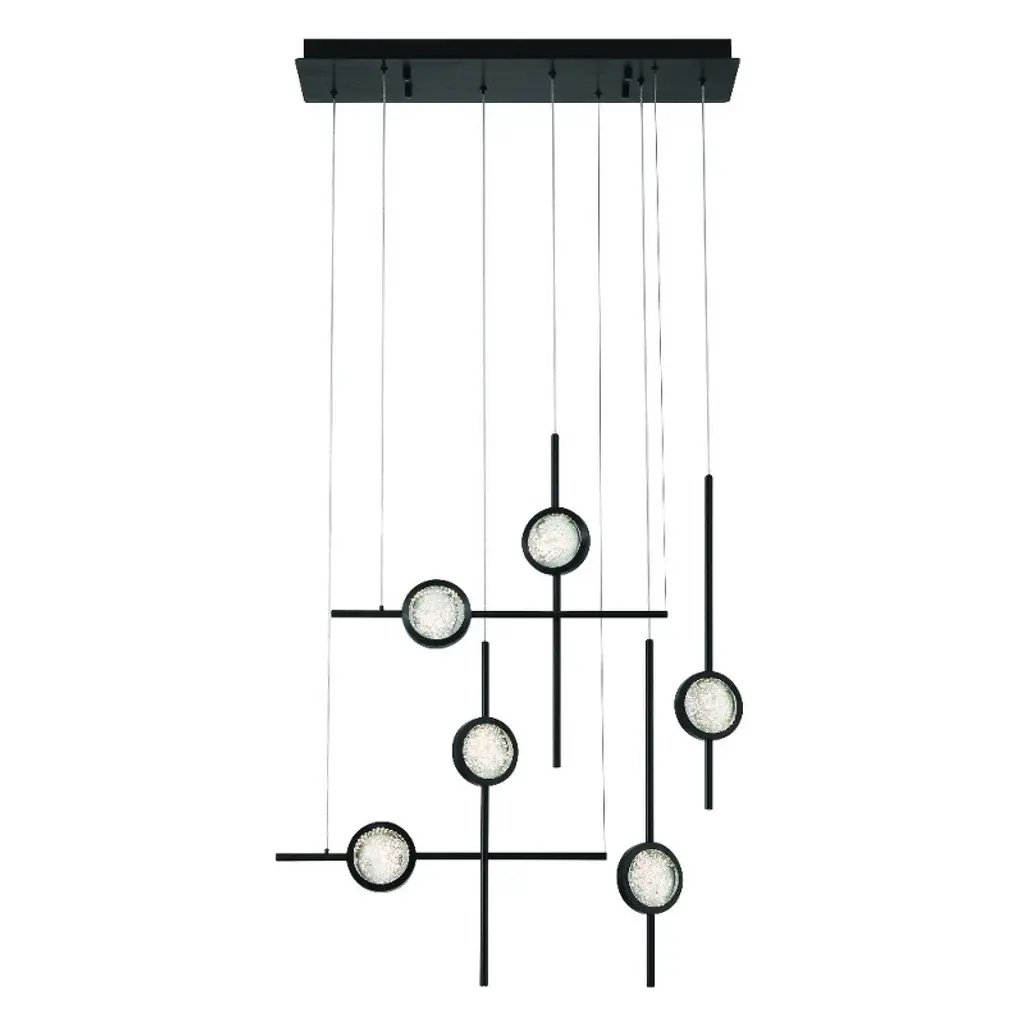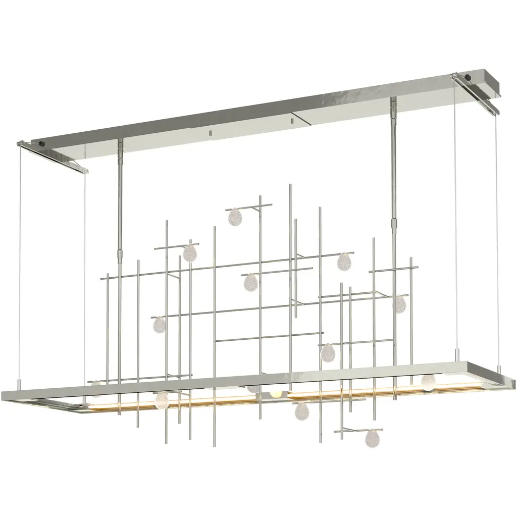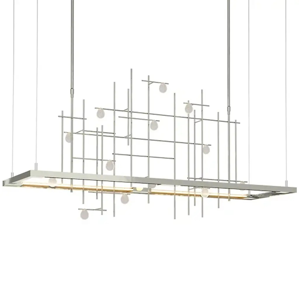 Dynamic and innovative, the Hubbardton Forge Spring LED Linear Suspension is inspired by raindrops cascading down a garden trellis. The LED light source illuminates through a light guide, technology previously used in the television industry that has been recently engineered for use in lighting. The hand blown glass drops on the hand forged grid by AO Glass sparkle and shine with fine artisan detailing when lit. Part of the Four Seasons Collection.