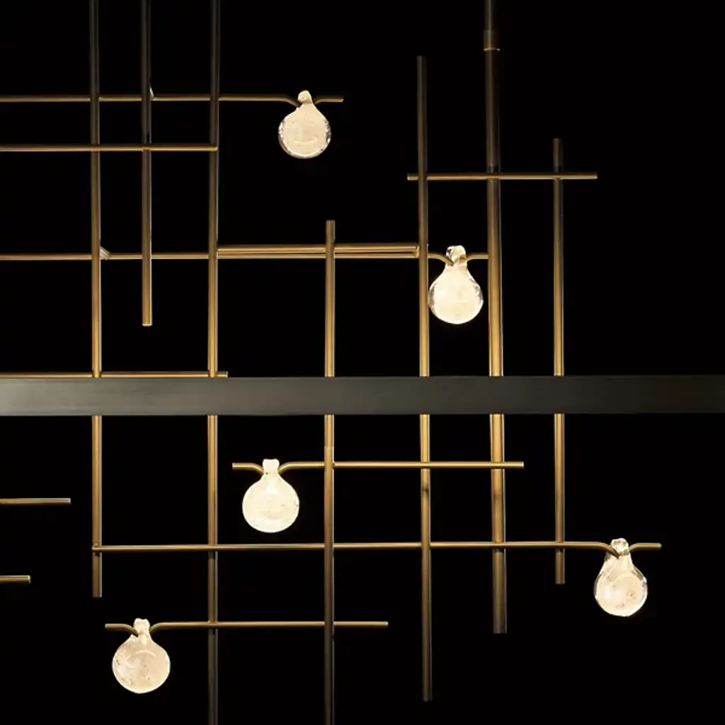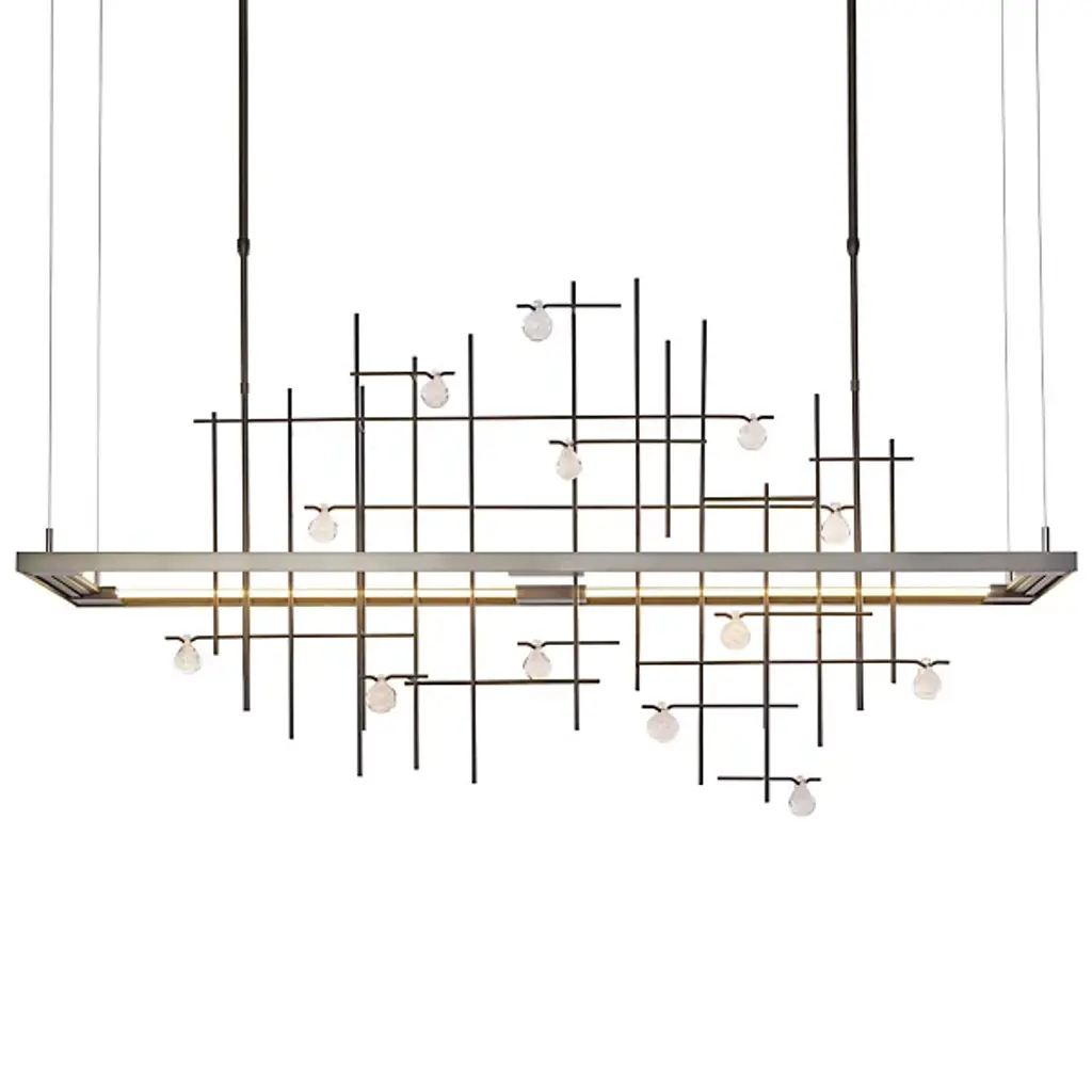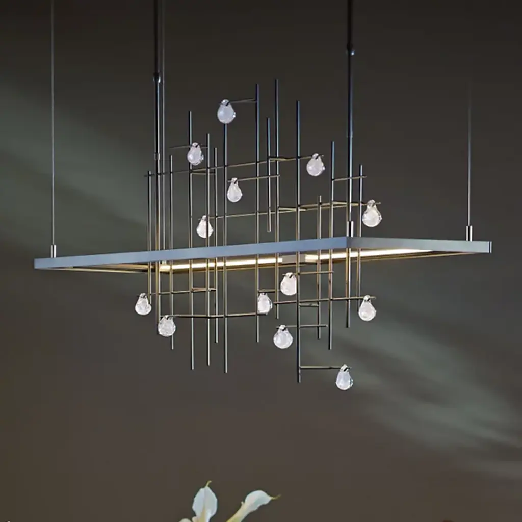 Dynamic and innovative, the Hubbardton Forge Spring LED Linear Suspension is inspired by raindrops cascading down a garden trellis. The LED light source illuminates through a light guide, technology previously used in the television industry that has been recently engineered for use in lighting. The hand blown glass drops on the hand forged grid by AO Glass sparkle and shine with fine artisan detailing when lit. Part of the Four Seasons Collection.