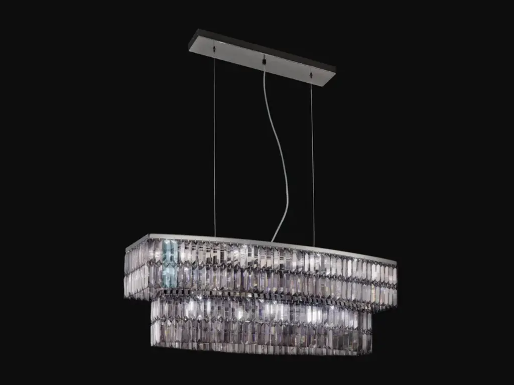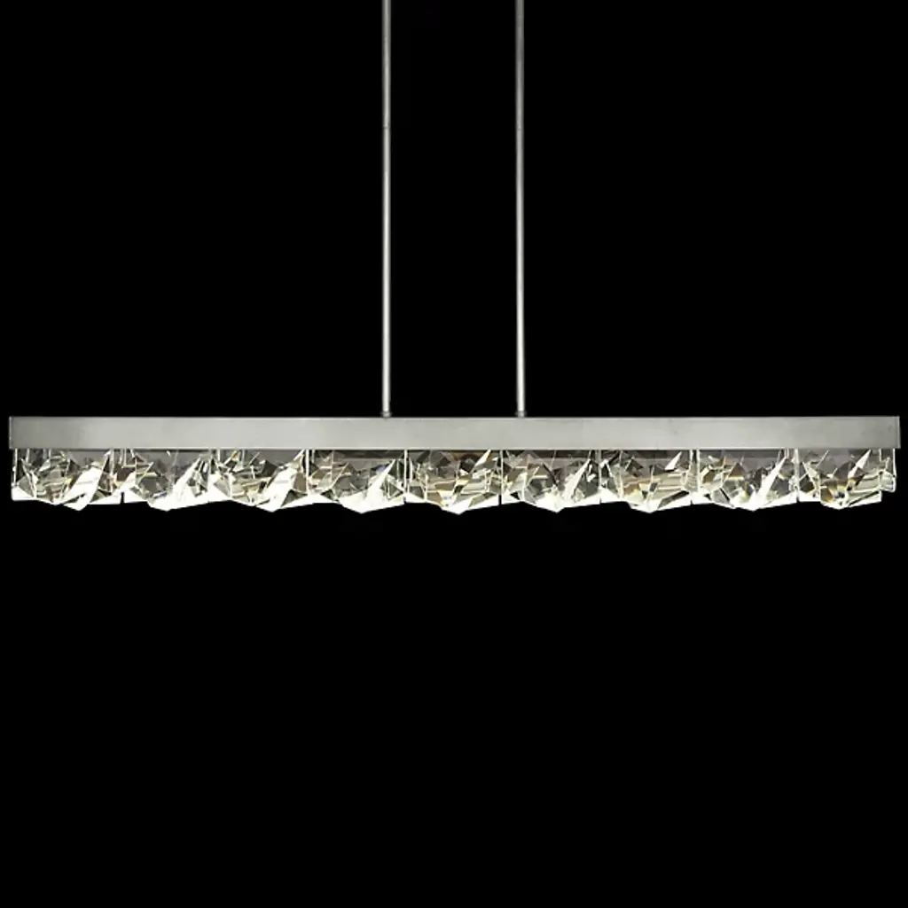 The Strata LED Linear Suspension from Fine Art Handcrafted Lighting tops one's tables with a visually shattering display of highlights filtered through hand-sculpted faceted forms. This part art, part lighting, and part jewelry design seek to capture the energy of light. A minimalist suspension and crossbar let the handmade elements below stand out. Hand-cut from a solid block, the crystal diffusers rain down with clean cuts that transform before the eyes. Presented with minimal glare, LED light exits as a shimmering display for a surrounding glow.