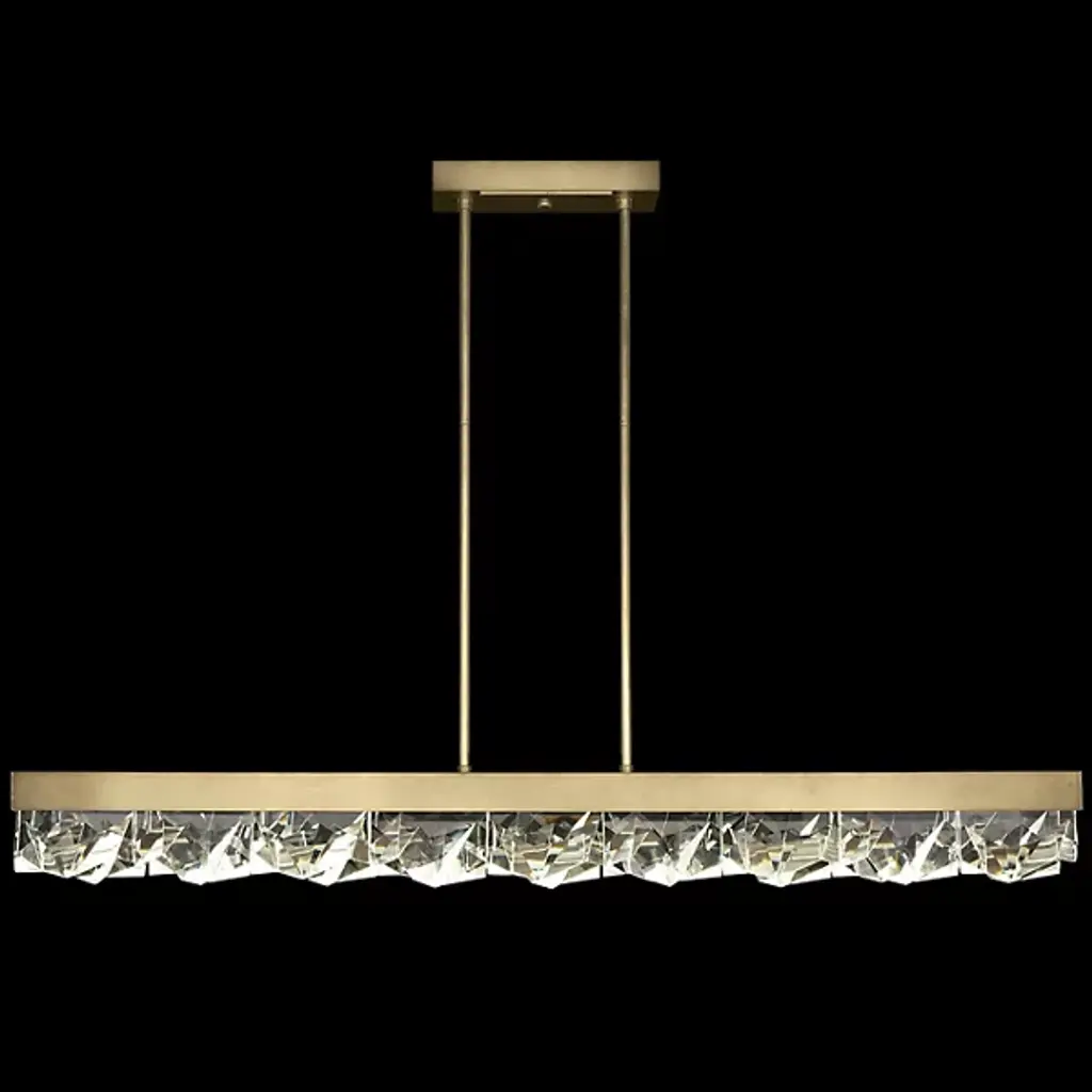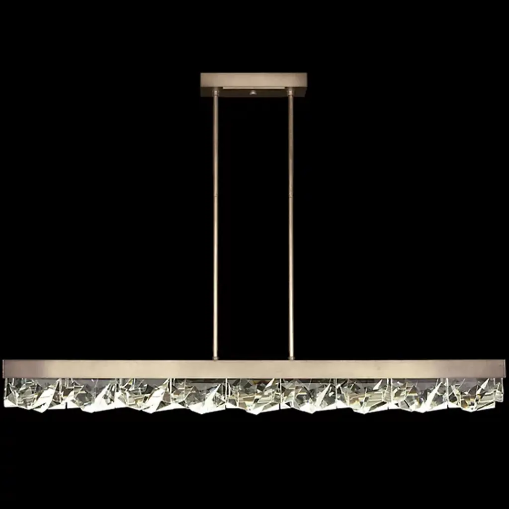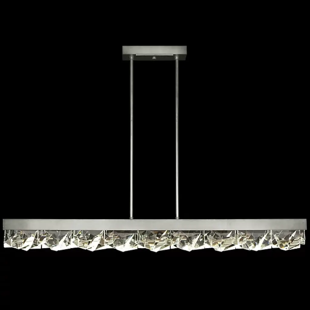 The Strata LED Linear Suspension from Fine Art Handcrafted Lighting tops one's tables with a visually shattering display of highlights filtered through hand-sculpted faceted forms. This part art, part lighting, and part jewelry design seek to capture the energy of light. A minimalist suspension and crossbar let the handmade elements below stand out. Hand-cut from a solid block, the crystal diffusers rain down with clean cuts that transform before the eyes. Presented with minimal glare, LED light exits as a shimmering display for a surrounding glow.