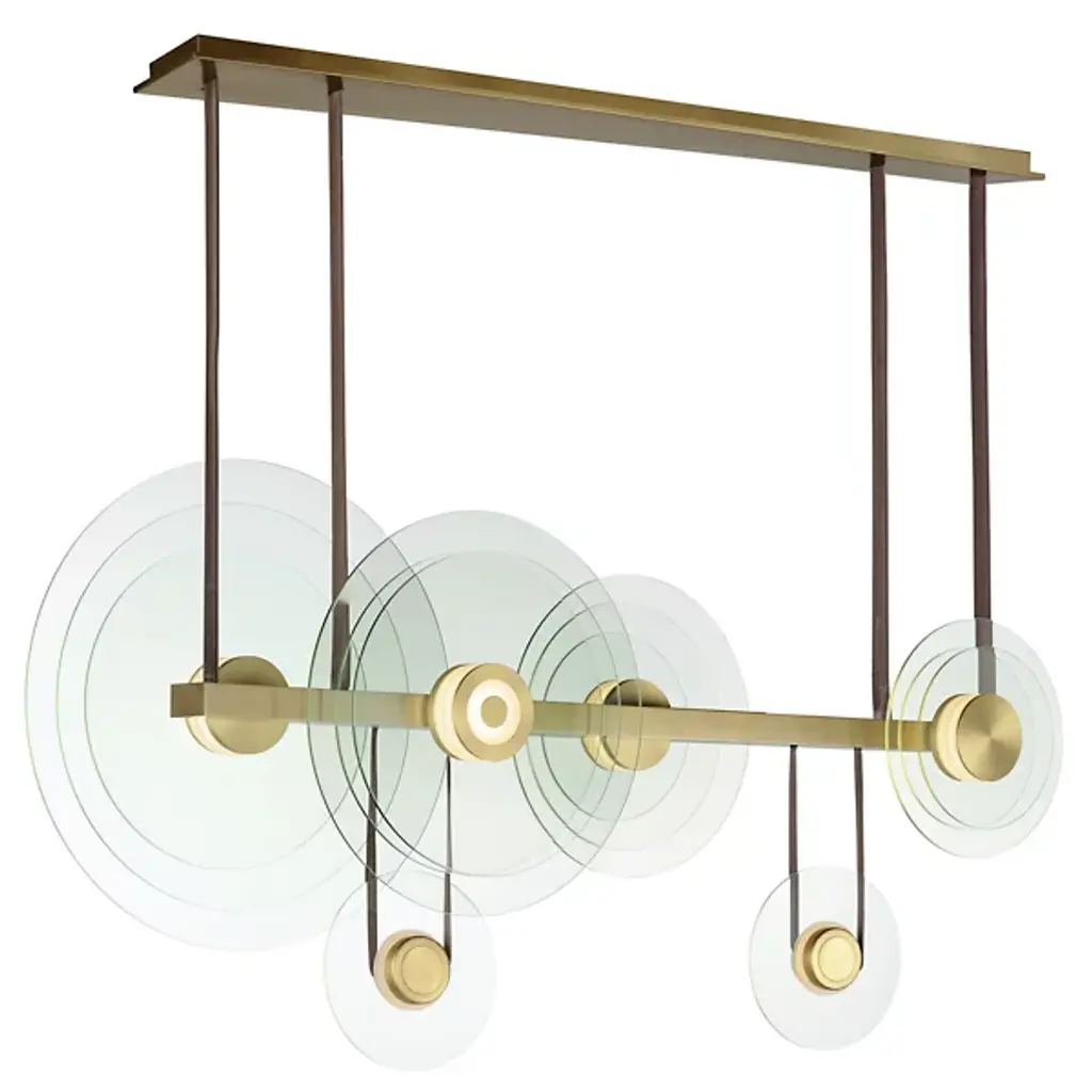 Crafted with meticulous attention to detail, the Stratum LED Linear Suspension from Studio M features clear slabs of glass, each measuring half an inch thick, sandwiched between two discs finished in Natural Aged Brass. As the glass slabs converge towards the center, they gradually increase in size, creating a mesmerizing gradation of light that highlights the unique shape and character of the glass. Concealed polycarbonate tubes house dedicated LED lighting, ensuring an even distribution of light in all directions. Each light element is suspended by Dark Brown leather straps, which also conceal the electrical wiring; the brass discs add a touch of sophistication to the design, elevating its surroundings and blending elements of contemporary style with innovative technologies and expert craftsmanship.