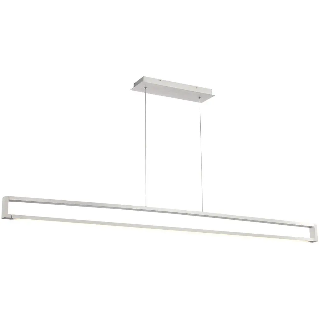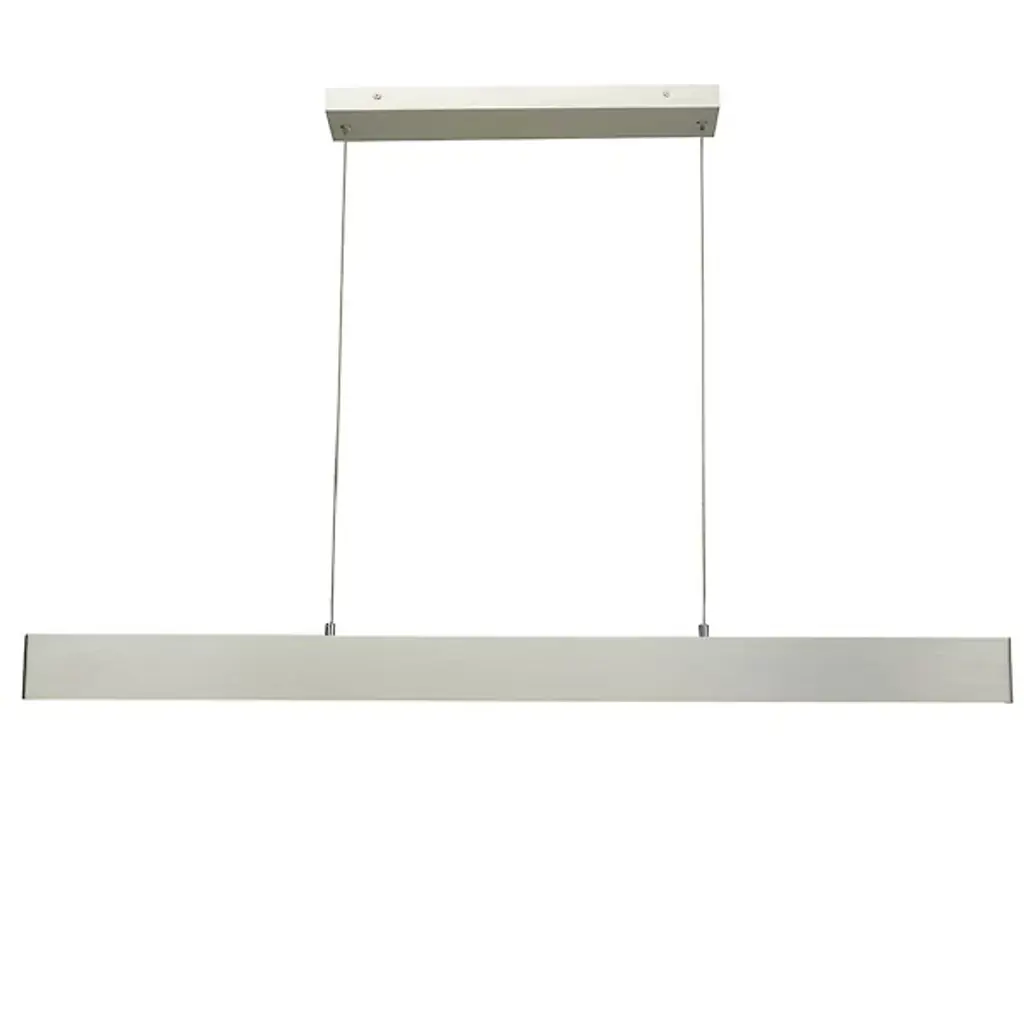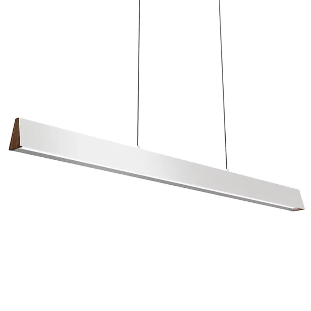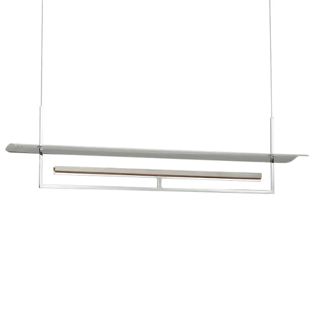 A clean and straightforward piece that spreads an even layer of light, the Stylus LED Linear Suspension from Oxygen Lighting blends easily with a range of styles. A set of two thin cables connect the thin and lengthy aluminum body with the thick, rectangular ceiling piece. The underside of the piece is lined with matte white acrylic that contains an integrated LED. The light emitted from the LED is bright and inviting, flowing out into the space.