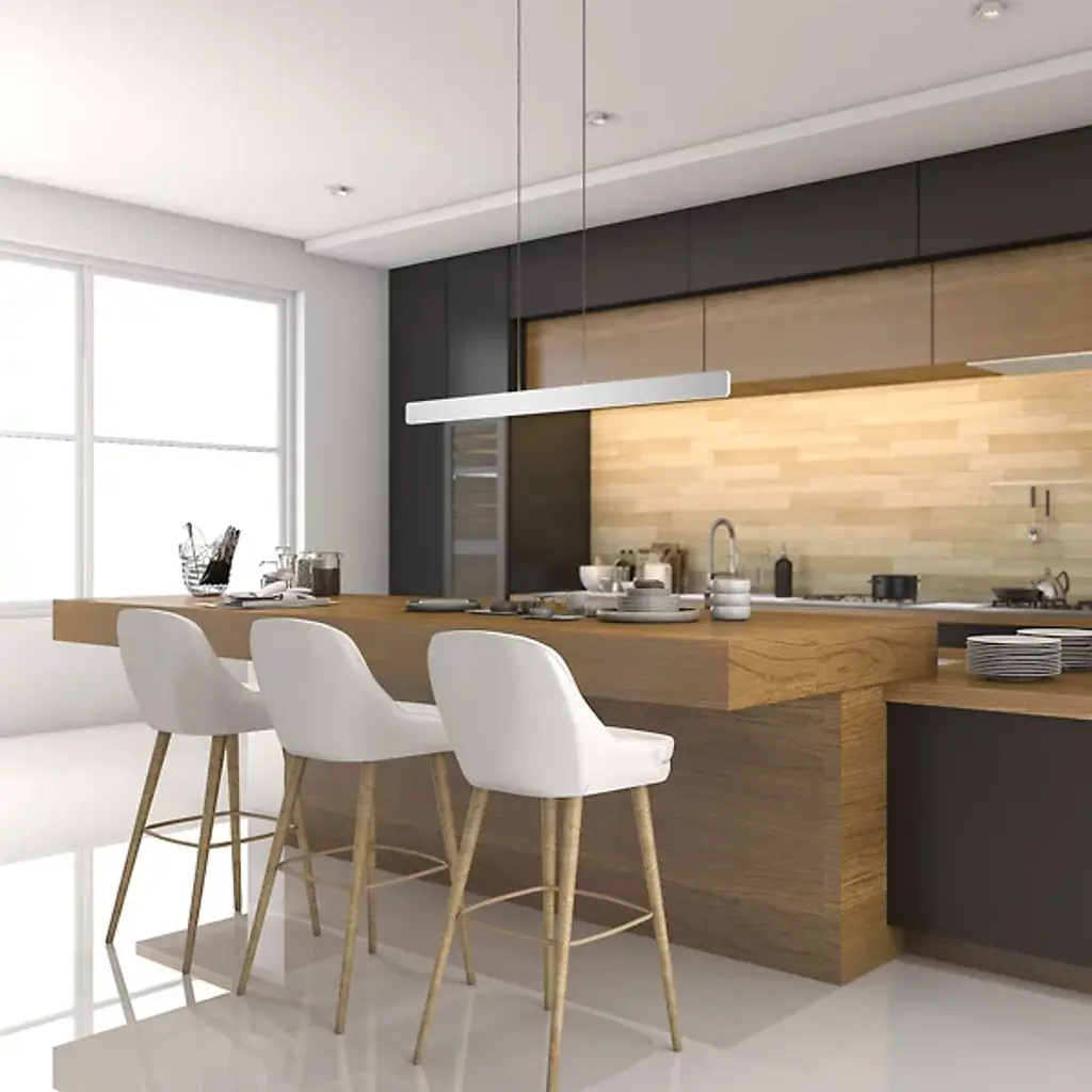 A minimalist dream realized as a stunning suspension. Grace your dining table or kitchen island with the cool contours of the Sub LED Linear Suspension from Koncept. Its silhouette is marked by a rectangular shape, softened along the edges to create a pleasant sense of flow and fluidity. Sleek wiring adds a subtle yet graphic hint to the aerodynamic piece. LEDs wrap around every edge of the metal housing, giving rooms truly multi-directional lighting. A continuous outline of crisp LED light radiates out, neat and glare-free.