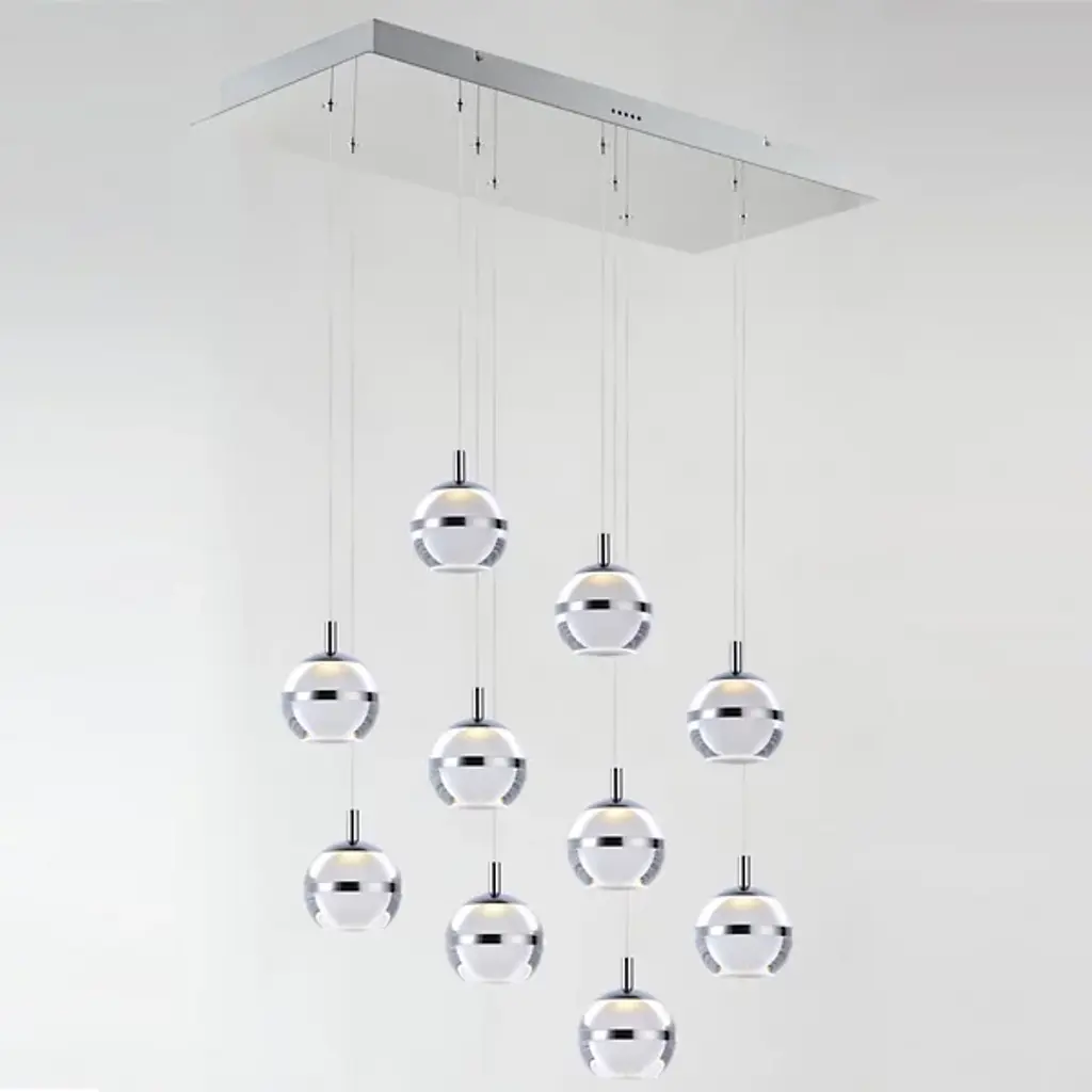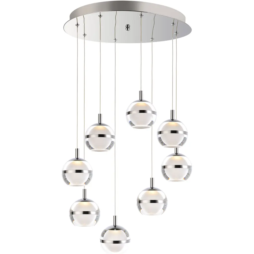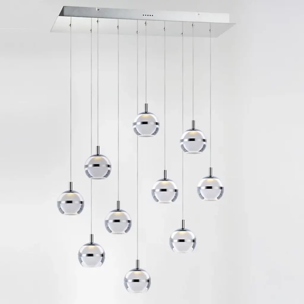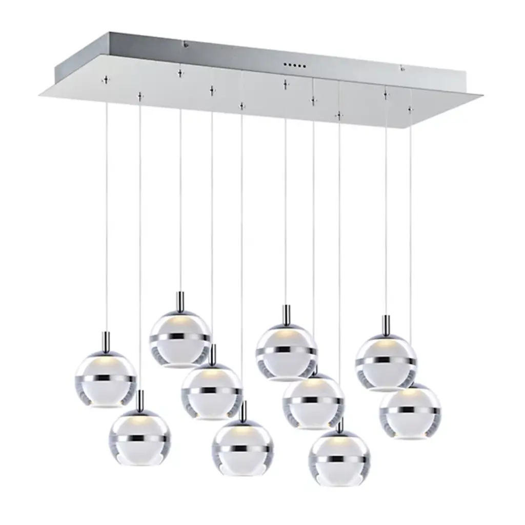 The Swank LED Linear Suspension by ET2 Lighting is an elegant addition to spaces. A rectangular canopy supports a beautiful array of crystal clean acrylic orbs that are trimmed with a metal band and topped with minimal metal stems. Like a set of beautiful ornaments, they diffuse a layer of energy-efficient lights through a frosted interior, bringing a bright and decorative touch to their surroundings. The bottom of each piece is dimpled, offering a unique optical effect to this sleek and sophisticated composition.