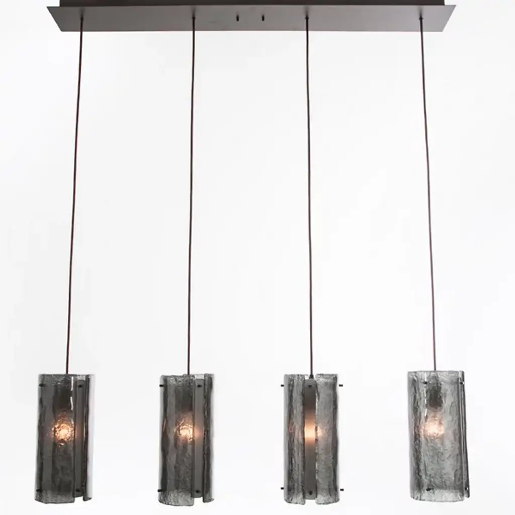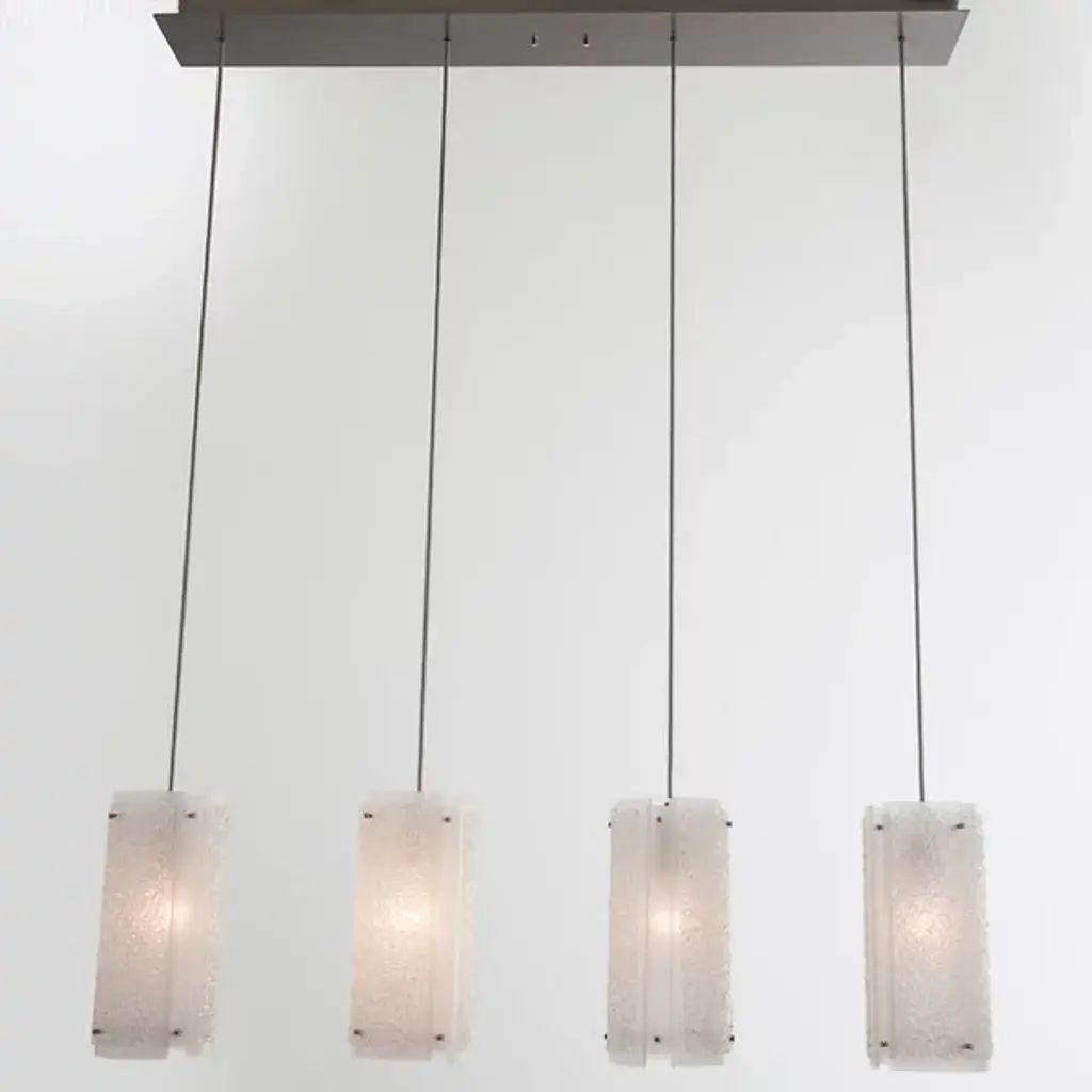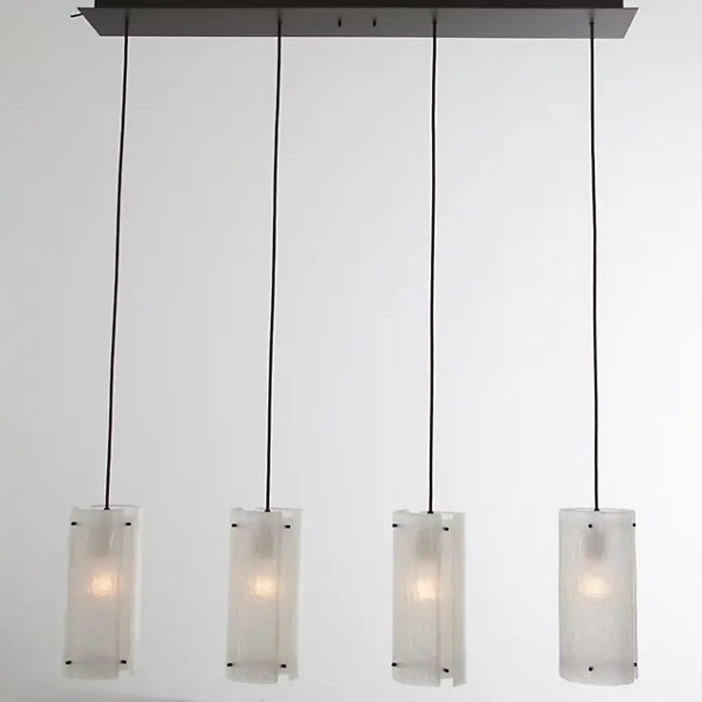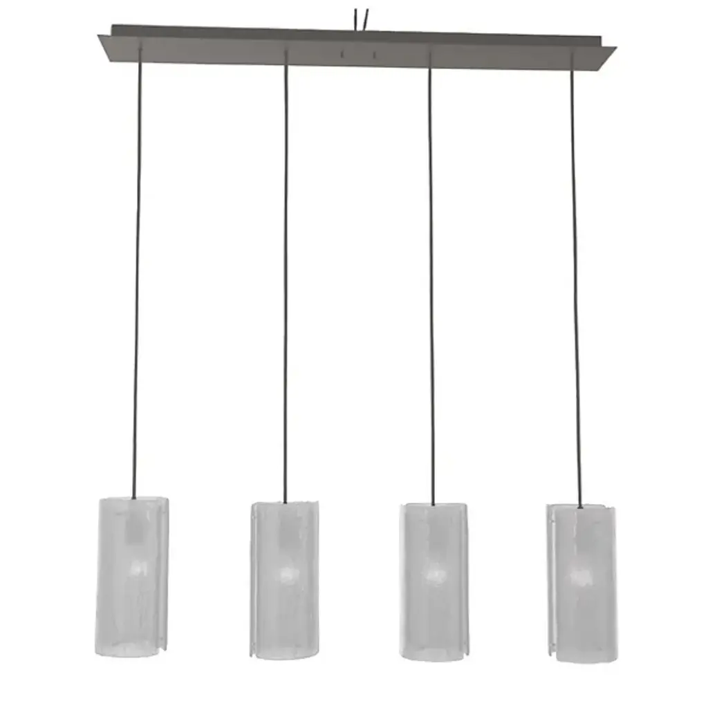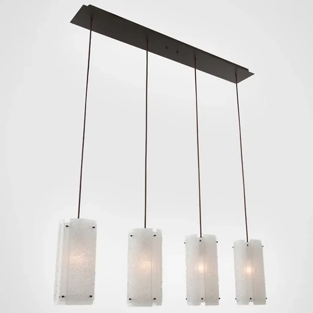 The Textured Glass Multi-Port Linear Suspension by Hammerton Studio makes a beautiful focal point in any setting. A sleek, rectangular canopy drops four cords to suspend a series of textural glass shades. Handcrafted by skilled artisans, the thin glass panels are curved and affixed to each other to create a cylindrical shape around an incandescent bulb. When illuminated, the fixture’s light dances through the glass and creates an enchanting and atmospheric display.