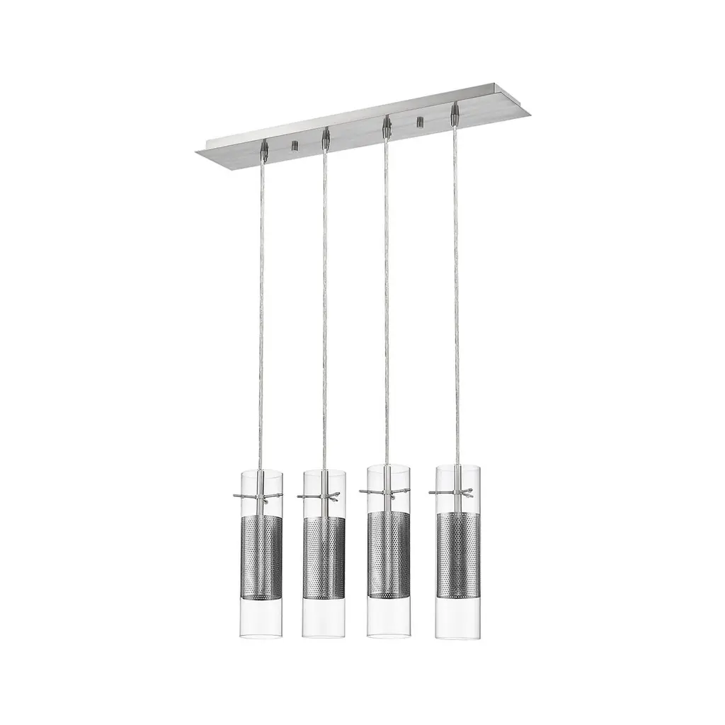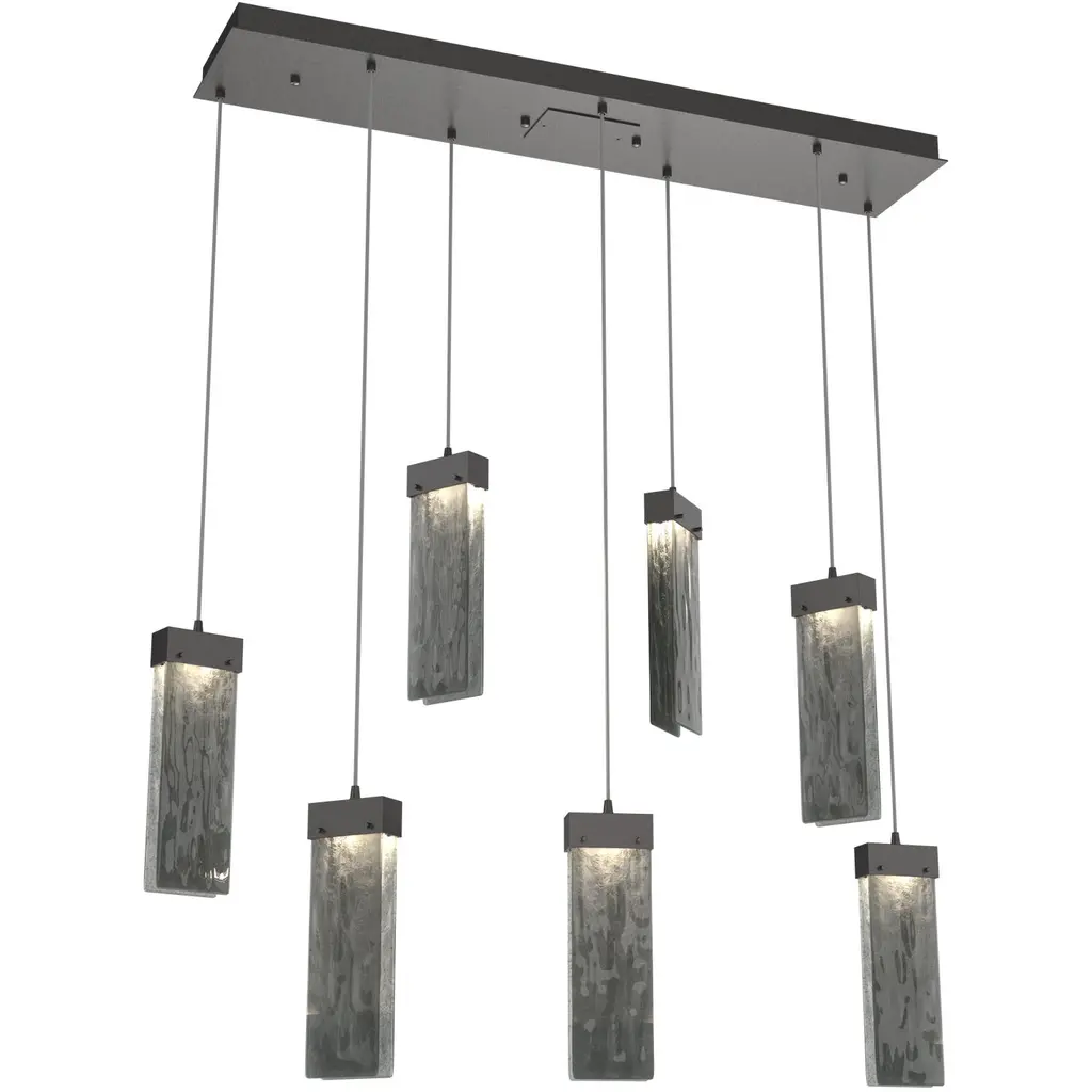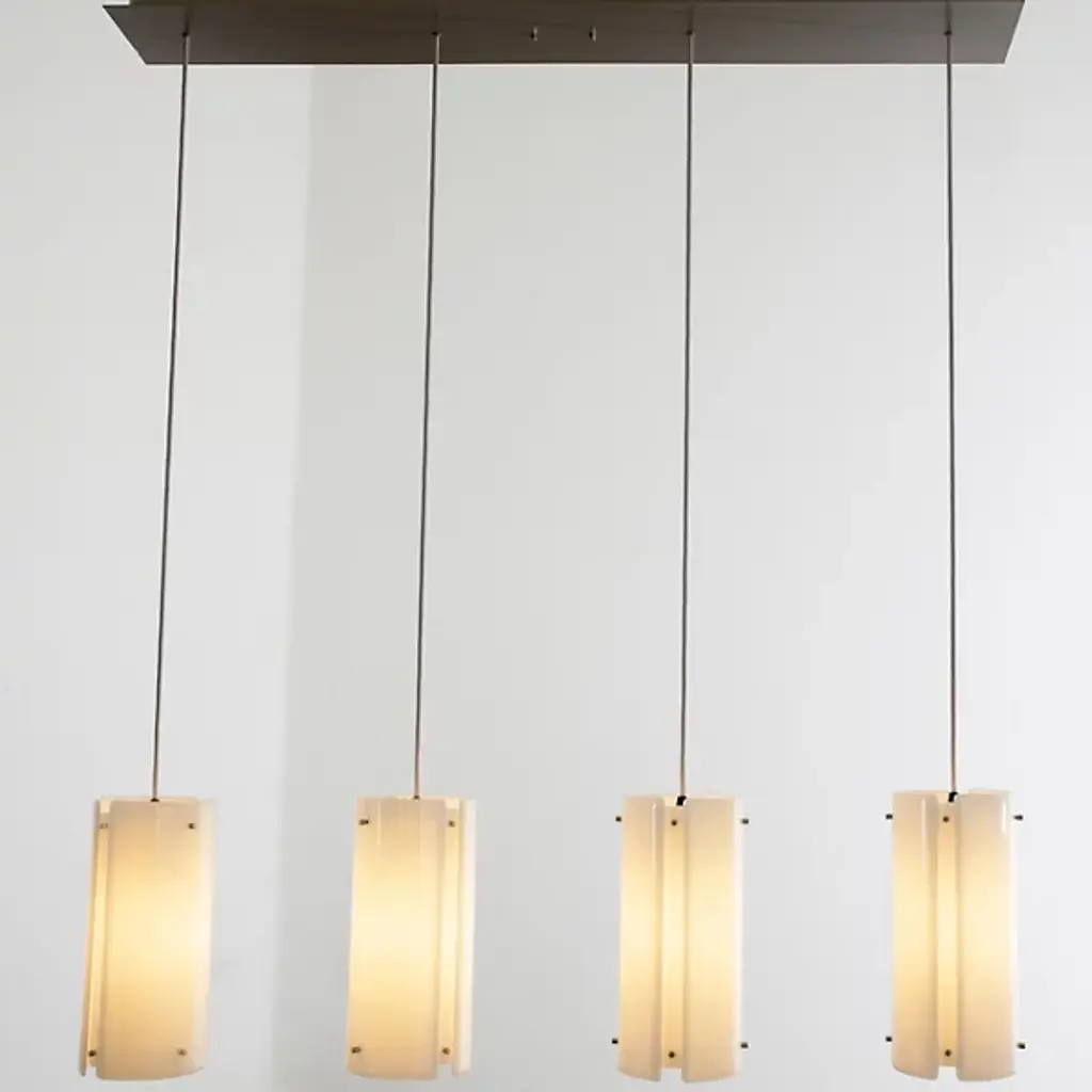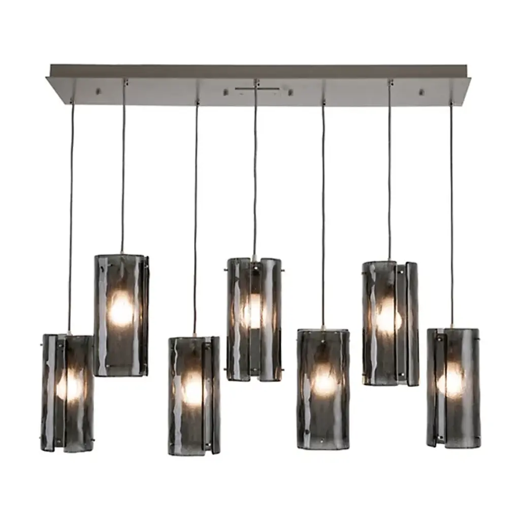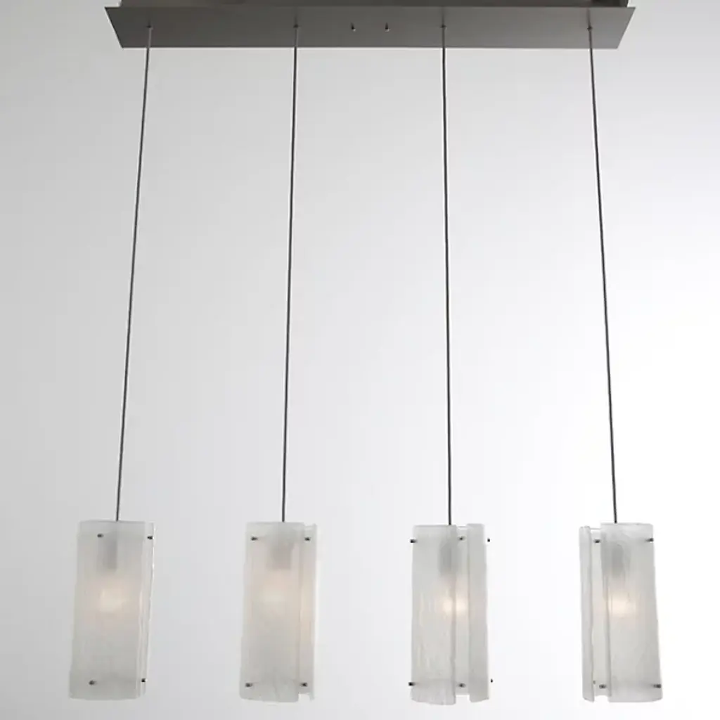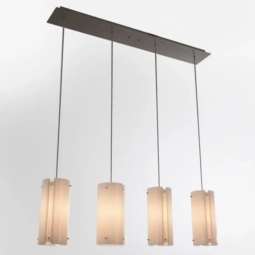 The Textured Glass Multi-Port Linear Suspension by Hammerton Studio makes a beautiful focal point in any setting. A sleek, rectangular canopy drops four cords to suspend a series of textural glass shades. Handcrafted by skilled artisans, the thin glass panels are curved and affixed to each other to create a cylindrical shape around an incandescent bulb. When illuminated, the fixture’s light dances through the glass and creates an enchanting and atmospheric display.