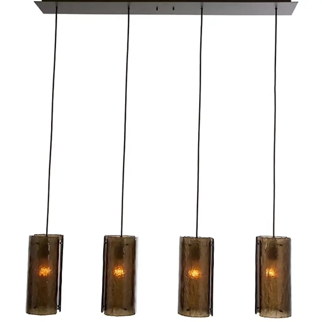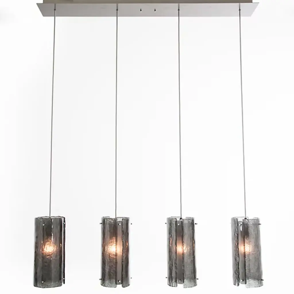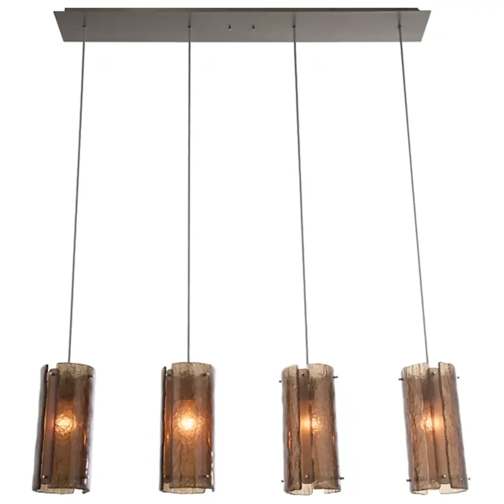 The Textured Glass Multi-Port Linear Suspension by Hammerton Studio makes a beautiful focal point in any setting. A sleek, rectangular canopy drops four cords to suspend a series of textural glass shades. Handcrafted by skilled artisans, the thin glass panels are curved and affixed to each other to create a cylindrical shape around an incandescent bulb. When illuminated, the fixture’s light dances through the glass and creates an enchanting and atmospheric display.