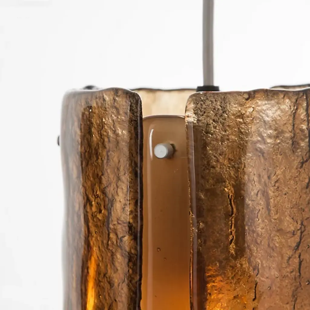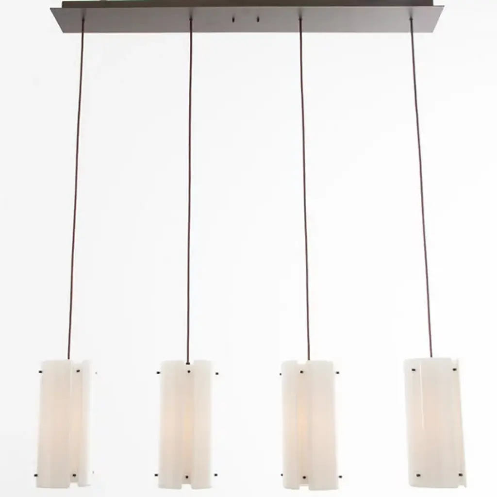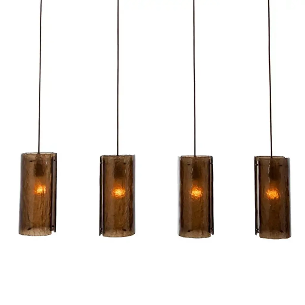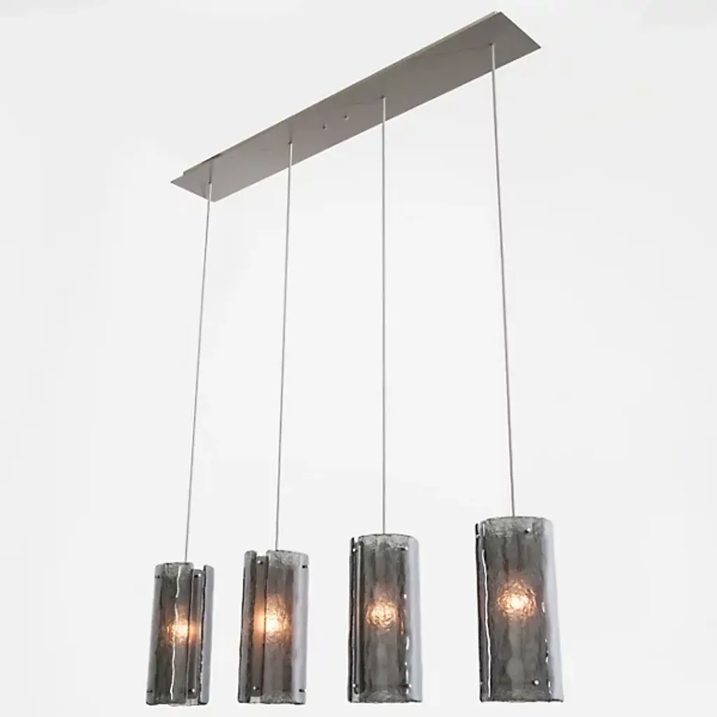 The Textured Glass Multi-Port Linear Suspension by Hammerton Studio makes a beautiful focal point in any setting. A sleek, rectangular canopy drops four cords to suspend a series of textural glass shades. Handcrafted by skilled artisans, the thin glass panels are curved and affixed to each other to create a cylindrical shape around an incandescent bulb. When illuminated, the fixture’s light dances through the glass and creates an enchanting and atmospheric display.
