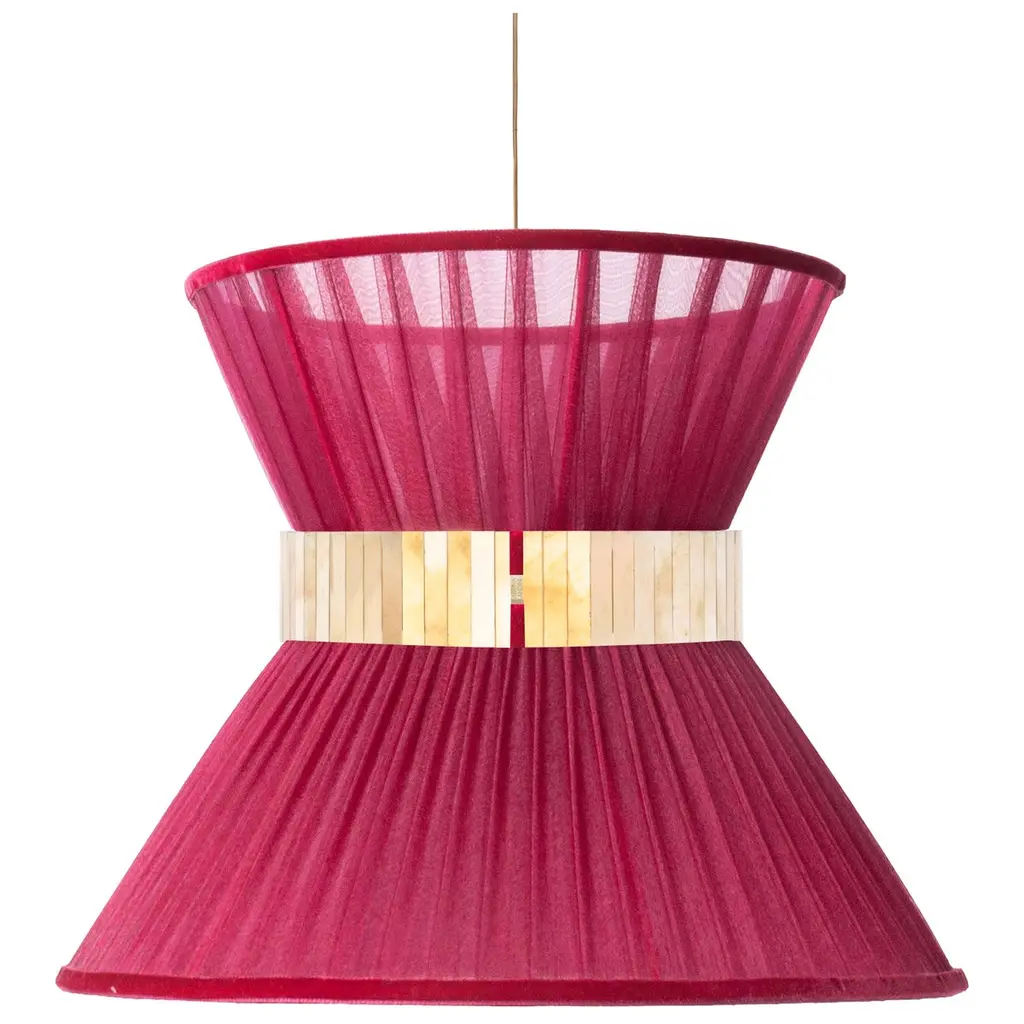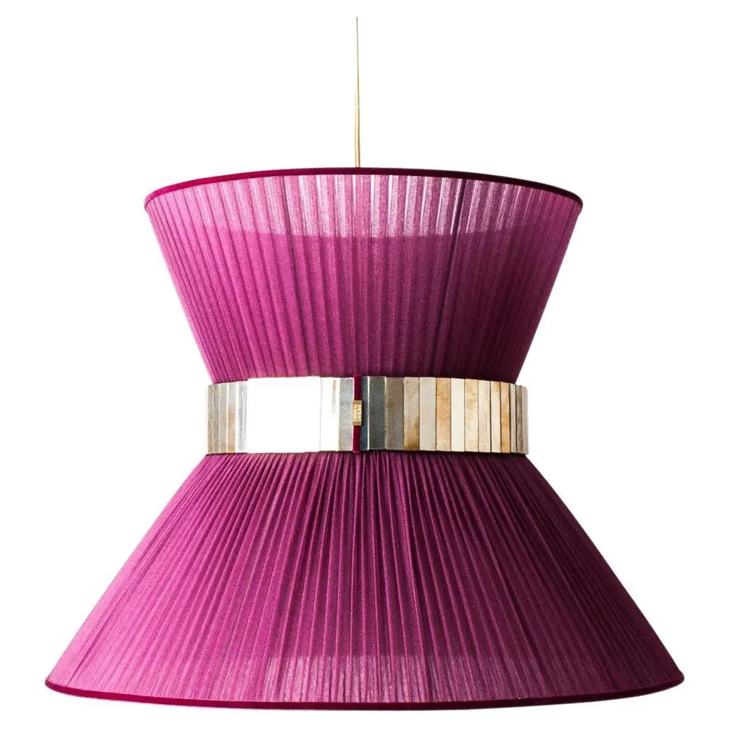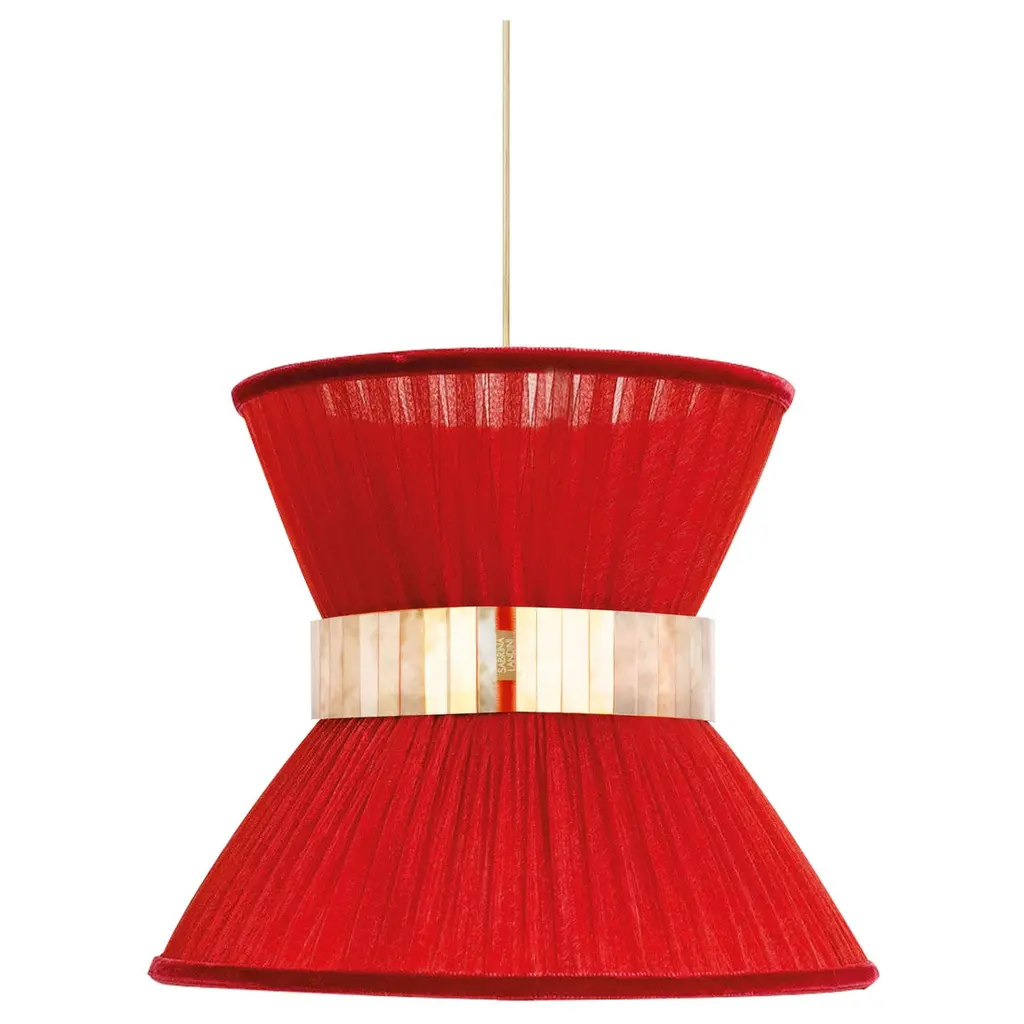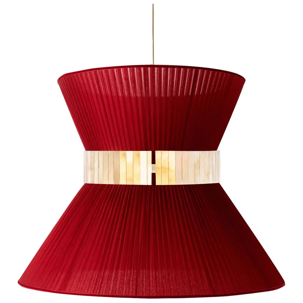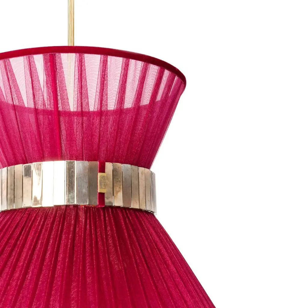 Tiffany Contemporary Hanging Lamp 30, Ruby Silk, Silvered Glass, Brass
