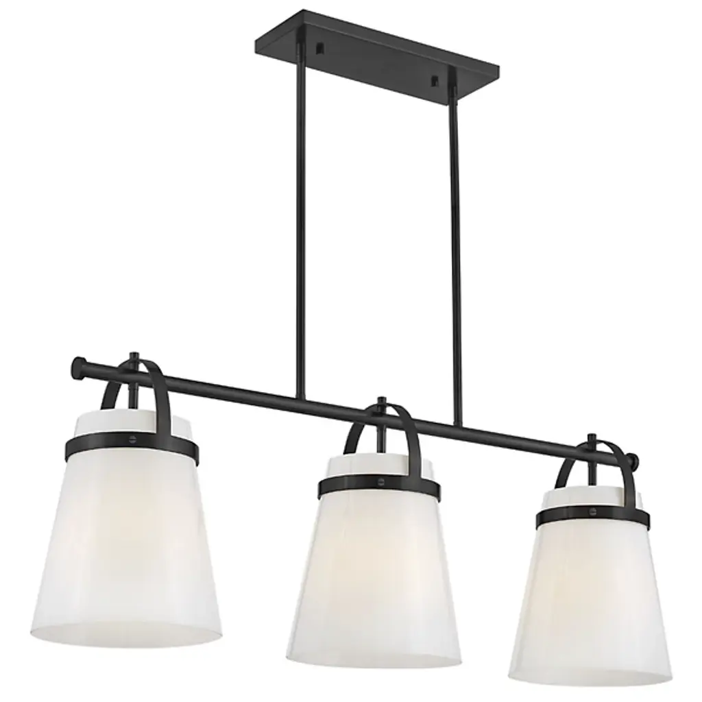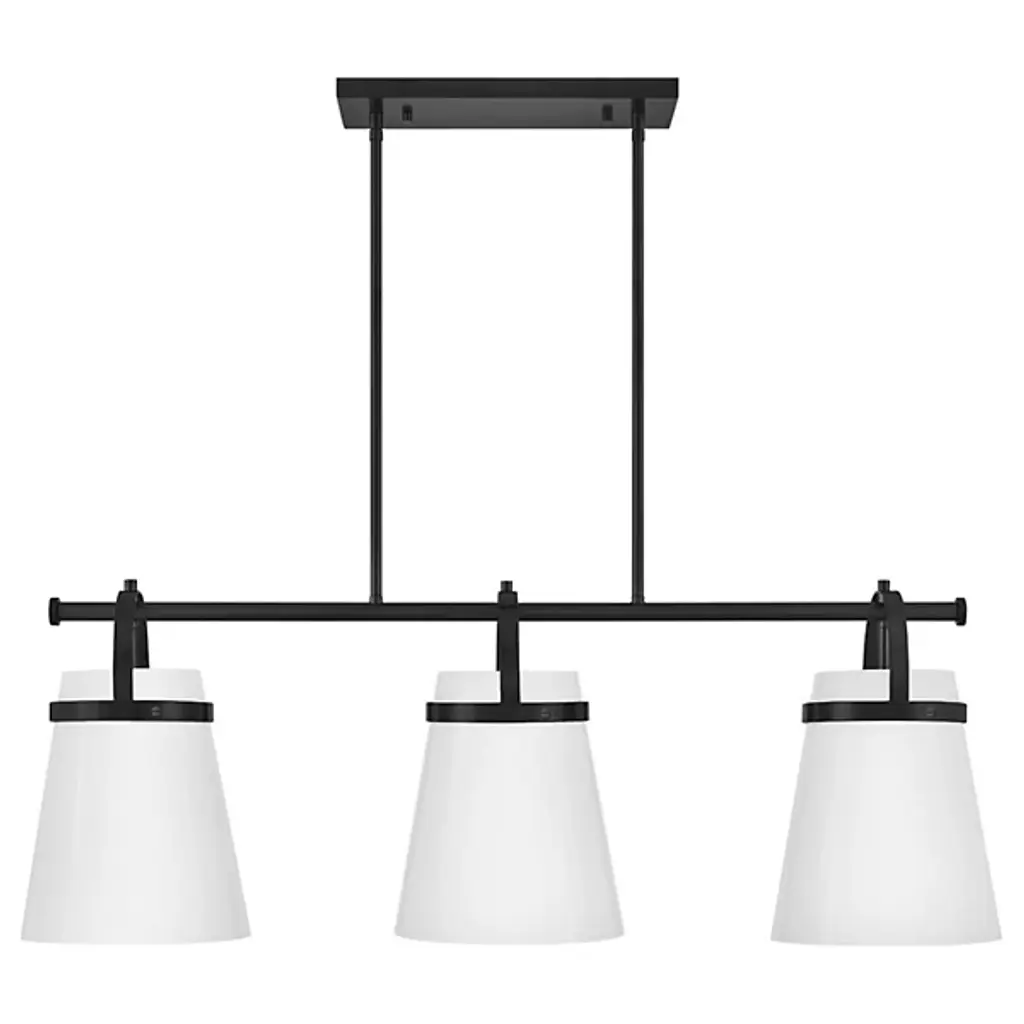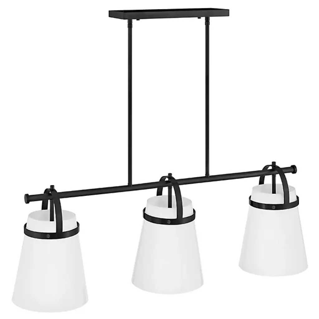The Tori Linear Suspension presents one’s kitchen or dining spaces with delightful containers brimming with cozy illumination. This transitional piece looks sharp in the room as it hangs with a series of tidy rods. The arching hardware of the shades top the crossbar in lovely accents. These accents catch the eyes against the pristine white hue of the shades. The tapered drum shades display a soft warmth on their surfaces. They filter and rain down an even stream of illumination.