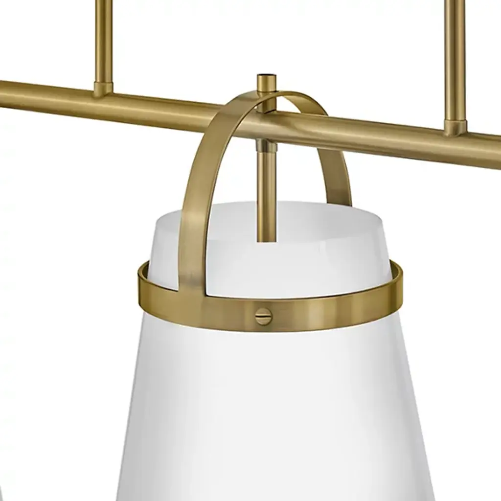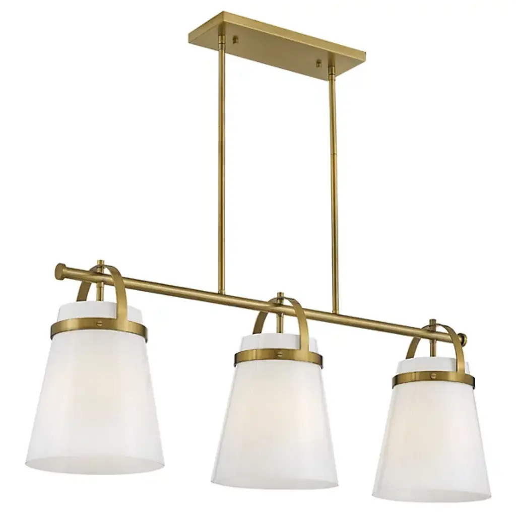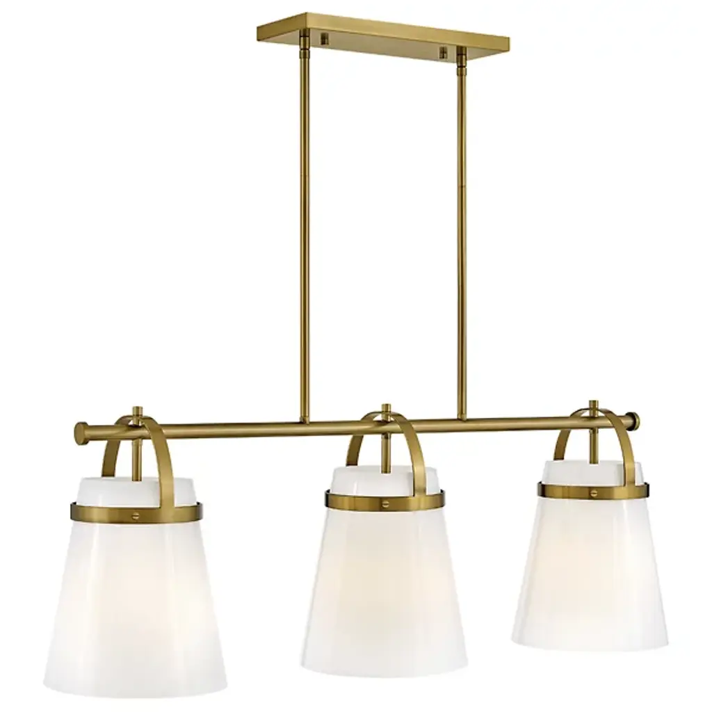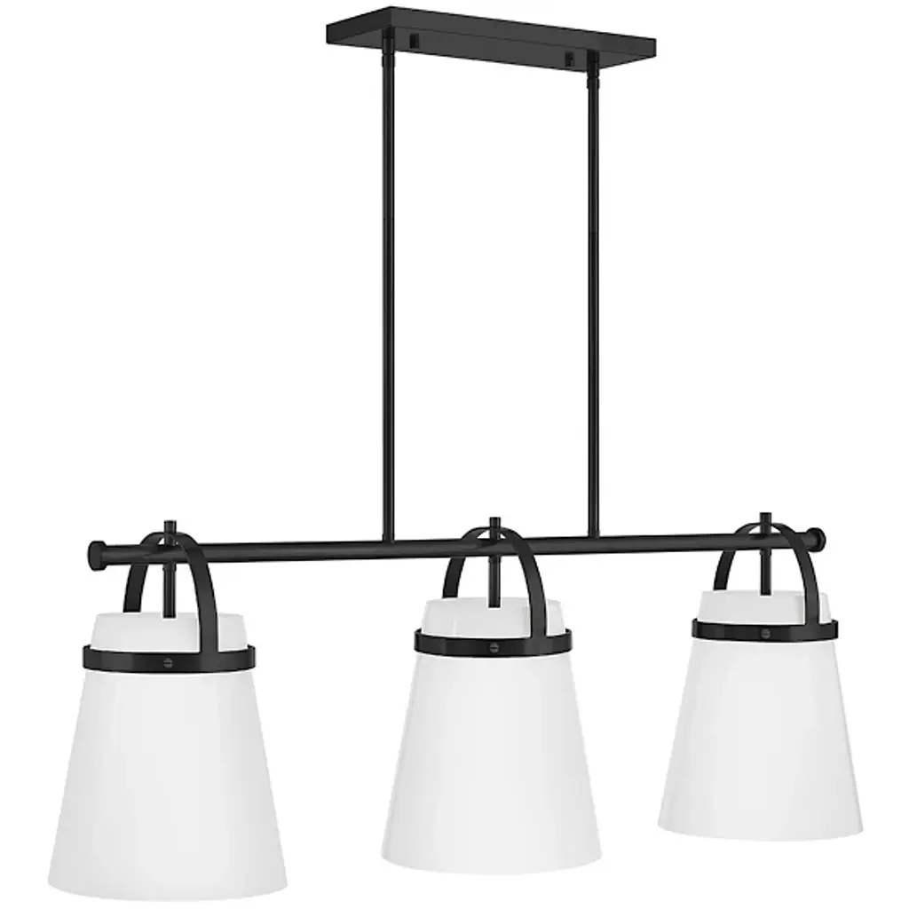 The Tori Linear Suspension presents one’s kitchen or dining spaces with delightful containers brimming with cozy illumination. This transitional piece looks sharp in the room as it hangs with a series of tidy rods. The arching hardware of the shades top the crossbar in lovely accents. These accents catch the eyes against the pristine white hue of the shades. The tapered drum shades display a soft warmth on their surfaces. They filter and rain down an even stream of illumination.