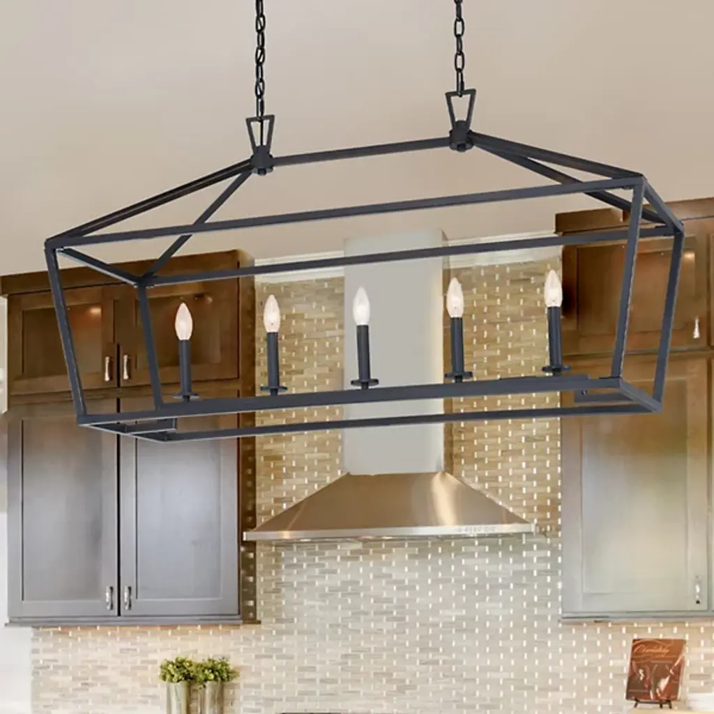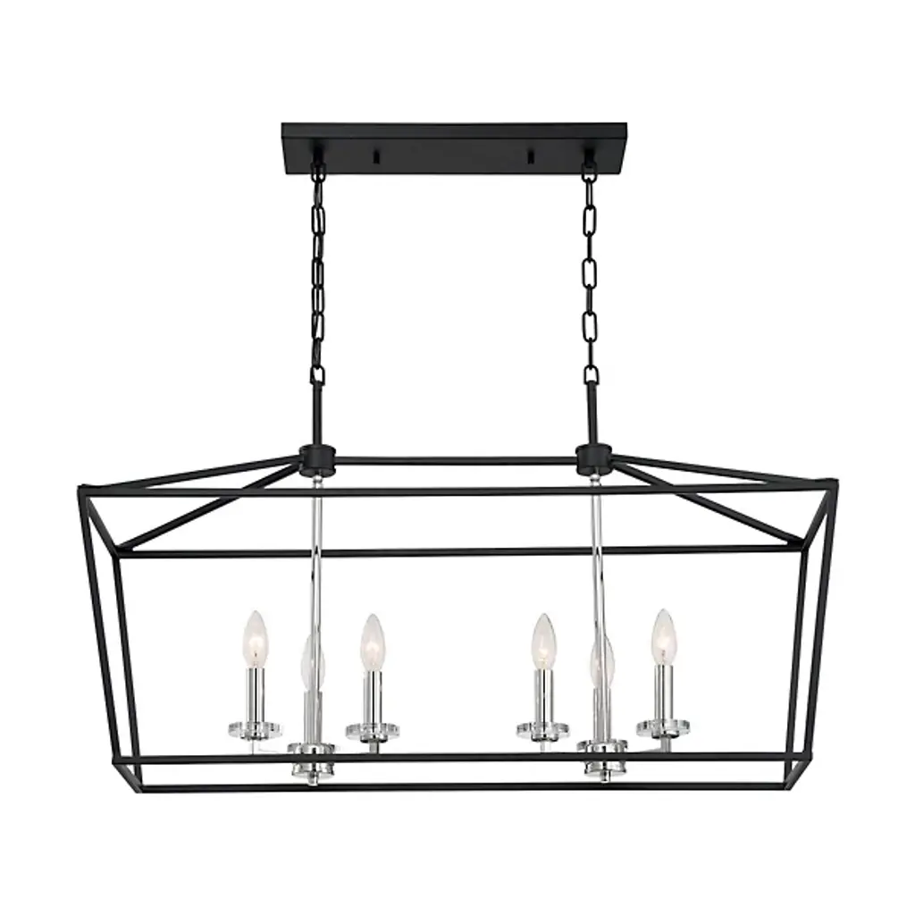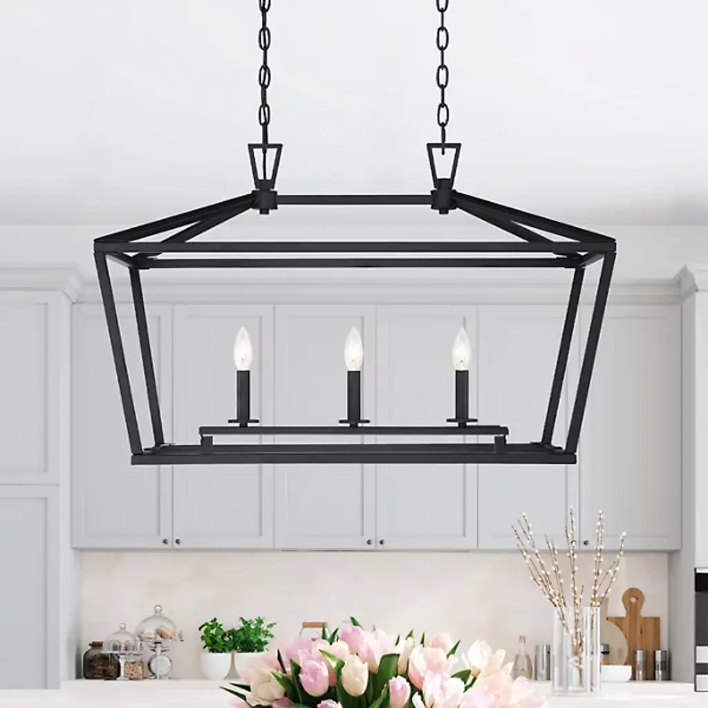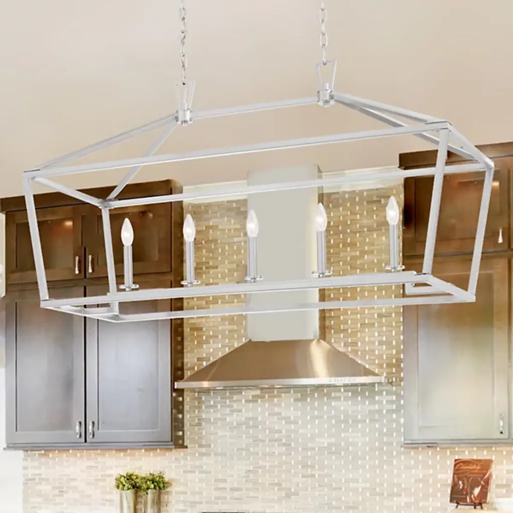 A welcoming, well-lit kitchen or dining area. The Townsend Linear Suspension by Savoy House juxtaposes the clean lines of contemporary design with traditional charm. Inspired by the classic lantern, its open trestle shade done in a timeless metal finish offers a familiar yet fresh look. With candelabra bulb sockets, a rectangular canopy and suspension chains, this transitional ceiling fixtures makes an impact as it provides ambient and task light above harvest tables or center islands.