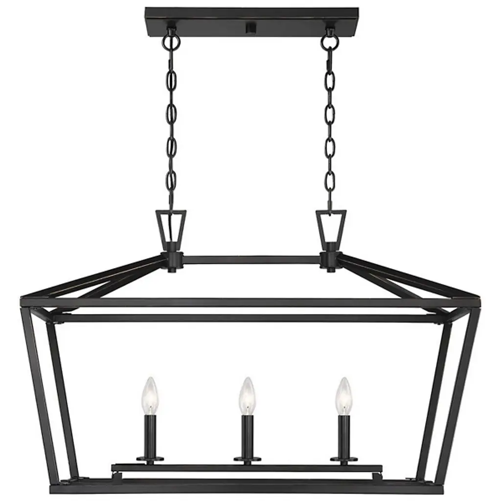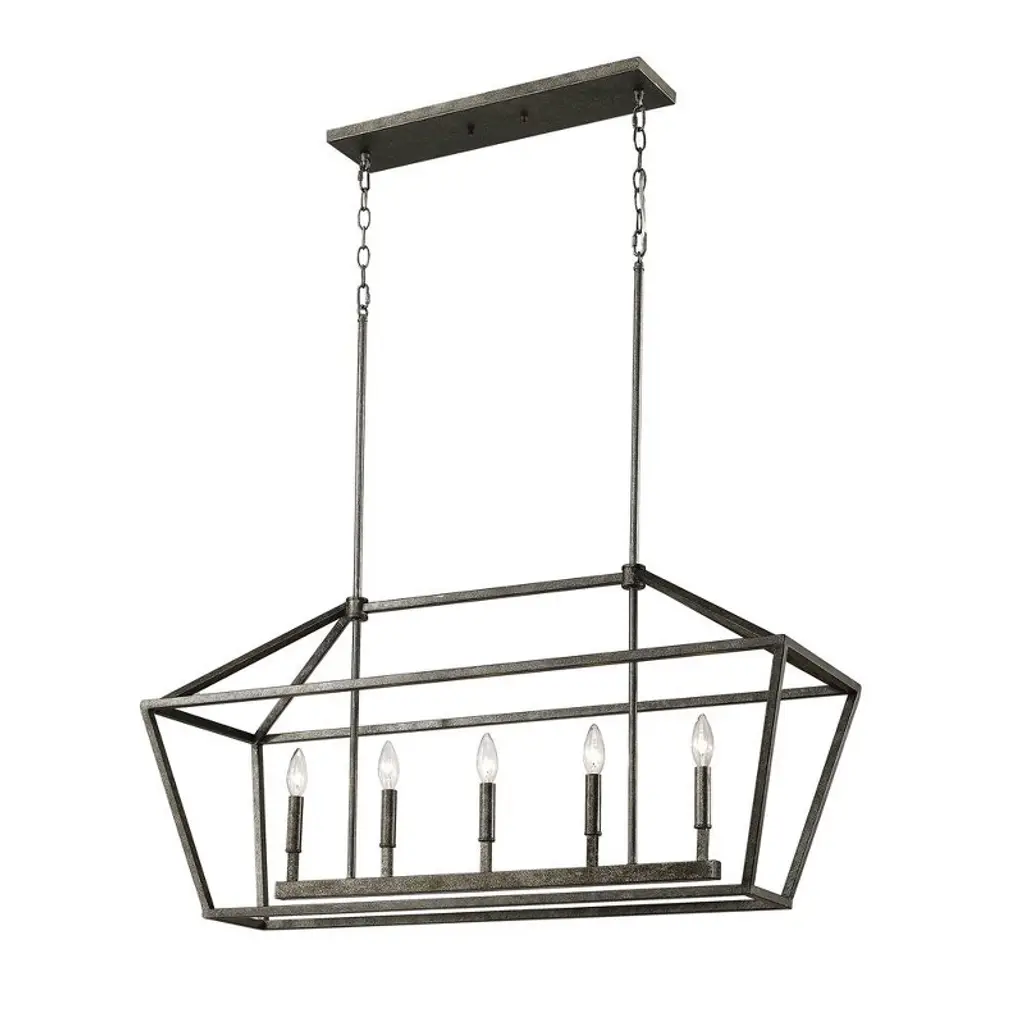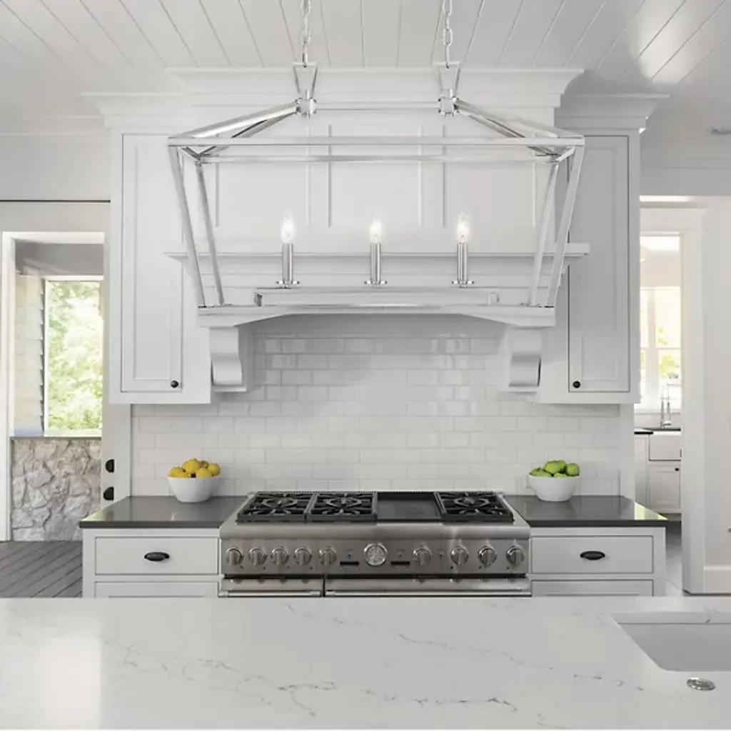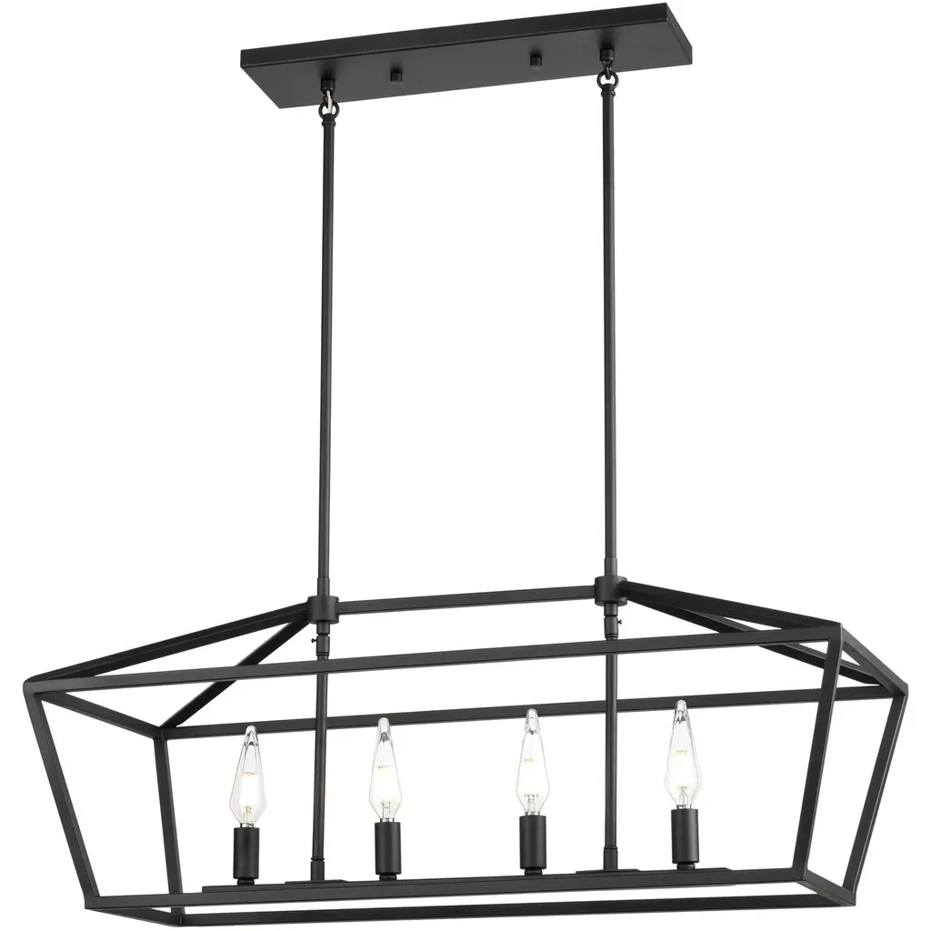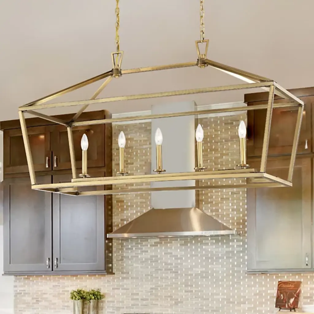 A welcoming, well-lit kitchen or dining area. The Townsend Linear Suspension by Savoy House juxtaposes the clean lines of contemporary design with traditional charm. Inspired by the classic lantern, its open trestle shade done in a timeless metal finish offers a familiar yet fresh look. With candelabra bulb sockets, a rectangular canopy and suspension chains, this transitional ceiling fixtures makes an impact as it provides ambient and task light above harvest tables or center islands.