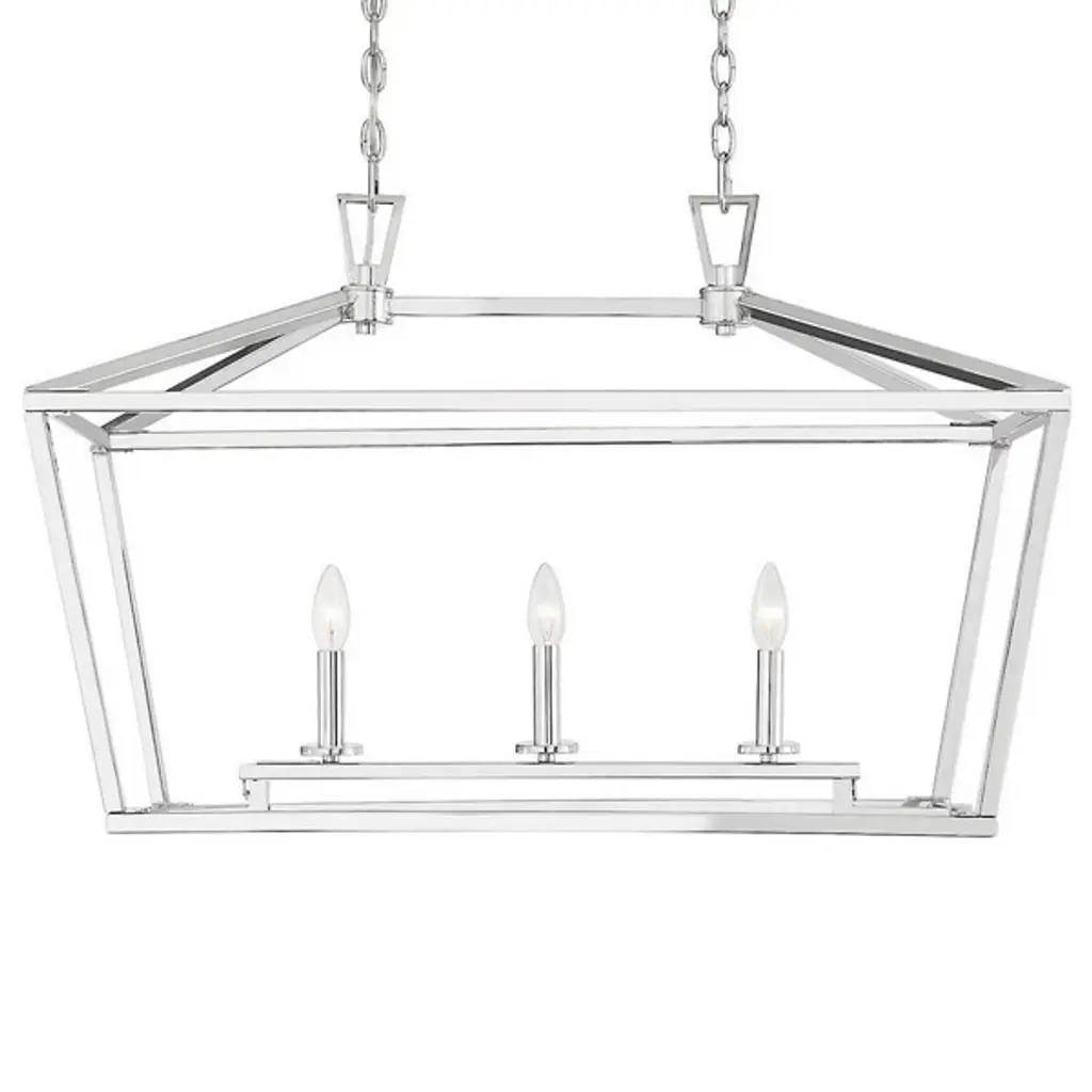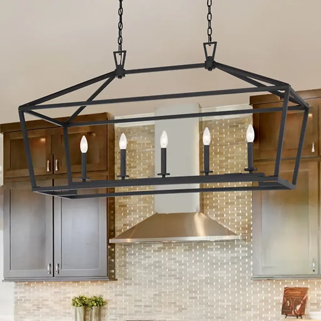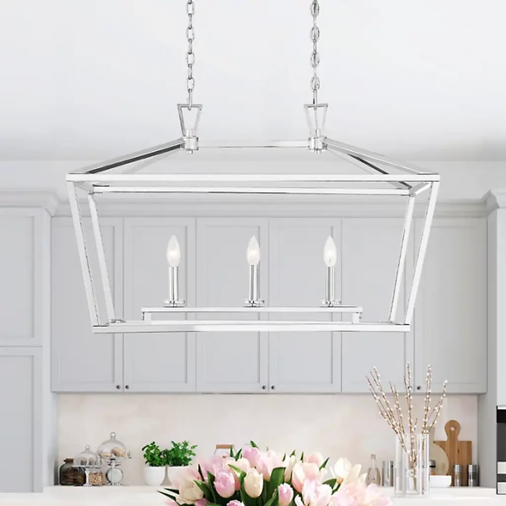 A welcoming, well-lit kitchen or dining area. The Townsend Linear Suspension by Savoy House juxtaposes the clean lines of contemporary design with traditional charm. Inspired by the classic lantern, its open trestle shade done in a timeless metal finish offers a familiar yet fresh look. With candelabra bulb sockets, a rectangular canopy and suspension chains, this transitional ceiling fixtures makes an impact as it provides ambient and task light above harvest tables or center islands.