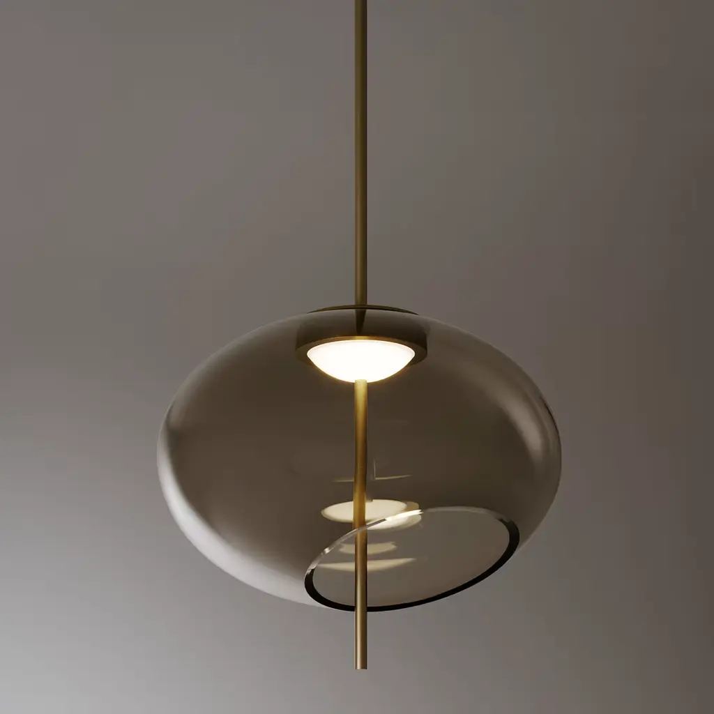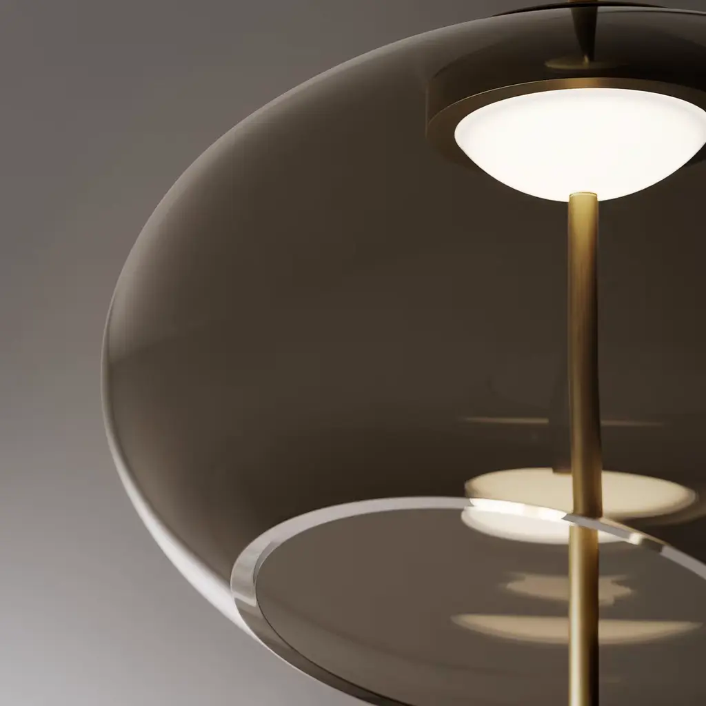Irregular asymmetrically cut blown glass spheres float in space, forming alternating patterns of light and shadow. The light-burnished brass rod supporting the dove-colored glass diffusers balances the material's weight, making the Trou Suspension lamp a delicate and ethereal light source.