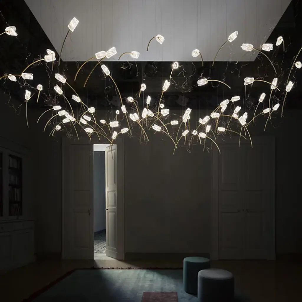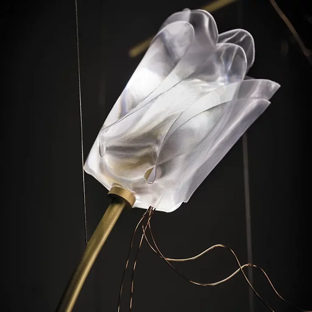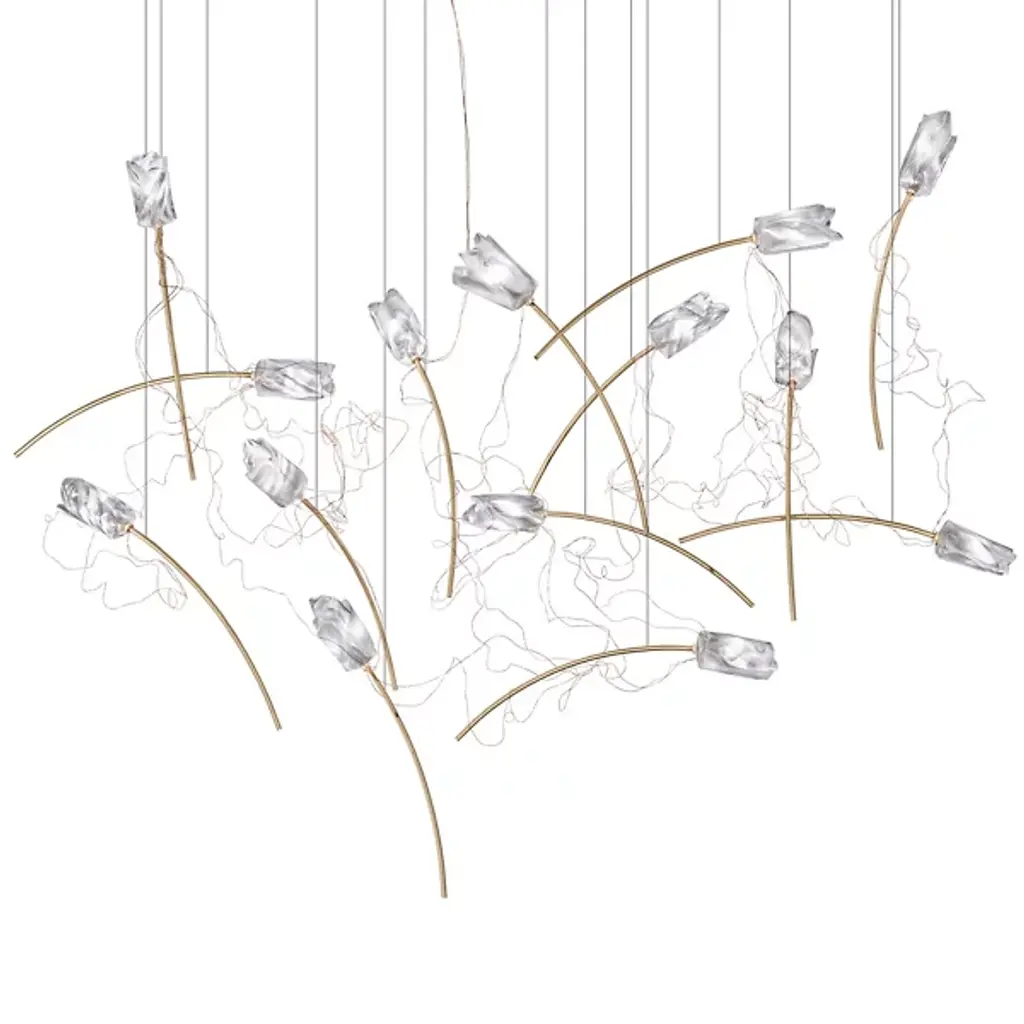 The Tulip Freestanding Linear Suspension from Slamp presents a stately, stylish appeal ideal for contemporary environments. A stepped rectangular canopy in smooth aluminum, it uses a series of slender wires to suspend curving metal “Branches” in all directions for a luxurious interpretation of natural forms, joined by a curving assembly of thin copper wires that convey power with low voltage transfer. Each swooping arm ends in an LED lamp beneath a clear glass shade that has been hand-folded into a stylized tulip form, scattering a glittering glow in all directions that burnishes the smooth metalwork.