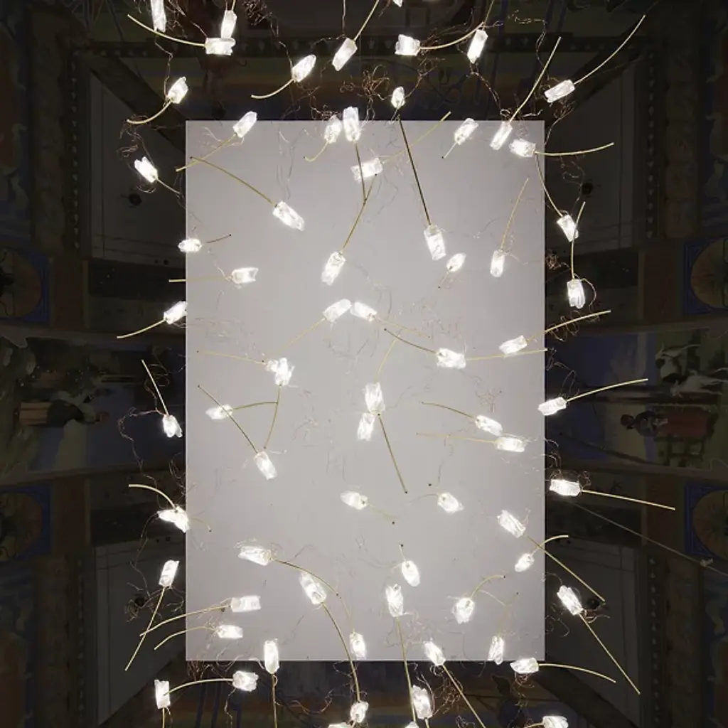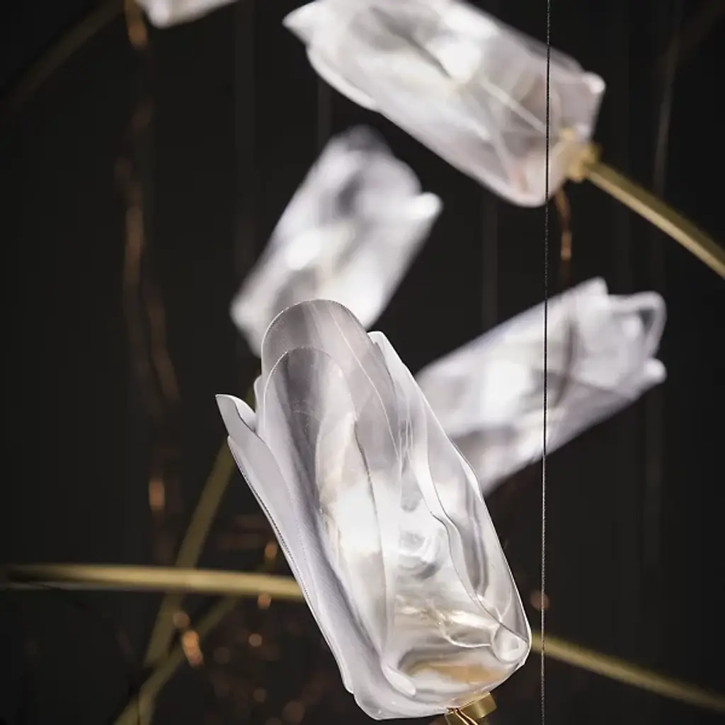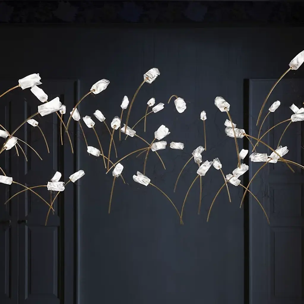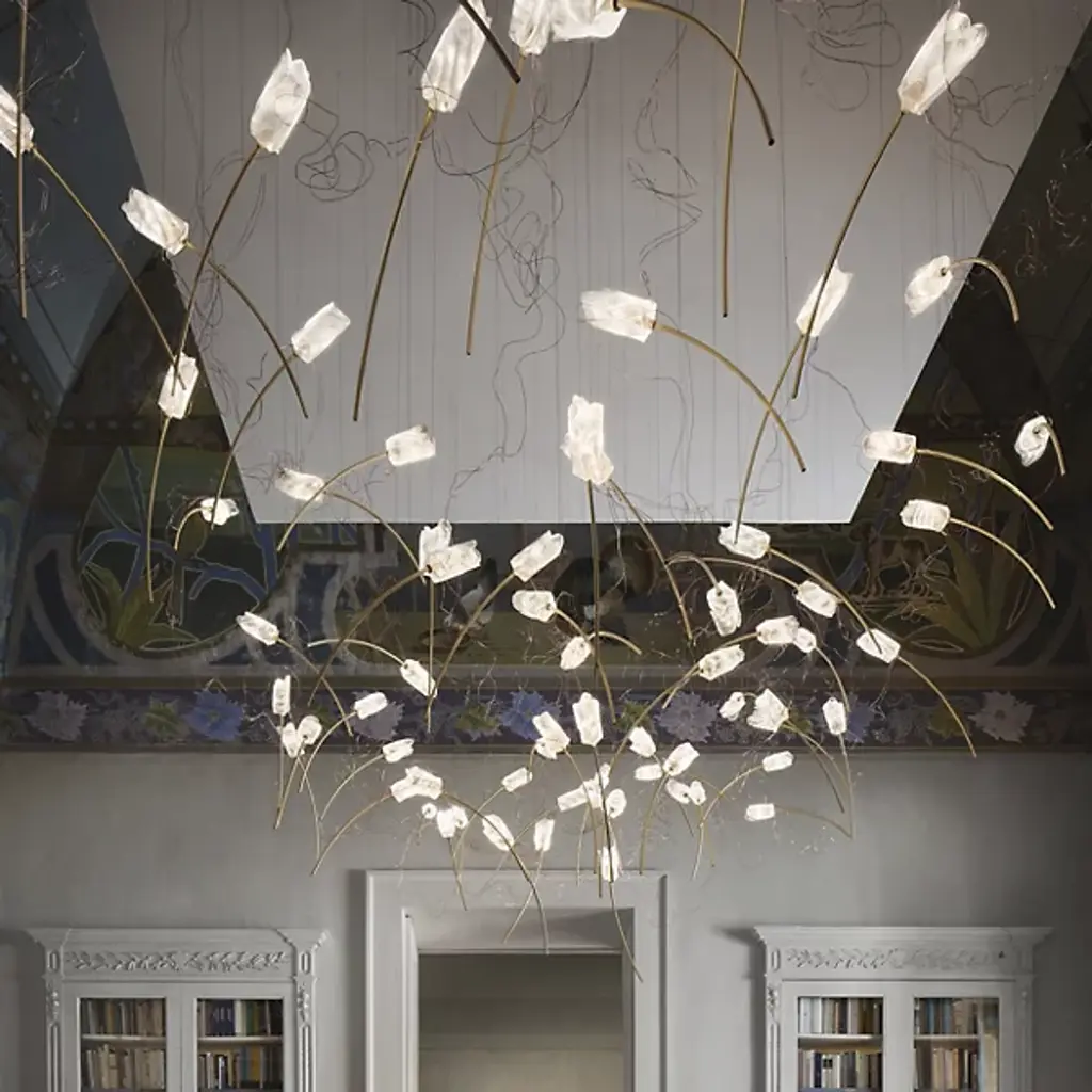 The Tulip Freestanding Linear Suspension from Slamp presents a stately, stylish appeal ideal for contemporary environments. A stepped rectangular canopy in smooth aluminum, it uses a series of slender wires to suspend curving metal “Branches” in all directions for a luxurious interpretation of natural forms, joined by a curving assembly of thin copper wires that convey power with low voltage transfer. Each swooping arm ends in an LED lamp beneath a clear glass shade that has been hand-folded into a stylized tulip form, scattering a glittering glow in all directions that burnishes the smooth metalwork.