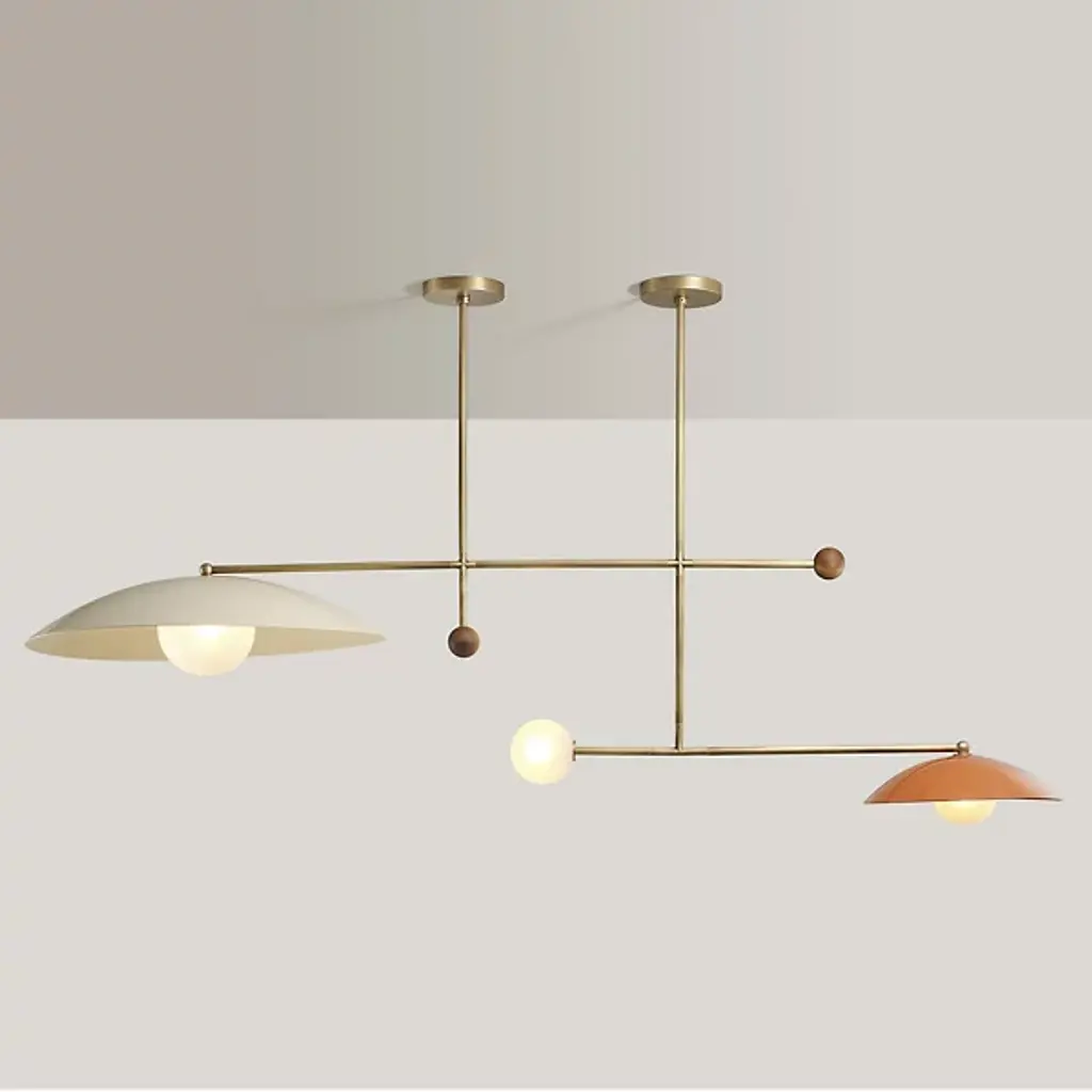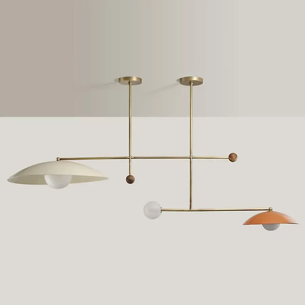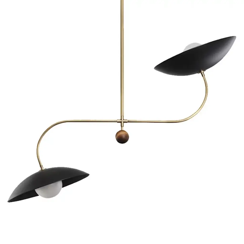 The Verso Linear Suspension from Blueprint Lighting combines mid-century modern charm and transitional style. It is composed of aluminum and brass and characterized by an exploration of geometric shapes, as championed by designer Giner Curtis. This piece is secured by ceiling canopies, allowing downrods to suspend vertically in midair before intersecting with a horizontal framework with a bowl-like hand-blown shade of glass at its end. The motif is repeated as a second hand-blown glass shade is situated below the first, facing the opposite direction. The result is a brilliant display of LED light. Walnut finials add a final touch of character to this USA-made light fixture.
