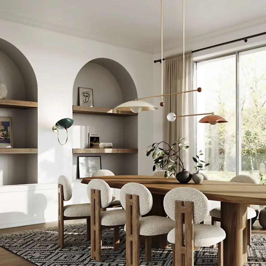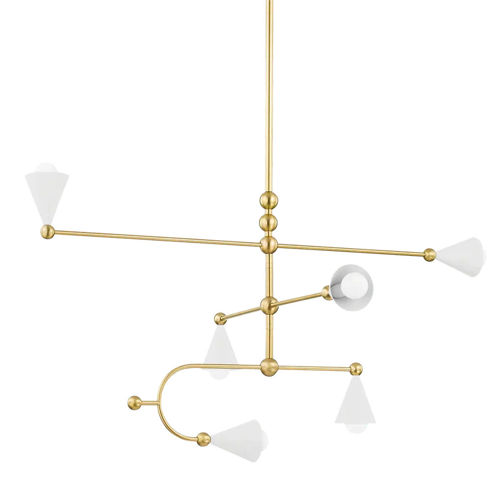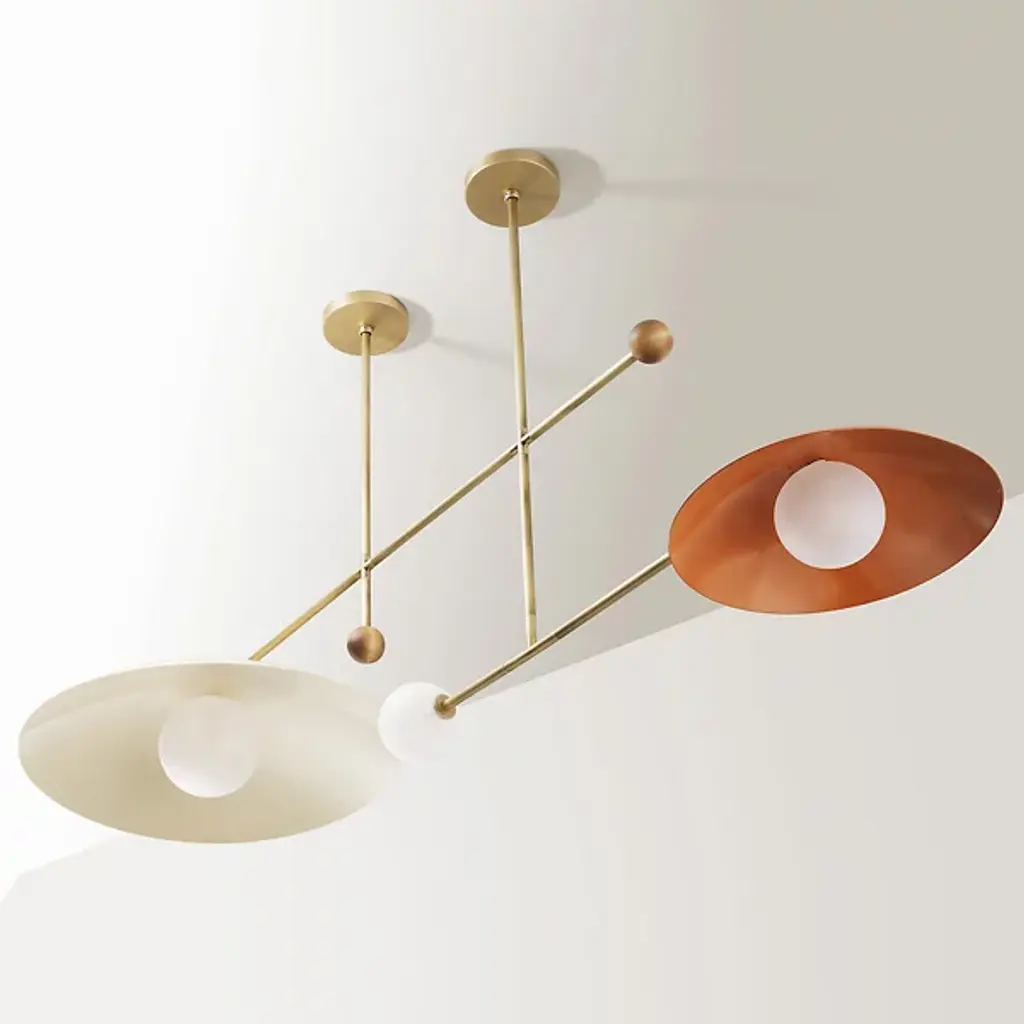 The Verso Linear Suspension from Blueprint Lighting combines mid-century modern charm and transitional style. It is composed of aluminum and brass and characterized by an exploration of geometric shapes, as championed by designer Giner Curtis. This piece is secured by ceiling canopies, allowing downrods to suspend vertically in midair before intersecting with a horizontal framework with a bowl-like hand-blown shade of glass at its end. The motif is repeated as a second hand-blown glass shade is situated below the first, facing the opposite direction. The result is a brilliant display of LED light. Walnut finials add a final touch of character to this USA-made light fixture.