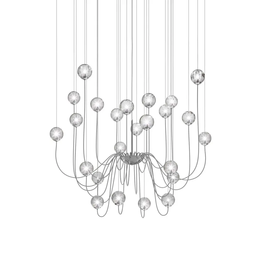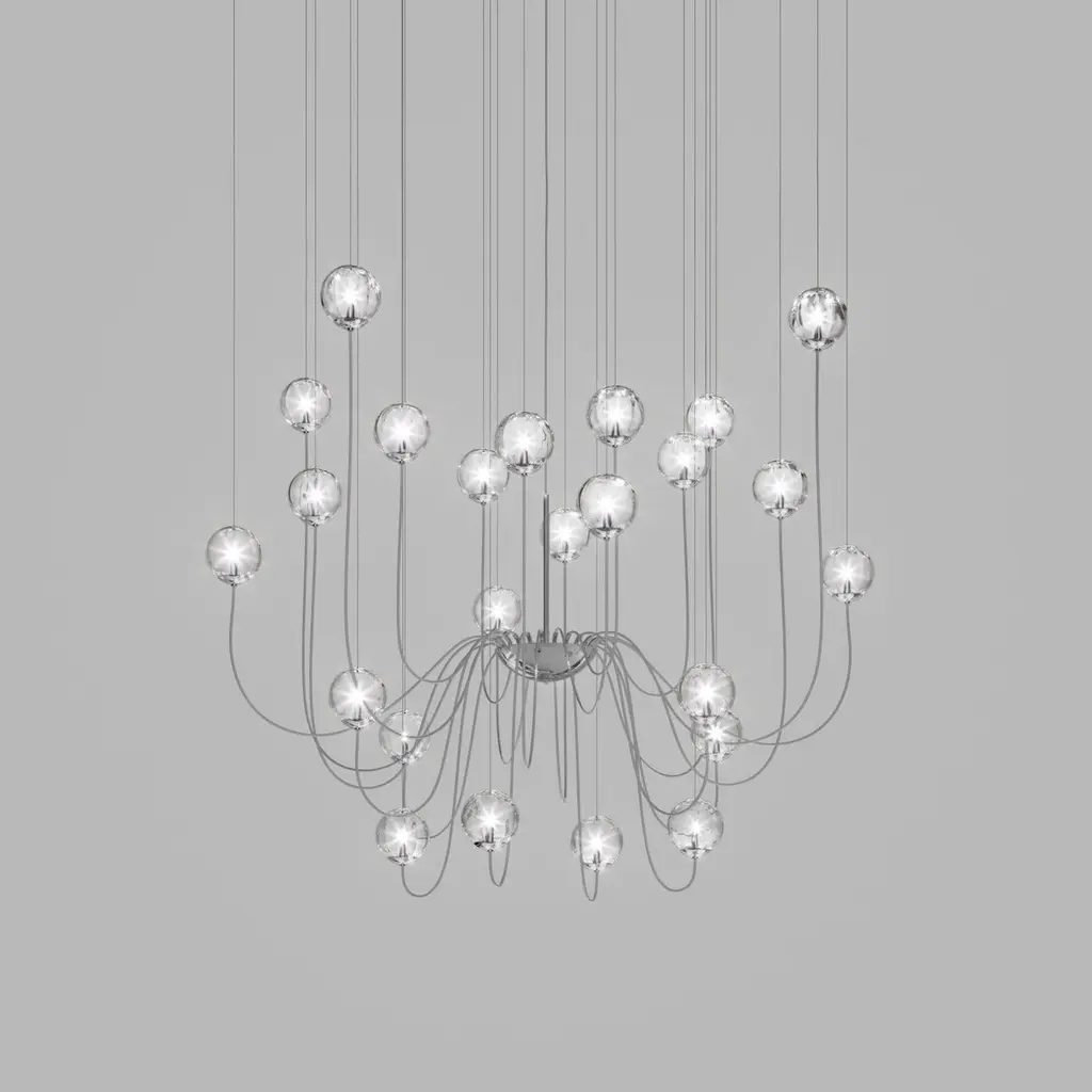 Collection of lamps with blown glass diffuser with an original irregularly lined ‘dégradé’ finish. The arms of the chandelier are hung individually to customer demand.Specifications:Light source: G9No of bulbs: 2×60W G9Dimmer: DIM 1Frame finish: Glossy chromeCable length maximum: 120 cm.