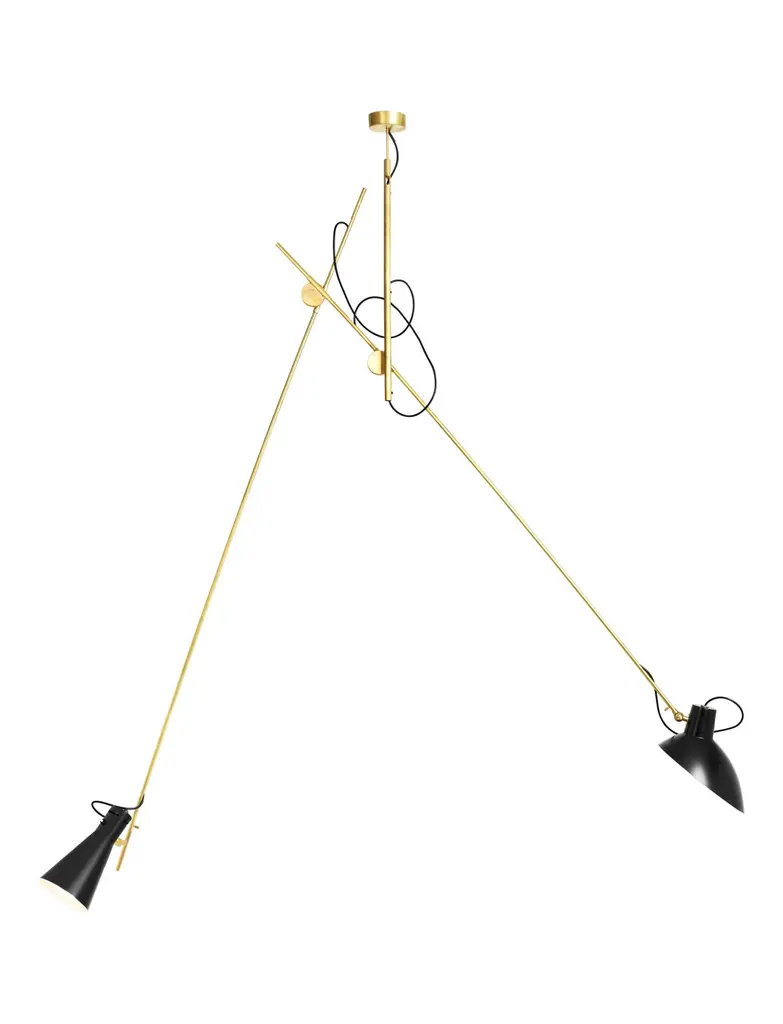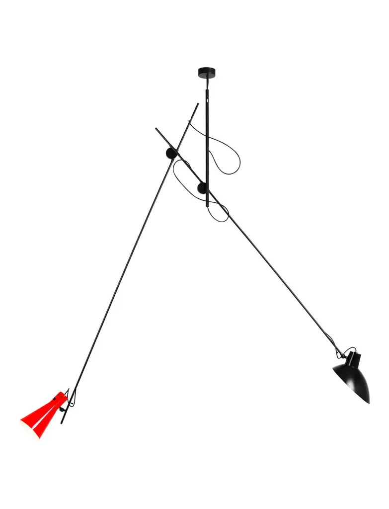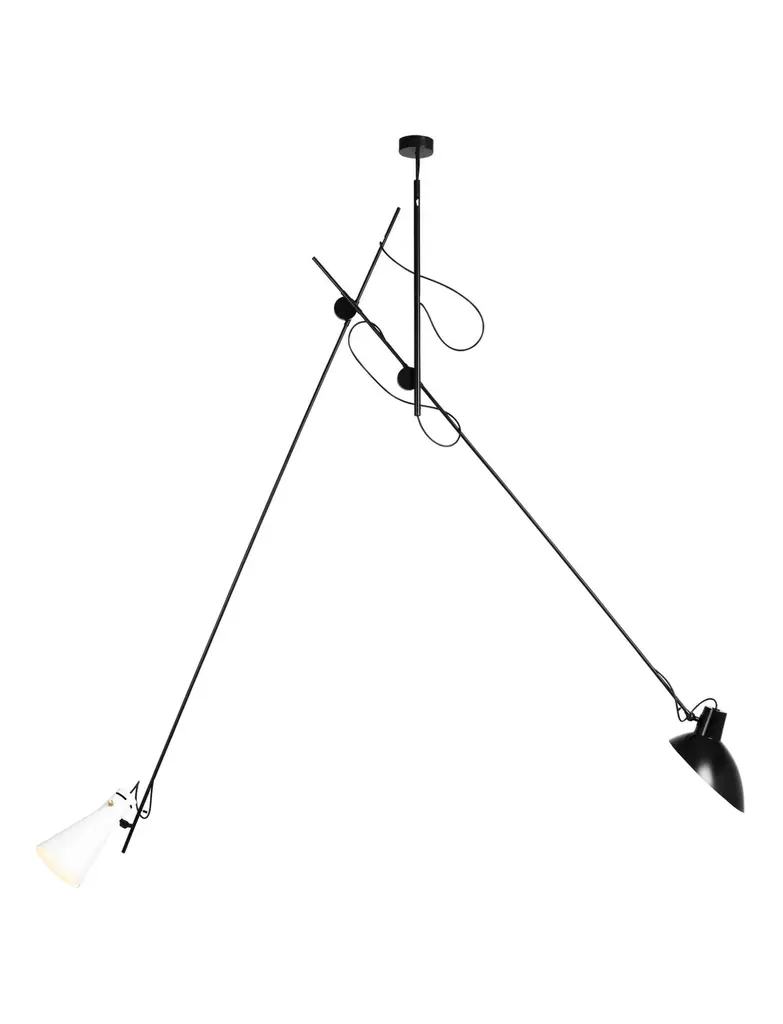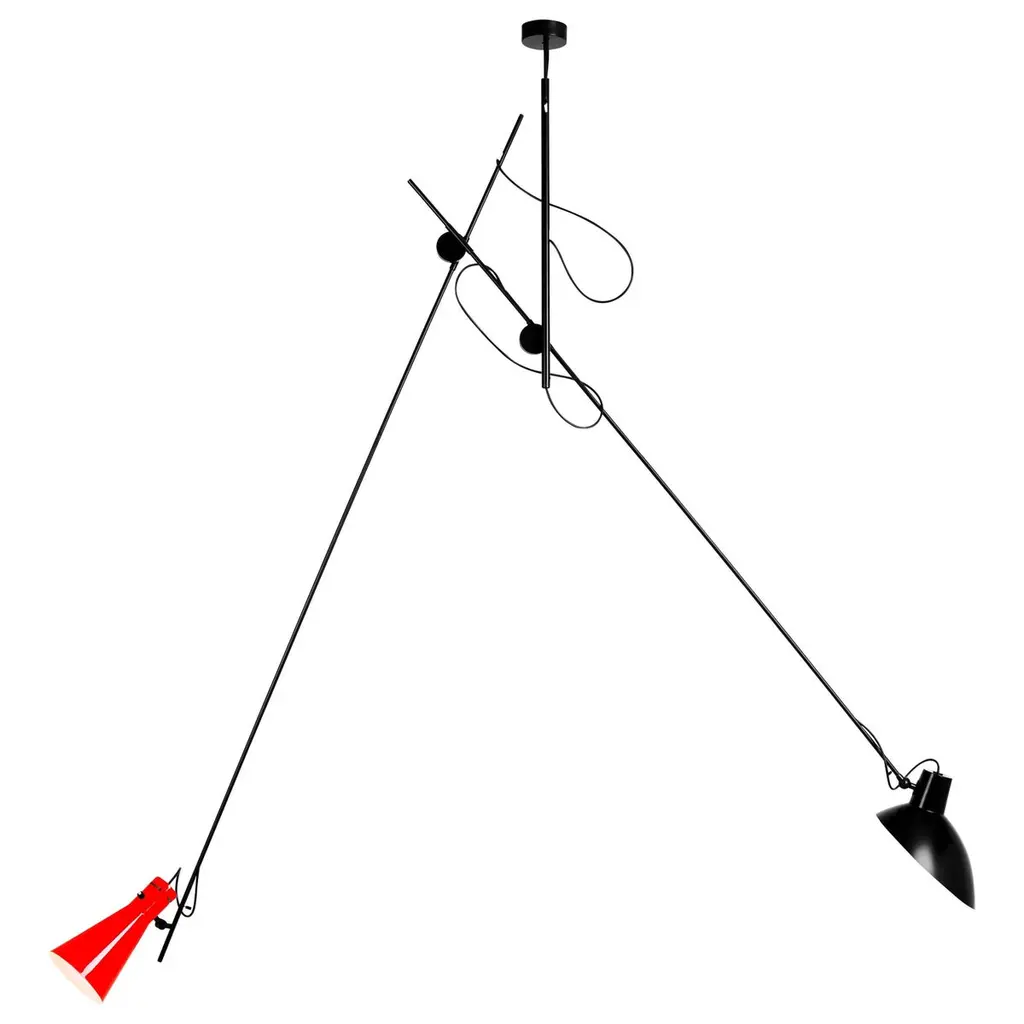Vittoriano Viganò 'VV Cinquanta' suspension lamp in black for Astep. Viganò was the art director of Arteluce, the company founded by his creative partner Gino Sarfatti, and the visor was one of his most celebrated design series. Designed in 1951 by Vigano, this is a professionally rewired authorized re-edition by Alessandro Sarfatti, grandson of Gino Sarfatti, who applies his grandfather's scrupulous attention to detail and materials to offer a tightly curated selection of iconic lighting originally produced by Arteluce.Executed in black enameled spun aluminum with black steel frame, this suspension lamp features a distinctive Dual-stemmed construction with two uniquely shaped reflectors, one narrow and one wide, that can be adjusted to many different positions, enabling a wide variety of both downward and upward lighting. A sculptural design with easy versatility. Price is per item. Available to order in unlimited quantities Also available in red/black, white/black, black/brass, black/white/brass and a special Mondrian edition in yellow/blue/black/red. This listing is for the 'VV Cinquanta' lamp in all black.In-stock lead time 1-2 weeks. Out of stock can add up to 10 weeks or more. Lead time and inventory availability is subject to change at anytime and without notice. Please contact us for current lead times prior to placing time sensitive orders.Accommodates 2x medium base E26 LED bulbs with a maximum of 53 Watt Equivalent each (bulbs not included). Recommended Tala bulbs available separately, please inquire. Not UL listed, but recommended UL listing possible from authorized 3rd party vendor for an additional cost. Please contact us for details.Made to order.All sales final.