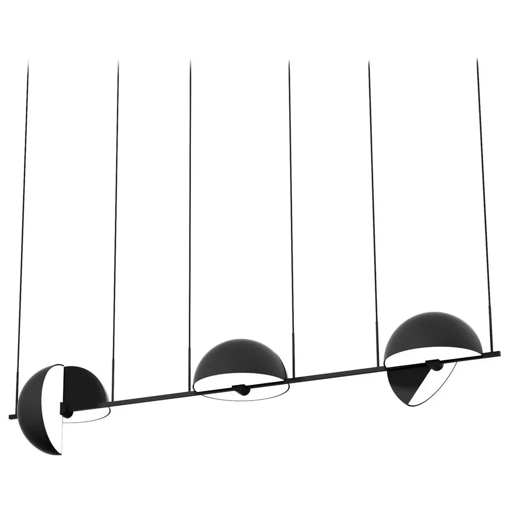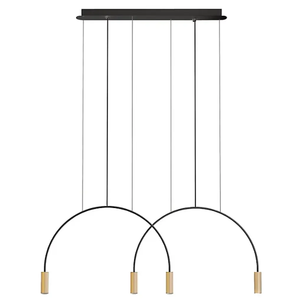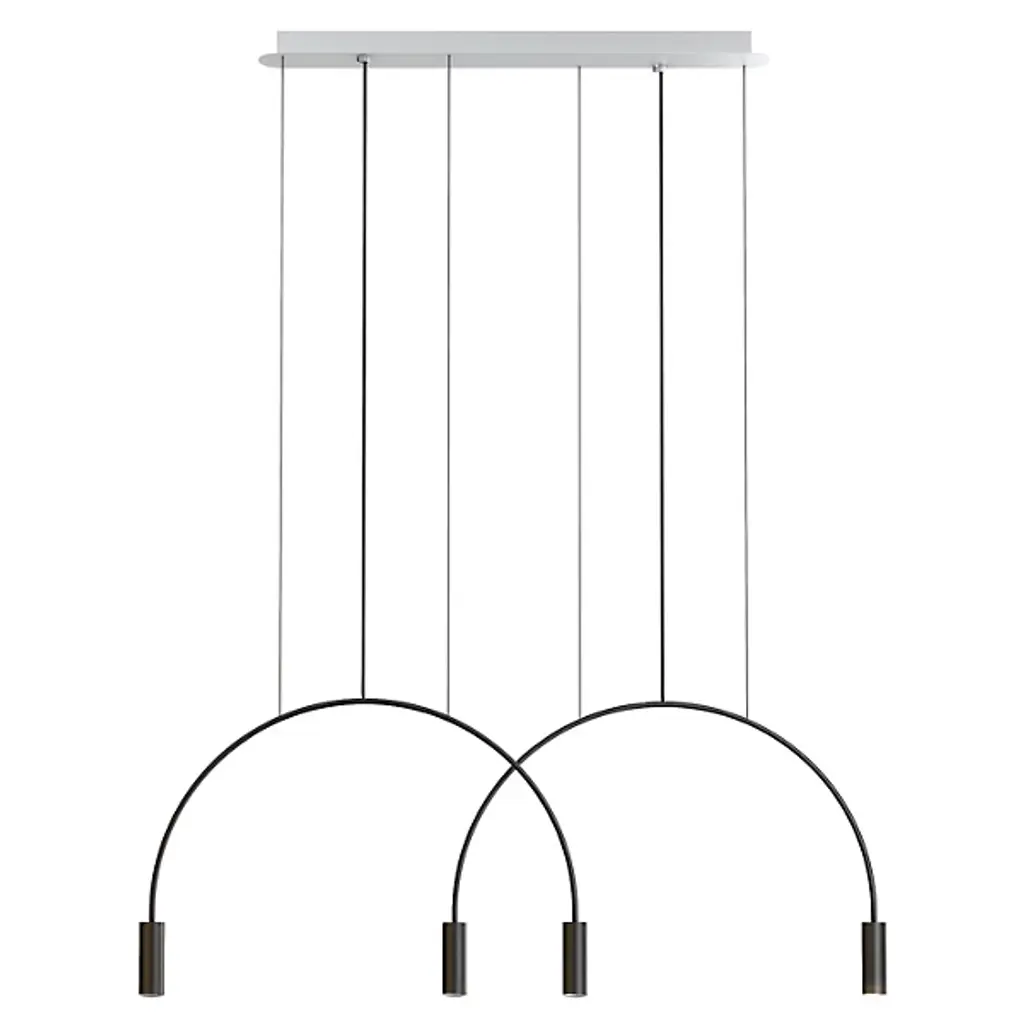 Sleek and modern, yet surprisingly elegant, the Volta L73.2D LED Linear Suspension by Estiluz Lighting will add a sense of sophistication to a modern space. Featuring a Steel canopy and Black base suspended by a matching black suspension cable, this fixture features two Volta T-3535S Double-Light Pendants overlapping to create a simple, yet intriguing design with a total of 4 light sources. At the end of each arc is an Aluminum head containing the 2700K color temperature LED light with a Methacrylate Optic lens to effectively diffuse the light to a warm glow. This piece can be used as a focal point over a dining room table, a conference room table, a kitchen island, or anywhere else in the house.