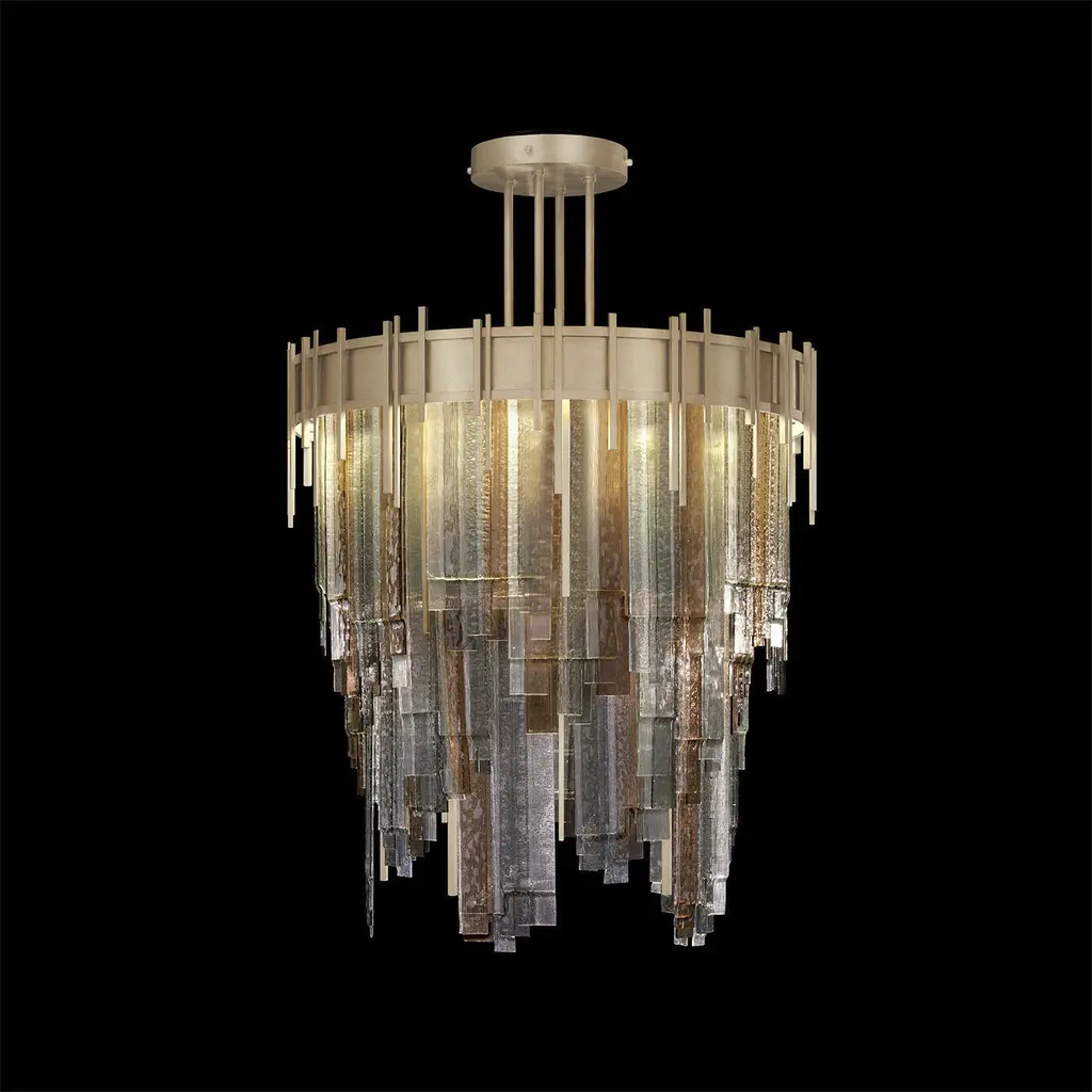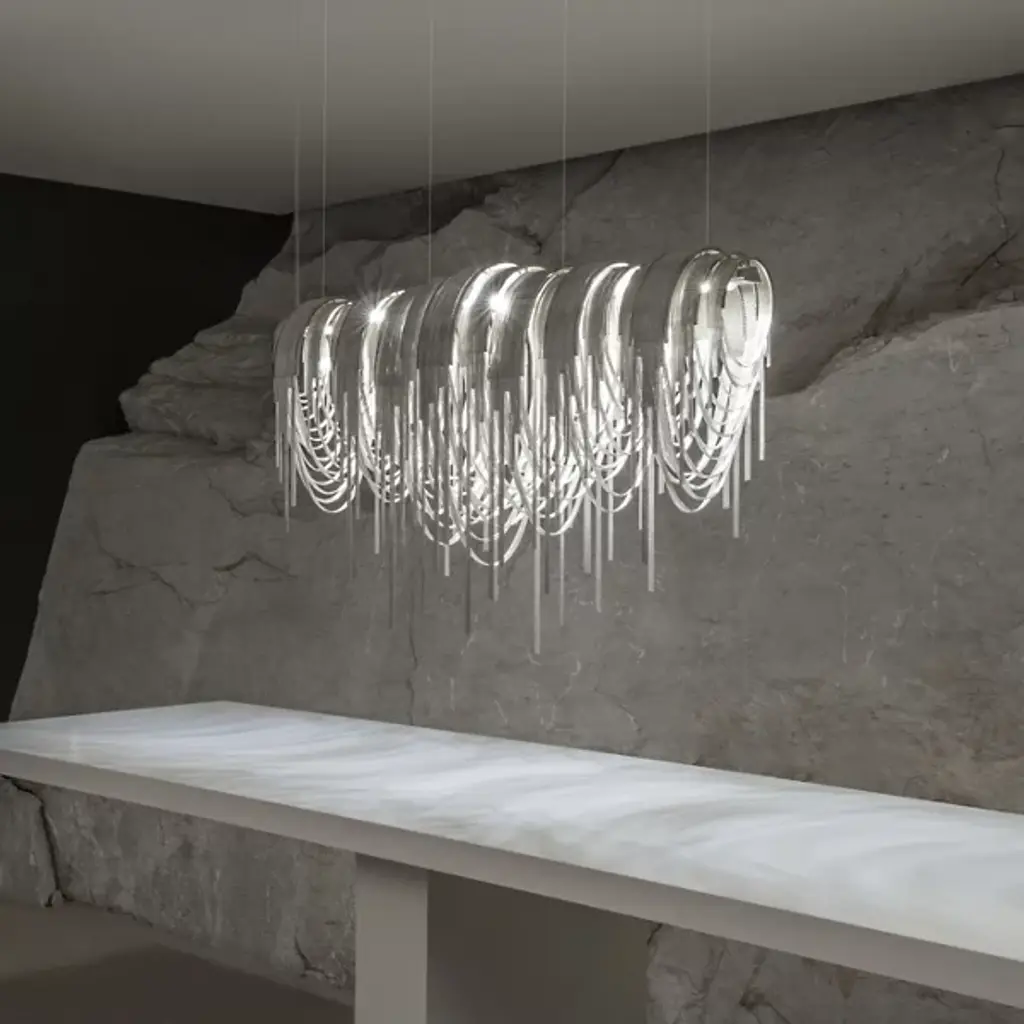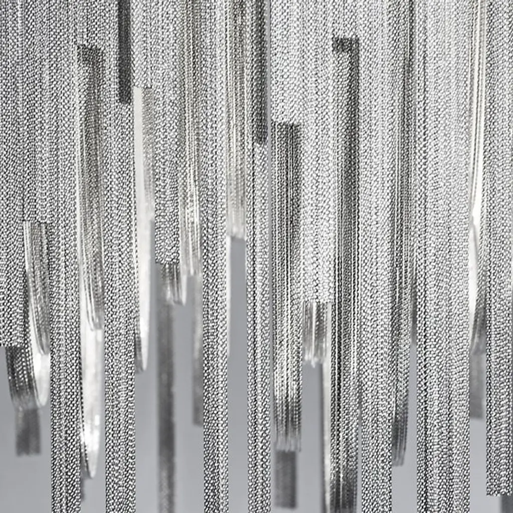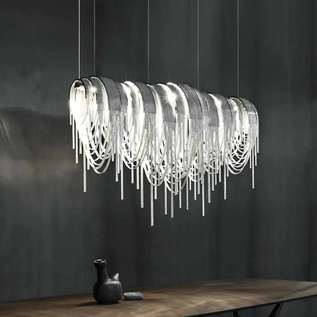 A resplendent mass of burnished cascading fluidity, the Terzani Volver LED Linear Suspension emphatically elevates the extravagance, melding the company's aesthetic affinity for elegantly draped metal chain fixtures with energy efficient LED technology. Elaborate elongated lengths of nickel-plated chains lavishly drape and loop around a hollowed central frame that houses the LEDs, creating a ceaseless contemporary sparkle for a new level of luxury.