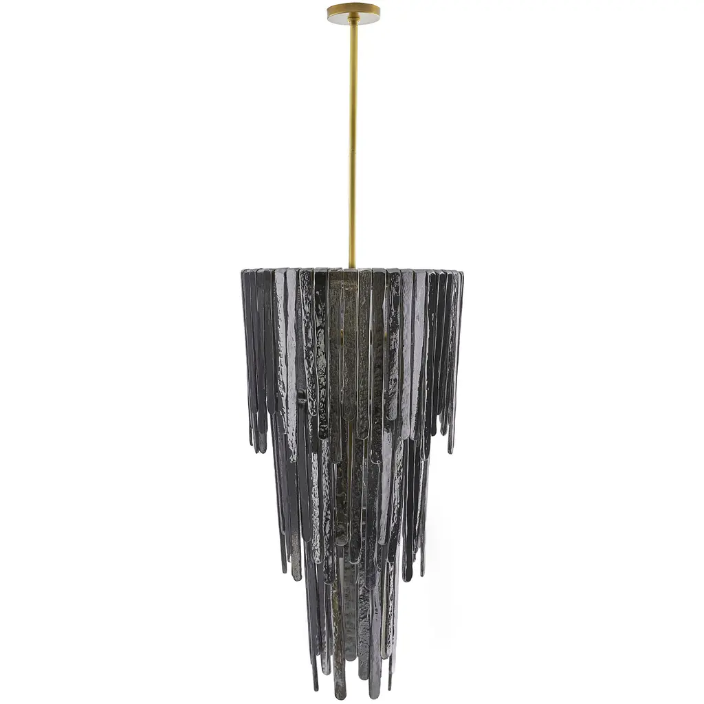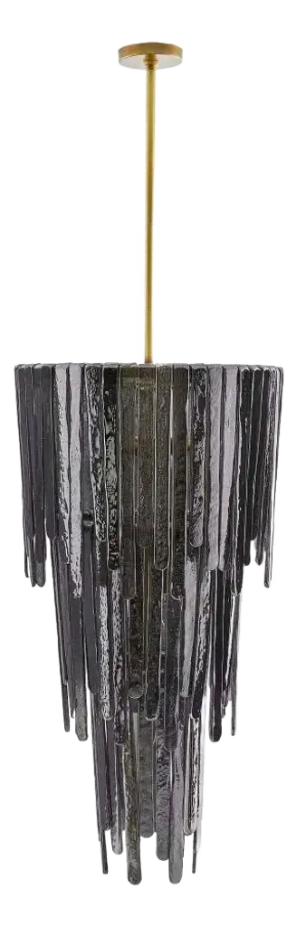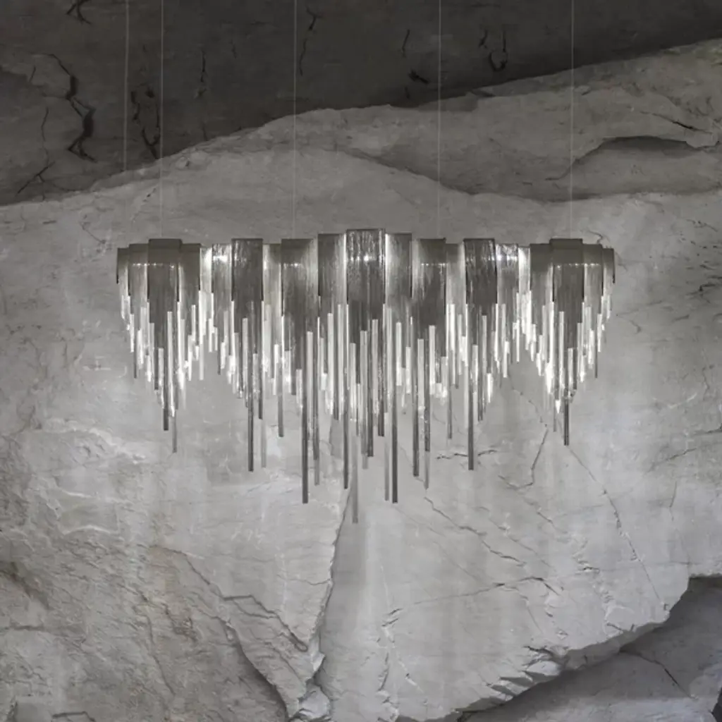 A resplendent mass of burnished cascading fluidity, the Terzani Volver LED Linear Suspension emphatically elevates the extravagance, melding the company's aesthetic affinity for elegantly draped metal chain fixtures with energy efficient LED technology. Elaborate elongated lengths of nickel-plated chains lavishly drape and loop around a hollowed central frame that houses the LEDs, creating a ceaseless contemporary sparkle for a new level of luxury.