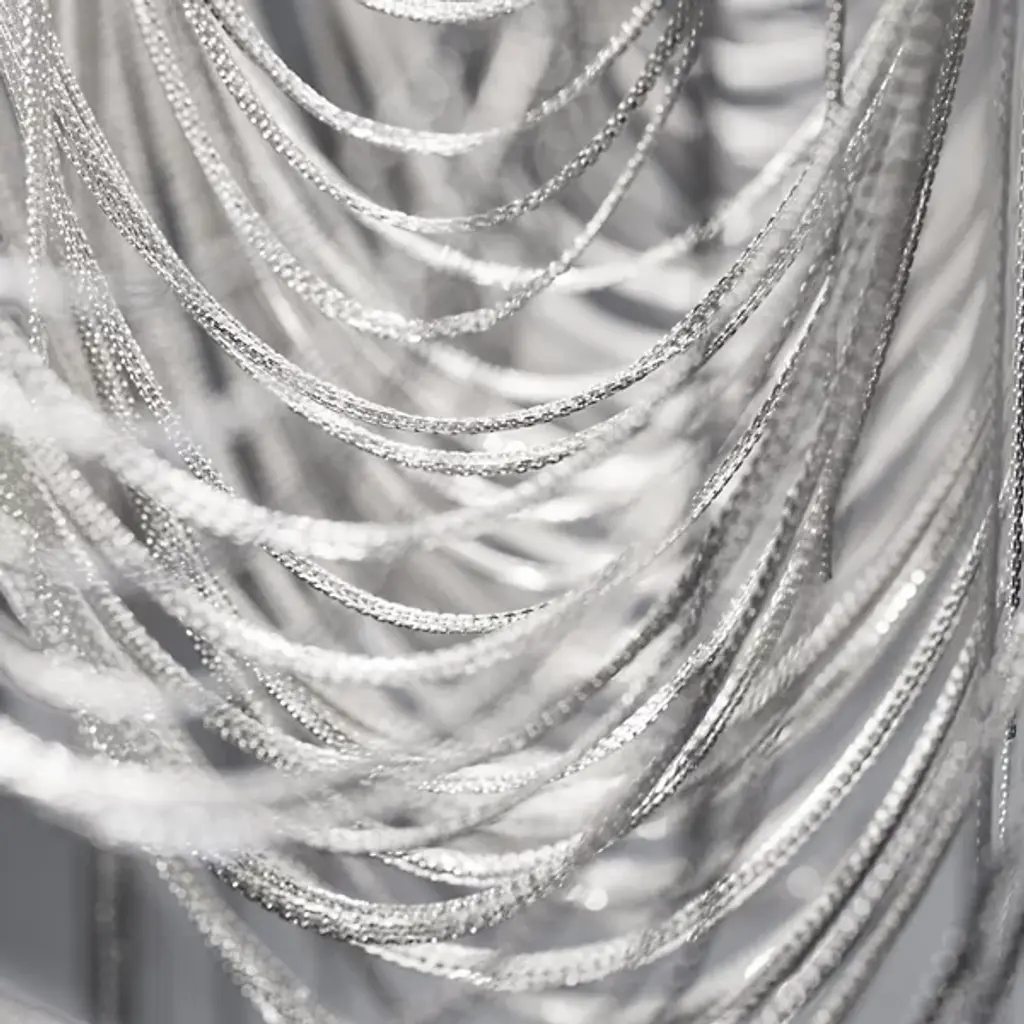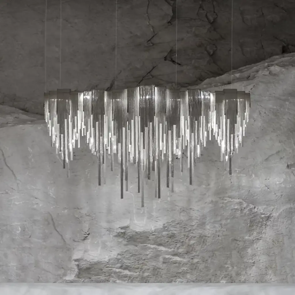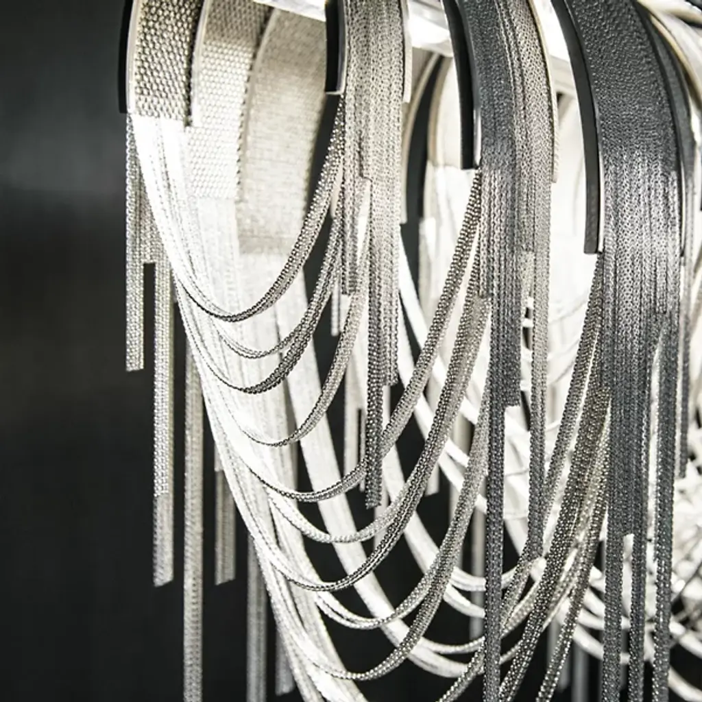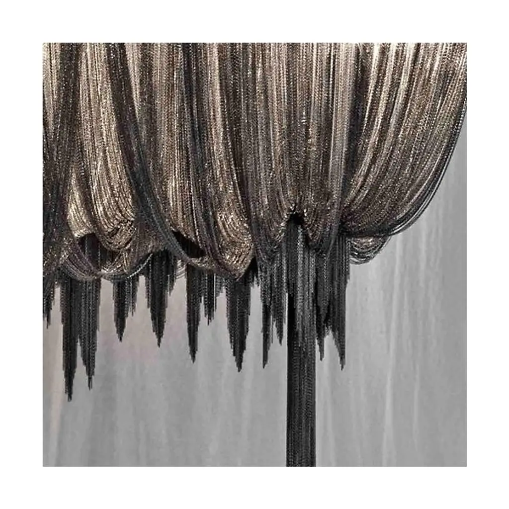 A resplendent mass of burnished cascading fluidity, the Terzani Volver LED Linear Suspension emphatically elevates the extravagance, melding the company's aesthetic affinity for elegantly draped metal chain fixtures with energy efficient LED technology. Elaborate elongated lengths of nickel-plated chains lavishly drape and loop around a hollowed central frame that houses the LEDs, creating a ceaseless contemporary sparkle for a new level of luxury.
