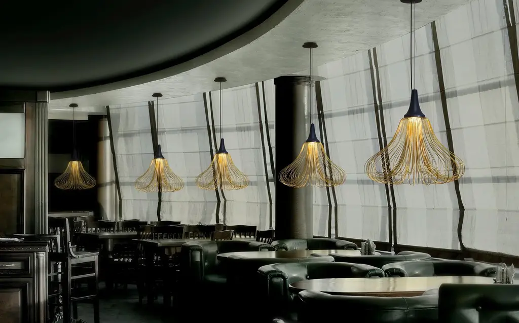 The Whisk hanging lamp is an elegant play of lines and reflections made by the curved forms of the wire frames. Made of painted steel and fiber reinforced polymer.