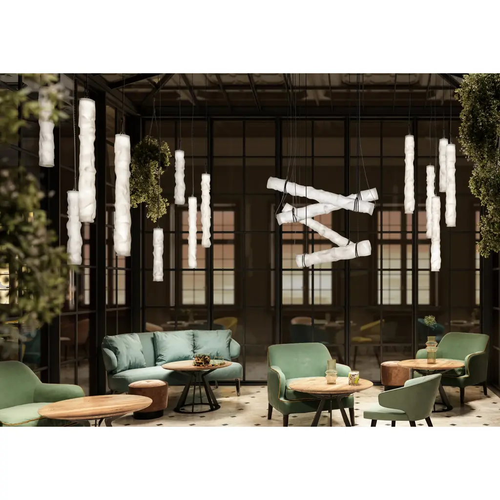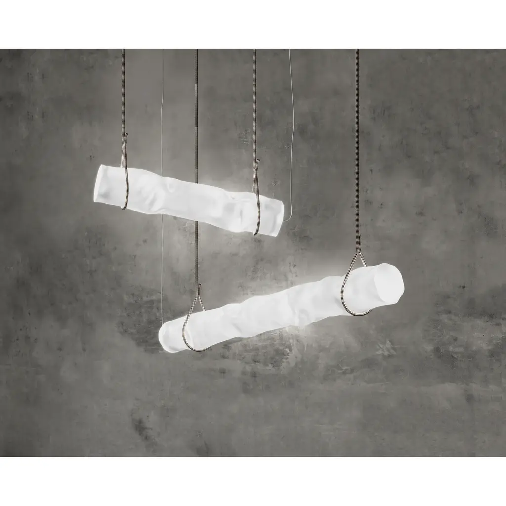 Elevate your space with the White Horizontal Hanging Lamp from Contardi Baggy. Inspired by oversized trousers, the Baggy collection exudes playful yet sophisticated vibes. The crumpled paper tube diffuser and soft textile cord in white/gray add artistic flair, while the freedom of composition allows for a bespoke touch. Experience luxury lighting like never before.