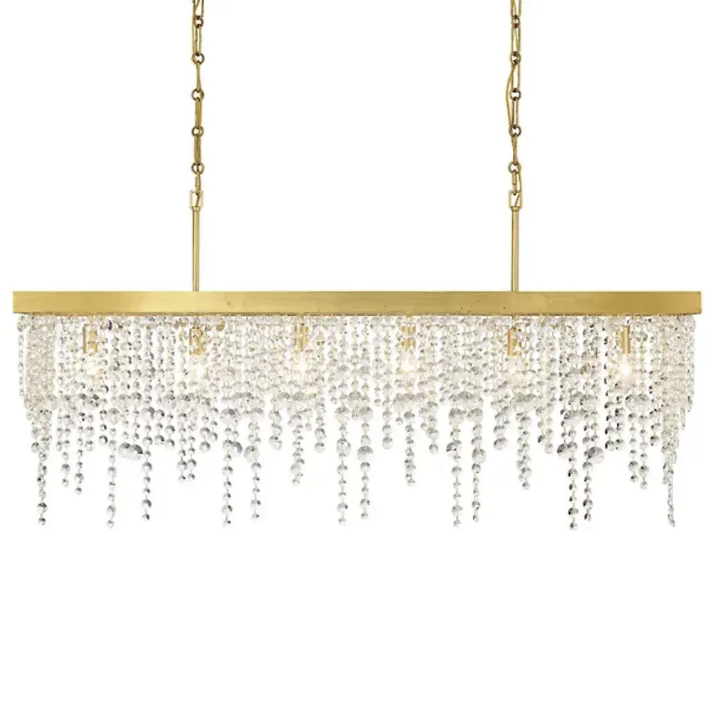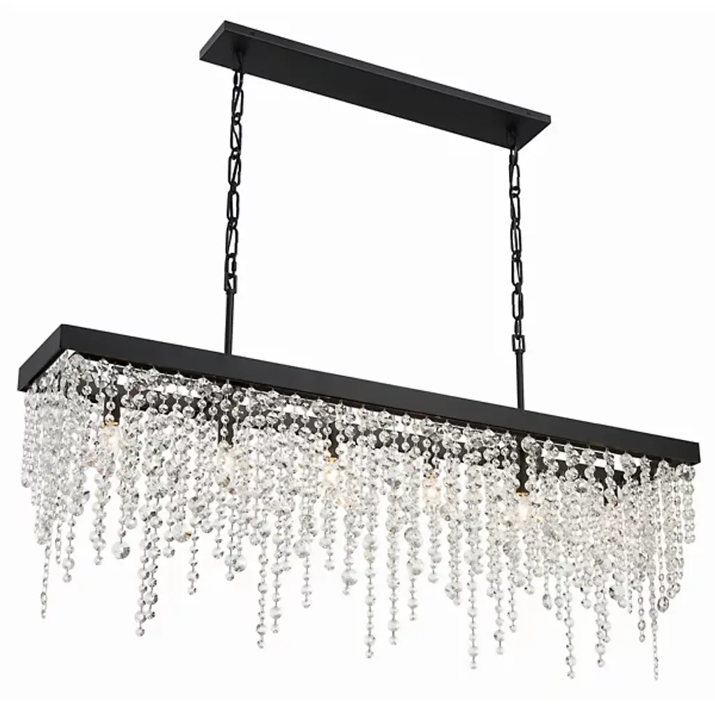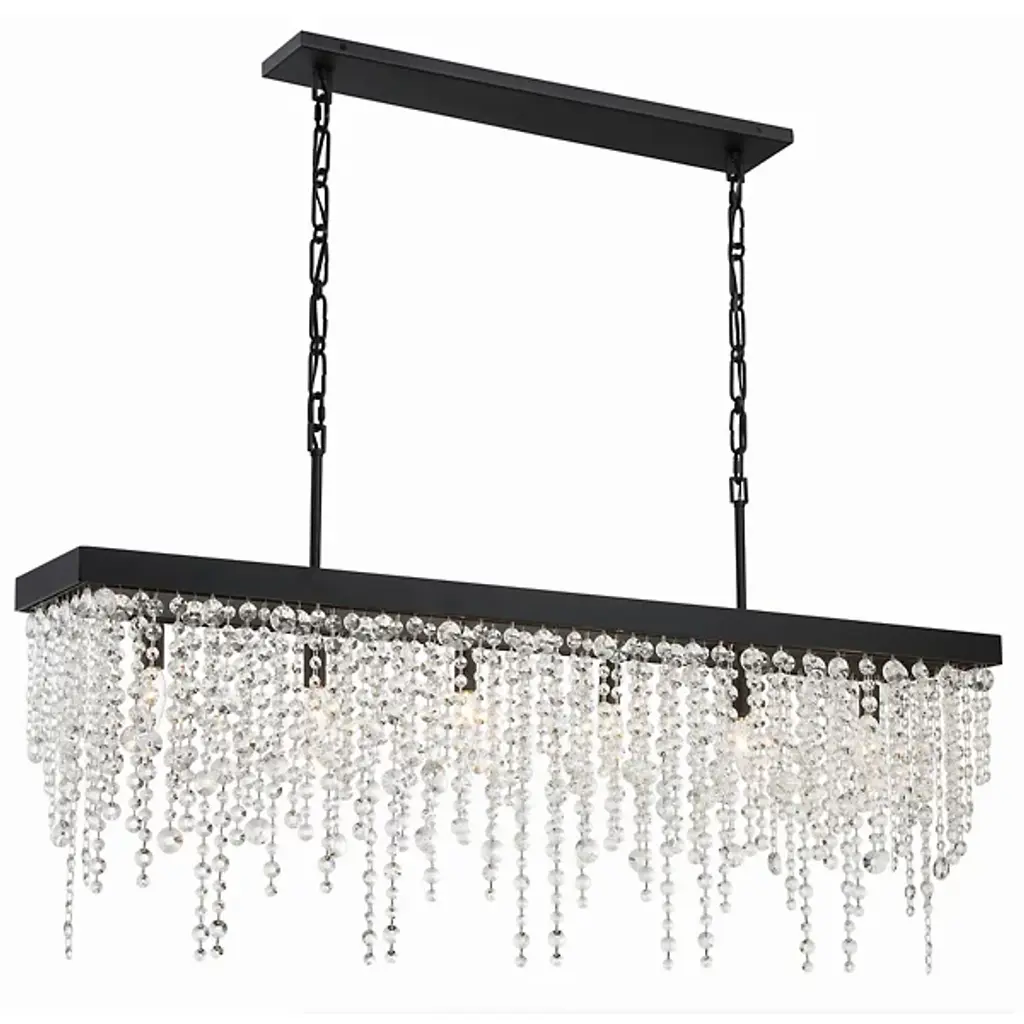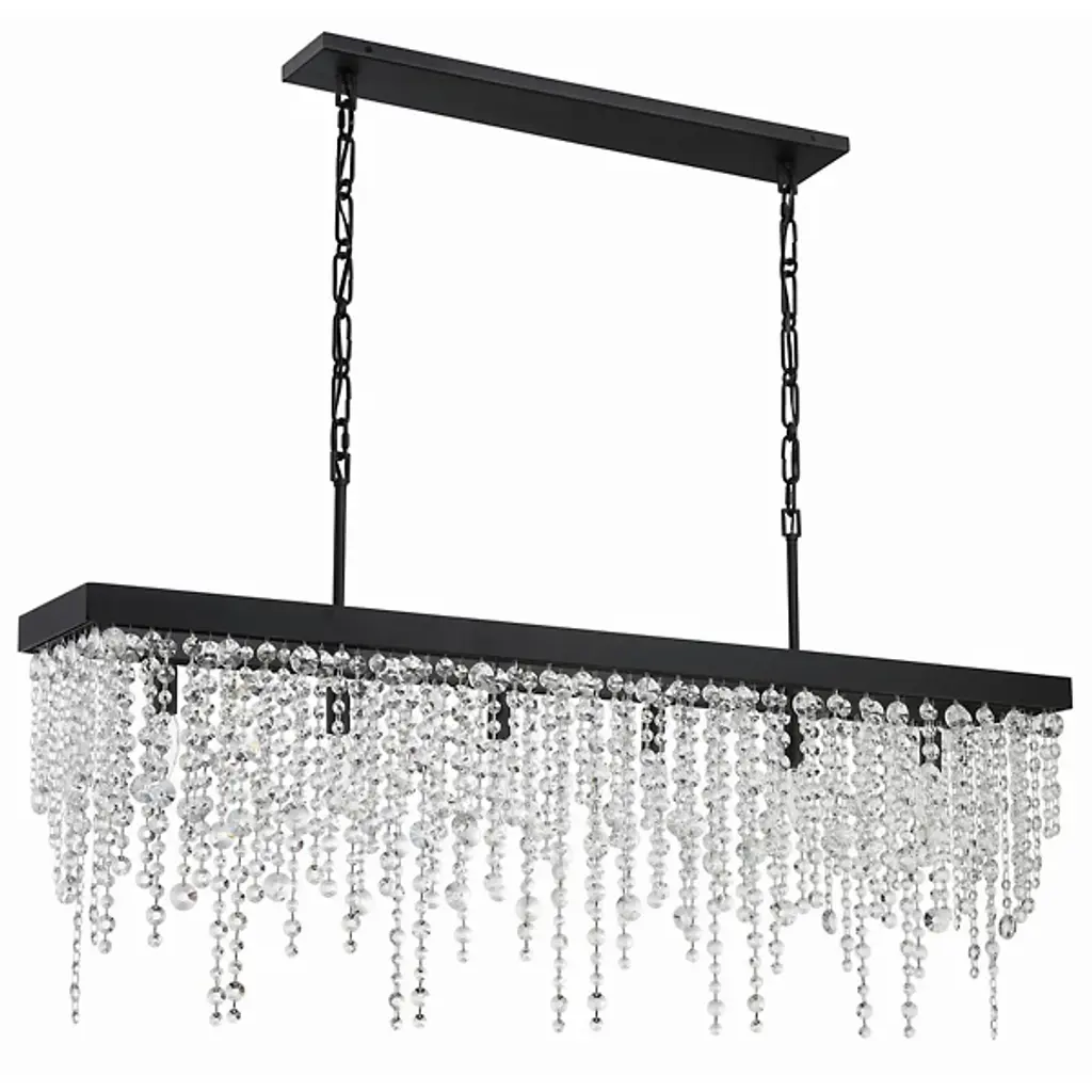 Artful, elegant, inspiring. Bask in the rainfall of sparkling light produced by the Winham Rectangular Linear Suspension from Crystorama. This showstopping piece gives dining rooms and kitchen islands a true wow factor. It follows the length of the table surface below with a long rectangular frame. One multi-faceted crystal bead after the other is tethered together to create strands of shimmering beauty. These streaming compositions don’t require the lights on to captivate with their reflections. But when they are lit up, with a series of bulbs inside, they dance with warmth and shine as light passes through them to create an encompassing ambiance.