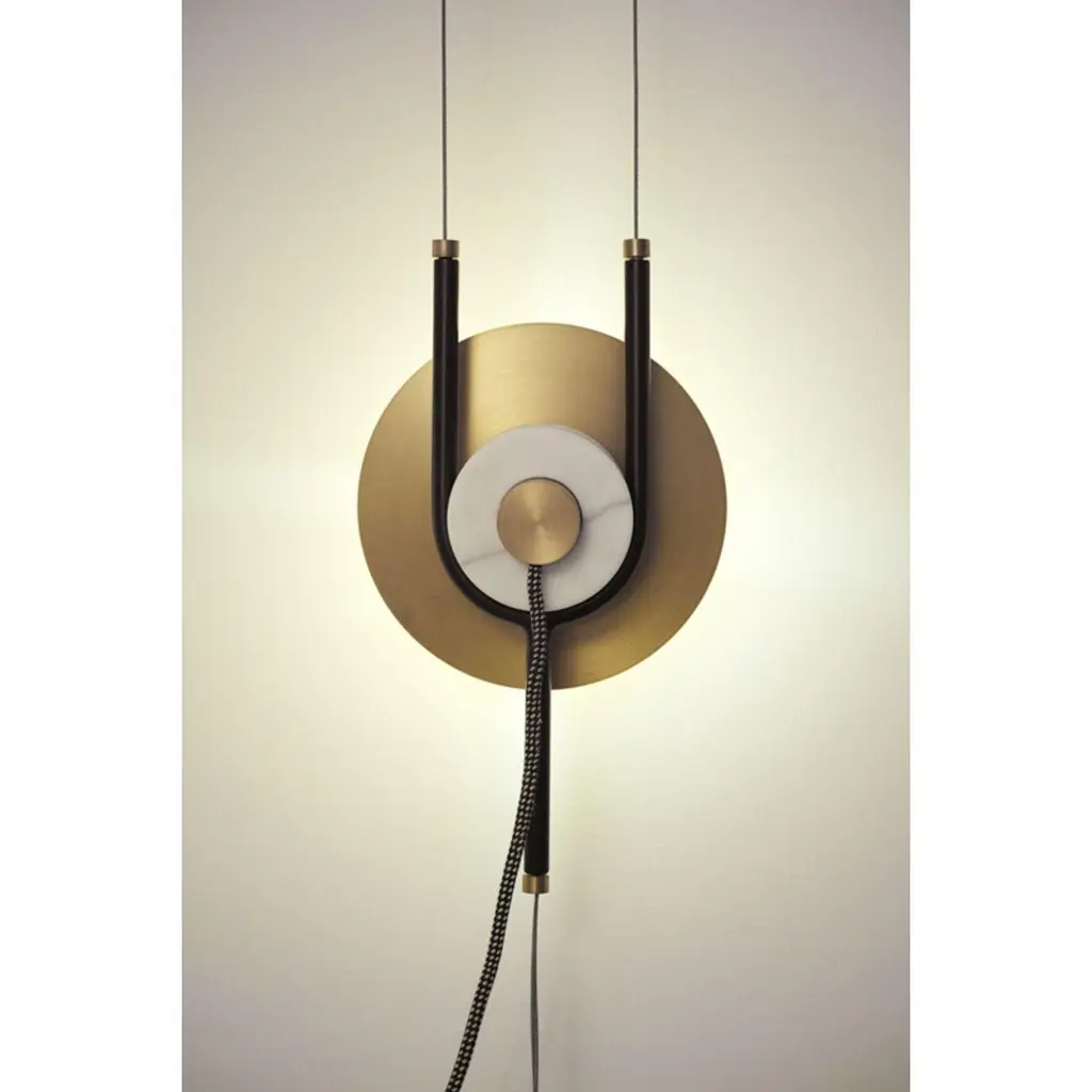 Y lamp - suspension lamp by Marc Dibeh2015Materials: Brass, black painted steel, carrara marbleDimensions: W20 x H40 x D7 cm All our lamps can be wired according to each country. If sold to the USA it will be wired for the USA for instance.Beirut based designer Marc Dibeh narrates his cultural environment through compelling interiors and products.His studio’s philosophy revolves around storytelling and how to make things timeless and simple.Dibeh’s universe is not far from planet earth but has the power to make you forget you’re in it. His methods are based on wit or sharpness of ideas. Sometimes both.Since the beginning of his career in 2009, Dibeh has been commissioned by Galleries all over the globe. The most recent being Gallerie Bensimon (Paris), Seeds Gallery (London), Artfactum (Beirut) and Joy Mardini (Beirut).