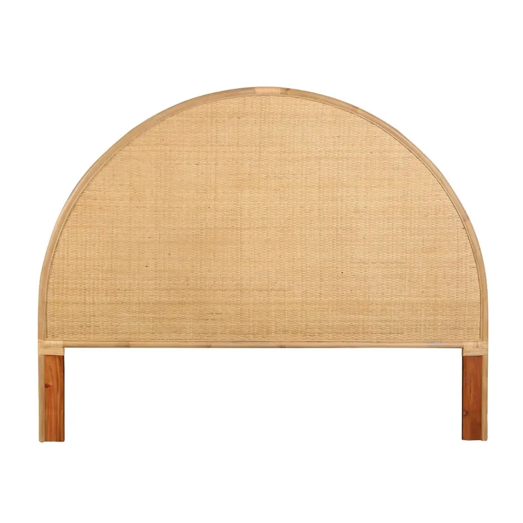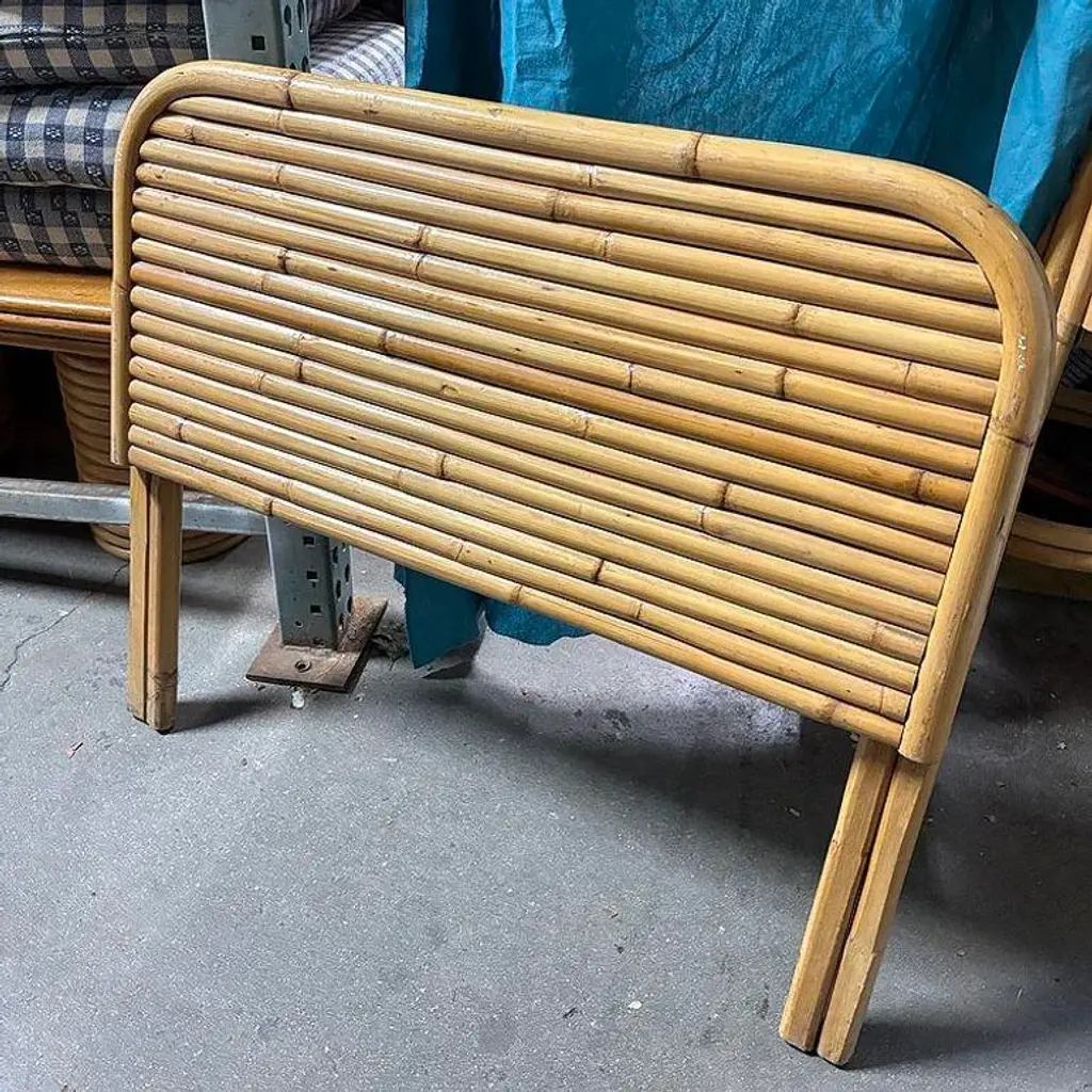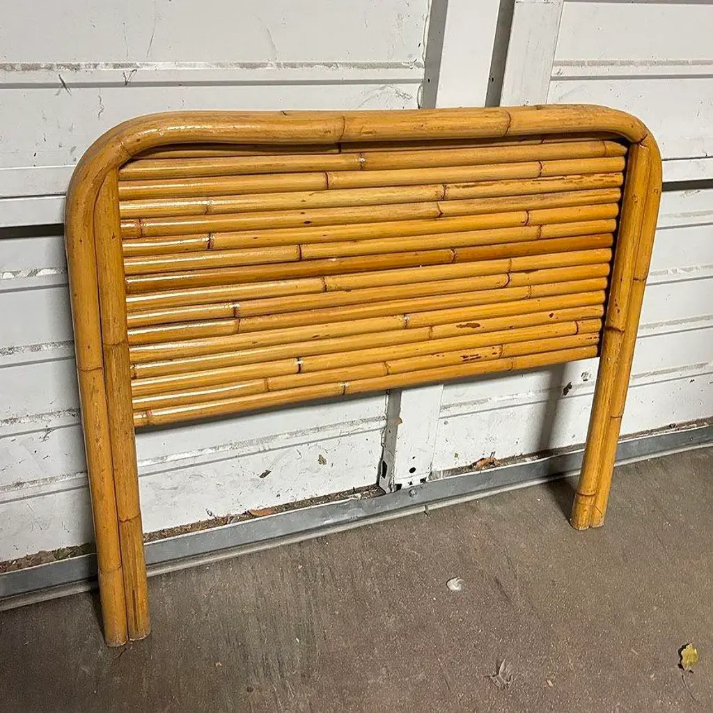 Fully restored stacked rattan headboard, inspired by the designs of Paul Frankl, this exquisite piece captures the essence of the Art Deco era. The headboard is crafted from a 12-strand horizontally stacked rattan design with double legs along the side. Perfect for a twin-size bed, it pairs effortlessly with modernist aesthetics while preserving its vintage charm. We fully guarantee your complete satisfaction! Each rattan piece has been meticulously restored by seasoned artisans, ensuring durability and beauty for years to come. The warm natural finish and flowing contours bring a sense of organic elegance, making this headboard a standout addition to your bedroom. Available- 2 It fits a mattress measuring 38" x 75". Dimensions: Overall: 29" H x 33"W 3"L Width inside of headboard: 28"5 W From leg to bottom headboard: 13" H United States, 1930