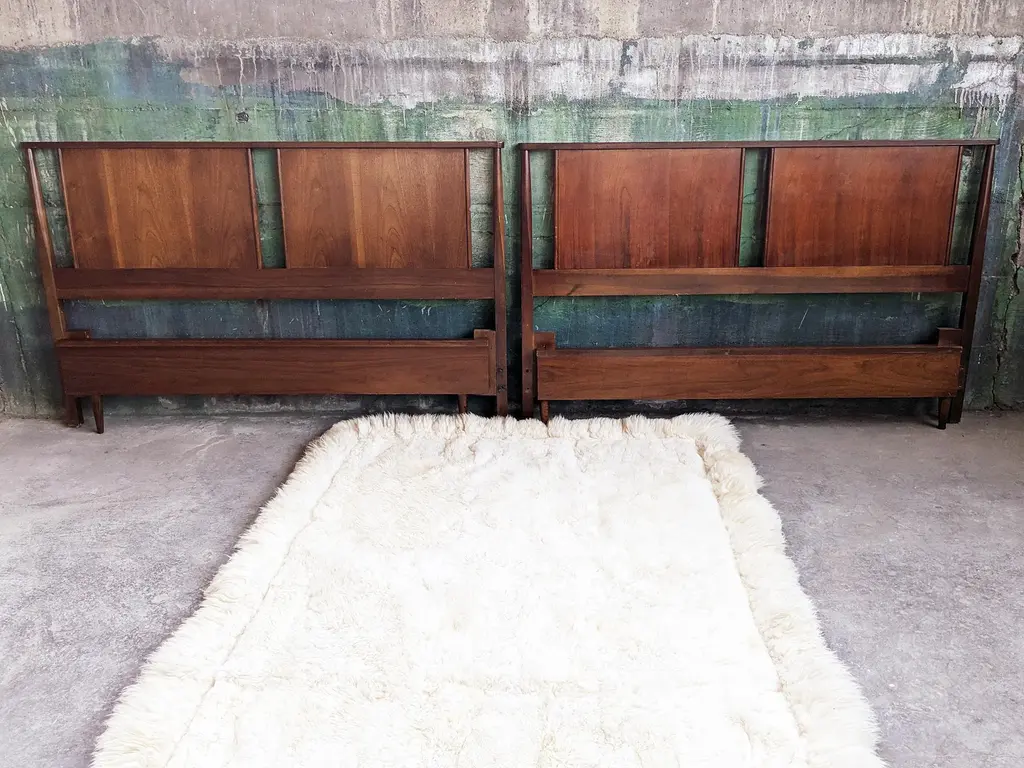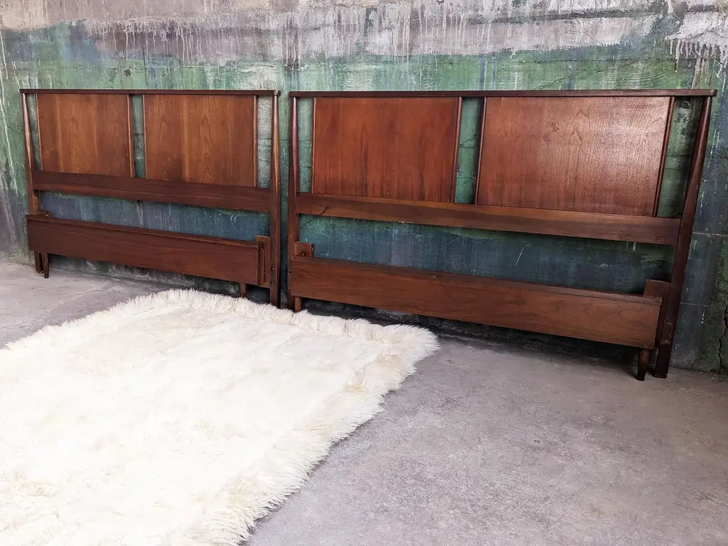Very beautiful Walnut Wood Mid Century 1960s Full / "Double" sized bed frame, including the headboard and footboard This headboard can be mounted to a metal bed frame or a platform bed base. NOTE: We have two bed frames like this one which are very similar to one another. They would look fantastic in a guest room with two Full Sized beds-- or for a sibling room for two kids, or any shared bedroom space. This listing is for the bed that is outlined in the first 6 images. Images 7+8 show the two bed frames we have together. The are slightly different, however very similar overall. The other bed frame is listed separately. We also have the two bed frames listed together in another listing, which has combined shipping. Pristine appearance would complement various interior styles like modern, minimalistic, contemporary, and Mid-Century. The convenient storage options and compact structure make it ideal for apartments or flats, with compartments that can be repurposed as nightstands, and house lamps. Very good vintage condition. Original mid century walnut piece. Great quality. Dimensions Headboard: 37 1/4" x 60 1/4" footboard 11 3/8" x 55 7/8" Width between sideboard attachments 53 3/4"