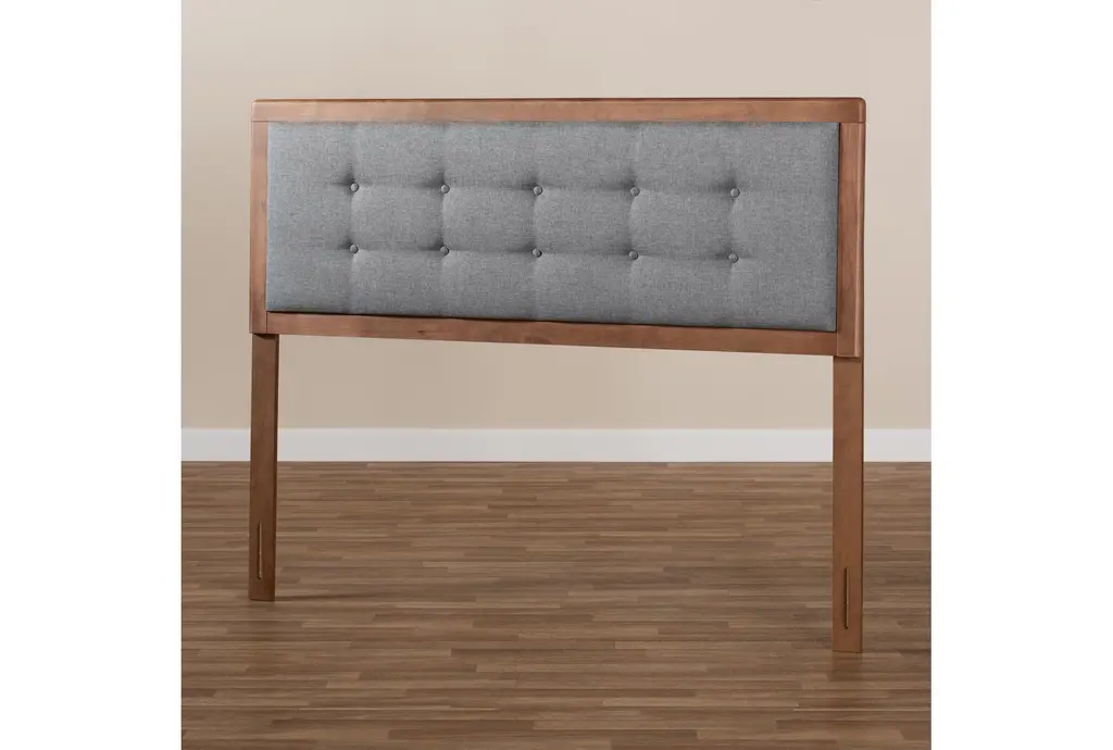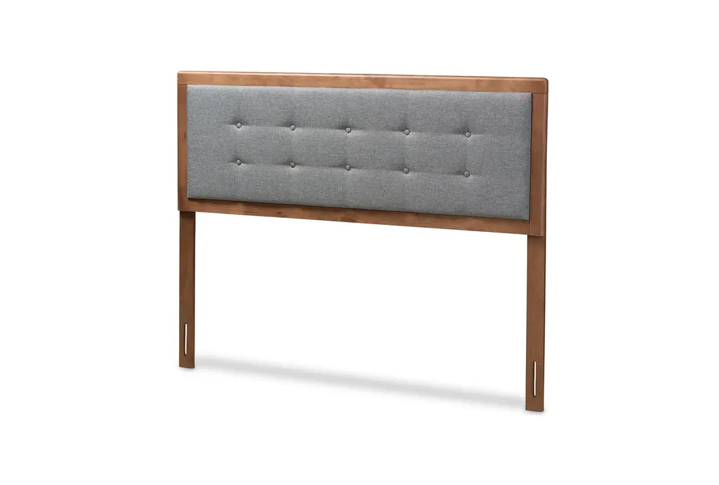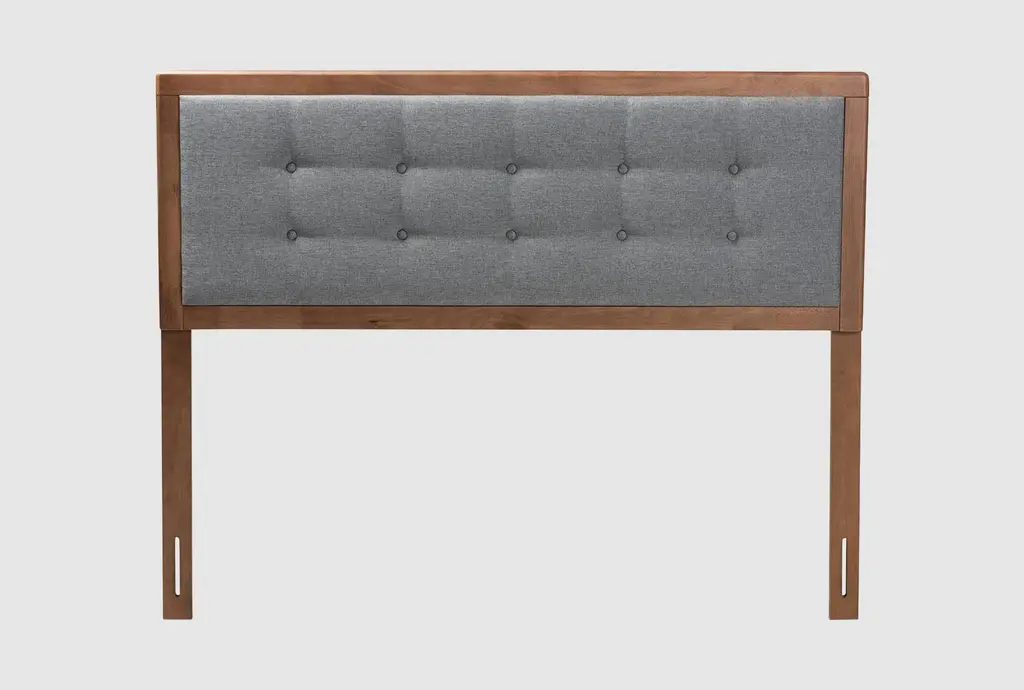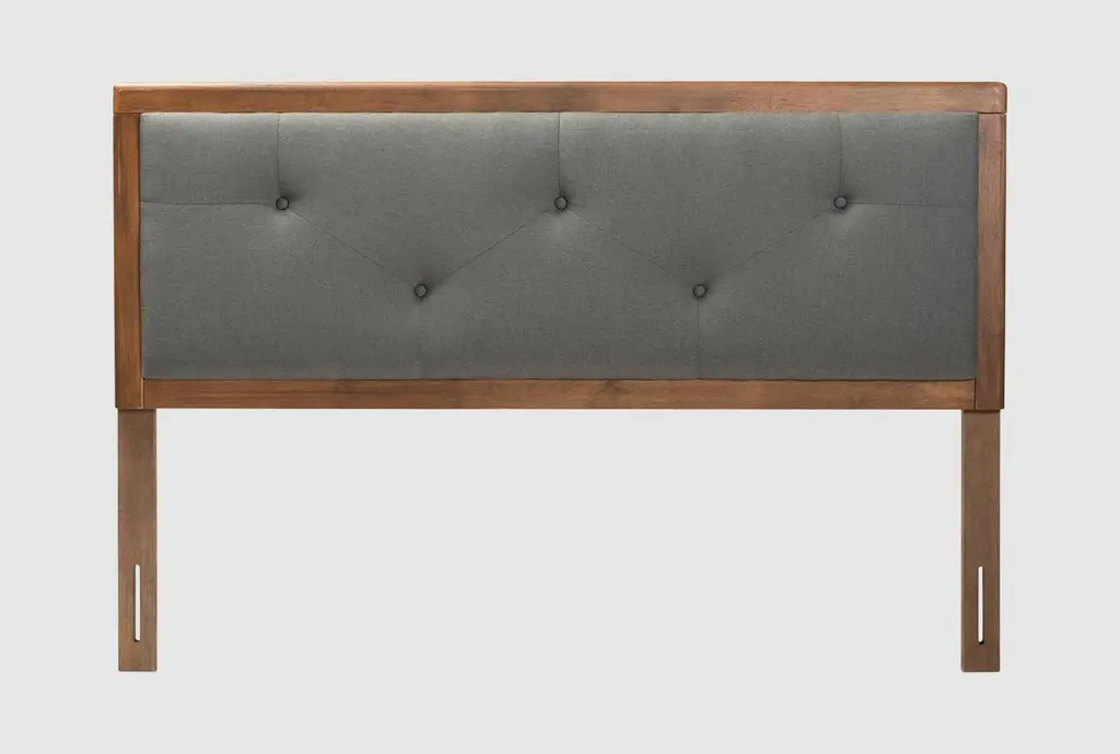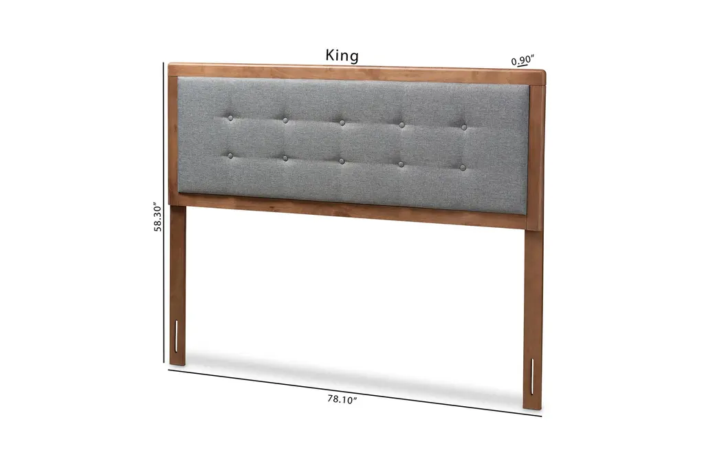 Enhance your bedroom with the Adryan King Dark Grey Fabric Upholstered Walnut Brown Finish Wood Headboard. This mid-century modern headboard features a tufted design that adds a touch of sophistication to your sleeping space. The dark grey fabric and walnut brown wood finish create a perfect blend of style and comfort.