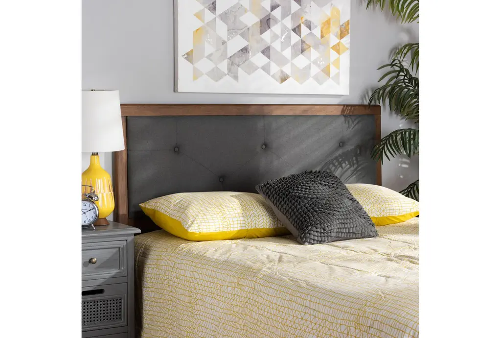 Enhance your bedroom with the Alyvia King Dark Grey Upholstered and Walnut Brown Finish Wood Headboard. This modern headboard combines a sophisticated dark grey fabric with a warm walnut brown finish, creating a inviting focal point for your space. The tufted design adds a touch of texture and visual interest.