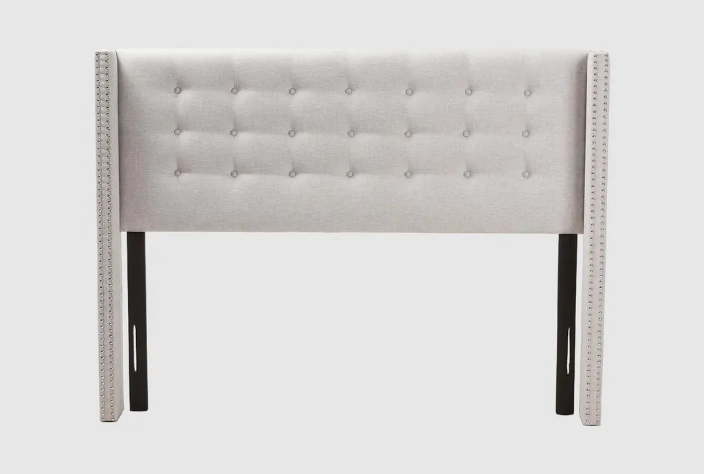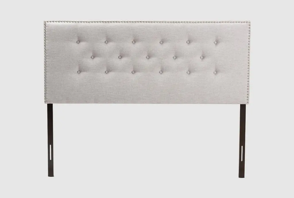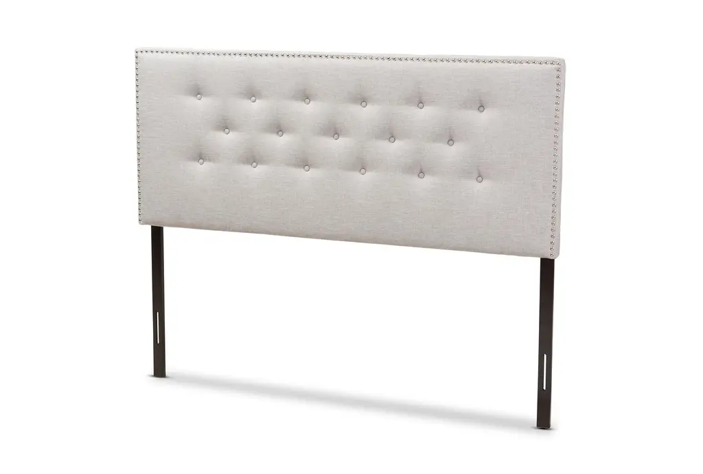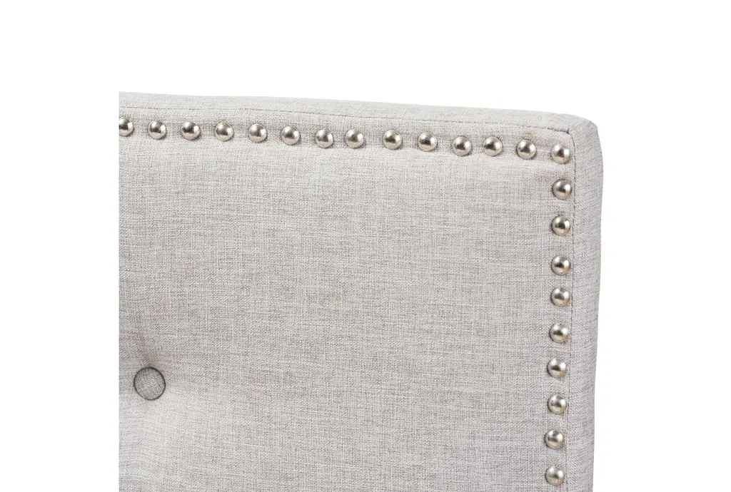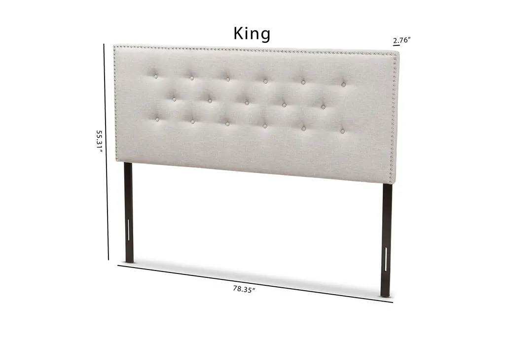 Transform your bedroom with the Aralynn King Natural Greyish Beige Fabric Upholstered Headboard. This modern headboard features a soft greyish beige fabric that adds a touch of sophistication to any sleeping room. Designed with button accents and tufted embellishments, it offers both comfort and style.