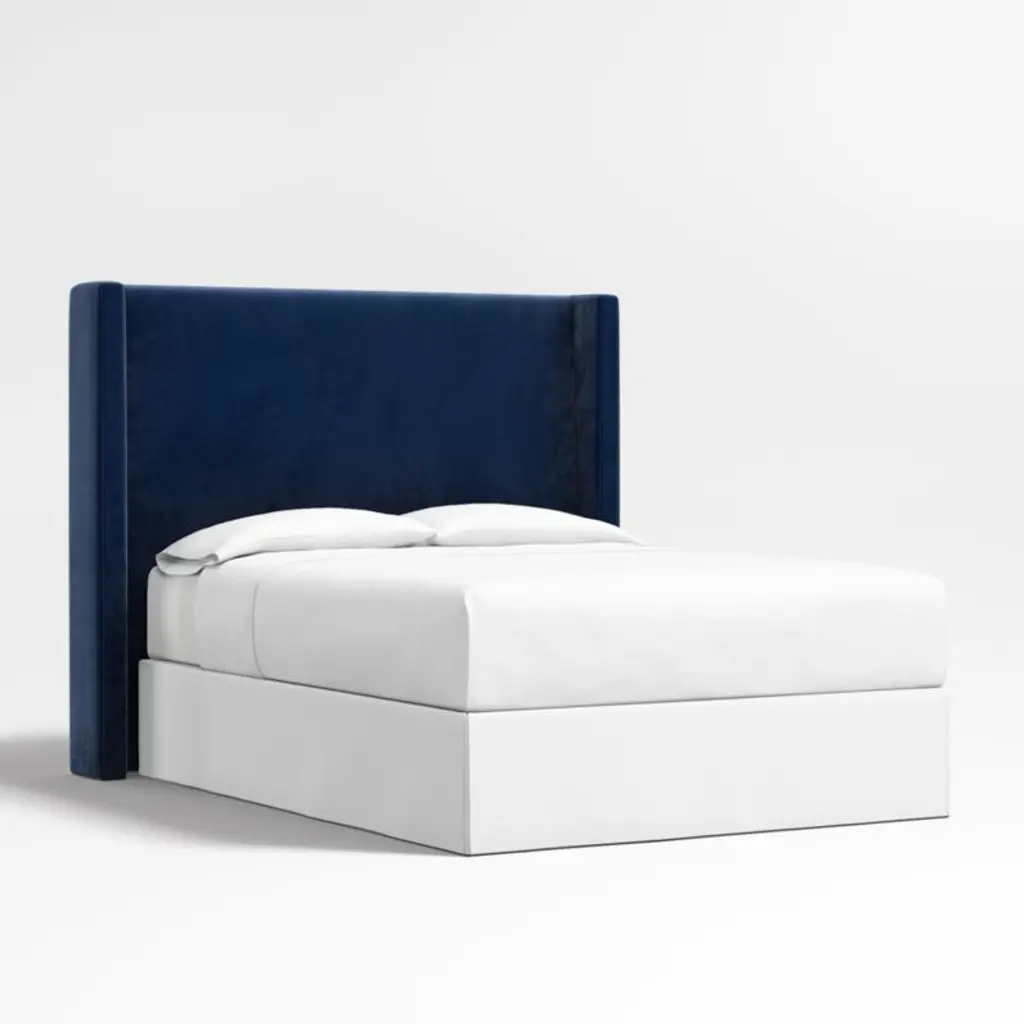 Our custom bed collection lets you mix and match our top-selling headboards and bases for a look that's truly yours. Our tall shelter headboard rises high to surround you with its wingback contours upholstered in faux mohair in navy blue. Our Arden upholstered headboard is designed to fit perfectly with any of our bed bases.By choosing FSC ®-certified furniture, you are supporting responsible management of the world's forests.