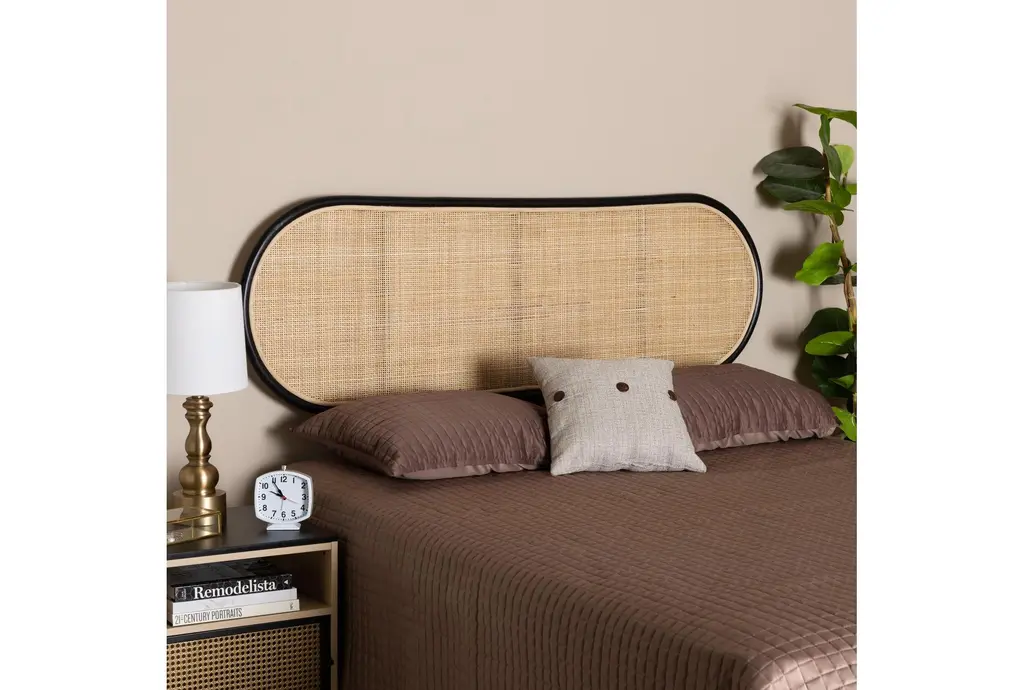 Transform your bedroom with the Averleigh Queen Bohemian Two Tone Black and Natural Brown Wood Rattan Standalone Headboard. This modern headboard brings a touch of bohemian flair, featuring a stylish woven design that blends perfectly with a variety of decor styles. The combination of black and natural brown wood with natural rattan material creates a unique and earthy aesthetic.