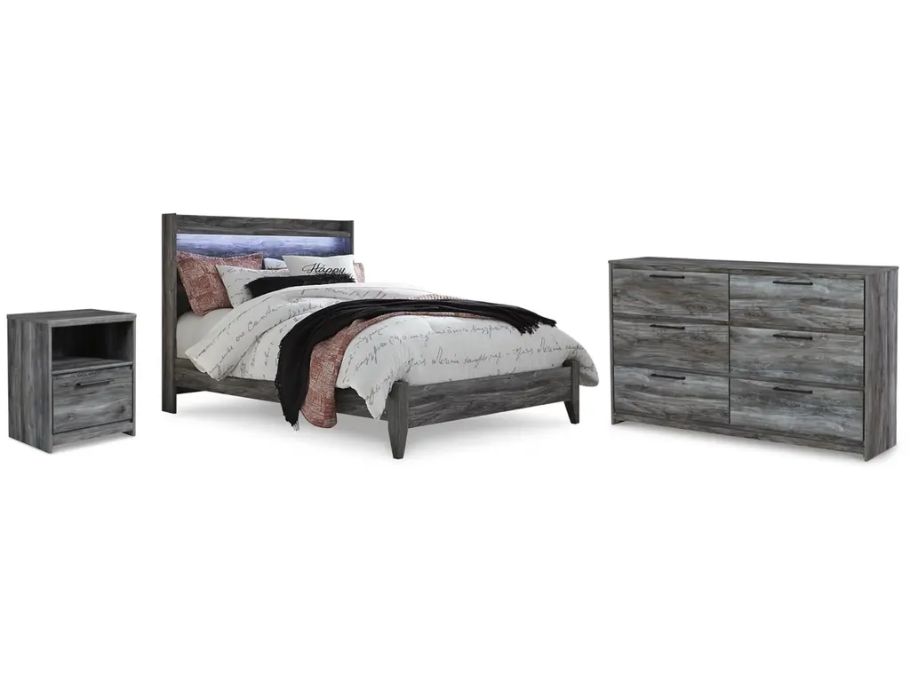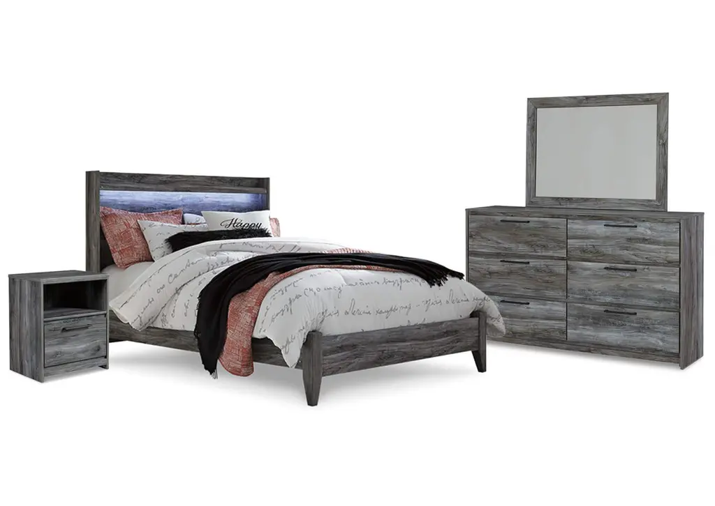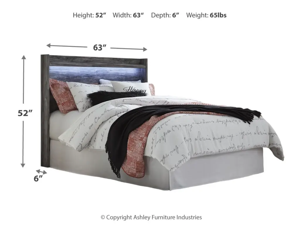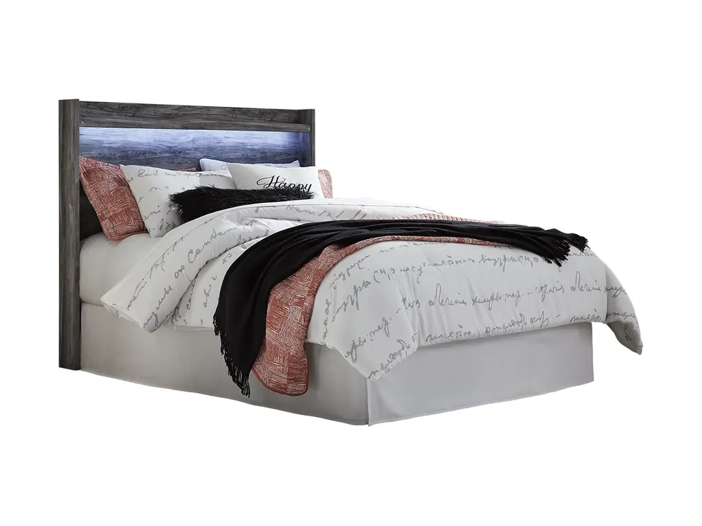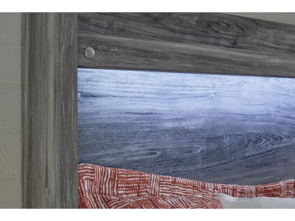 Rest in the beachy style of the Baystorm queen panel headboard. Its driftwood and surfer-inspired smoky finish and cool LED lighting give this headboard a rustic look that's perfect for creating an island oasis. Clean lines and modern charm blend for an authentic look to be enjoyed for years to come.