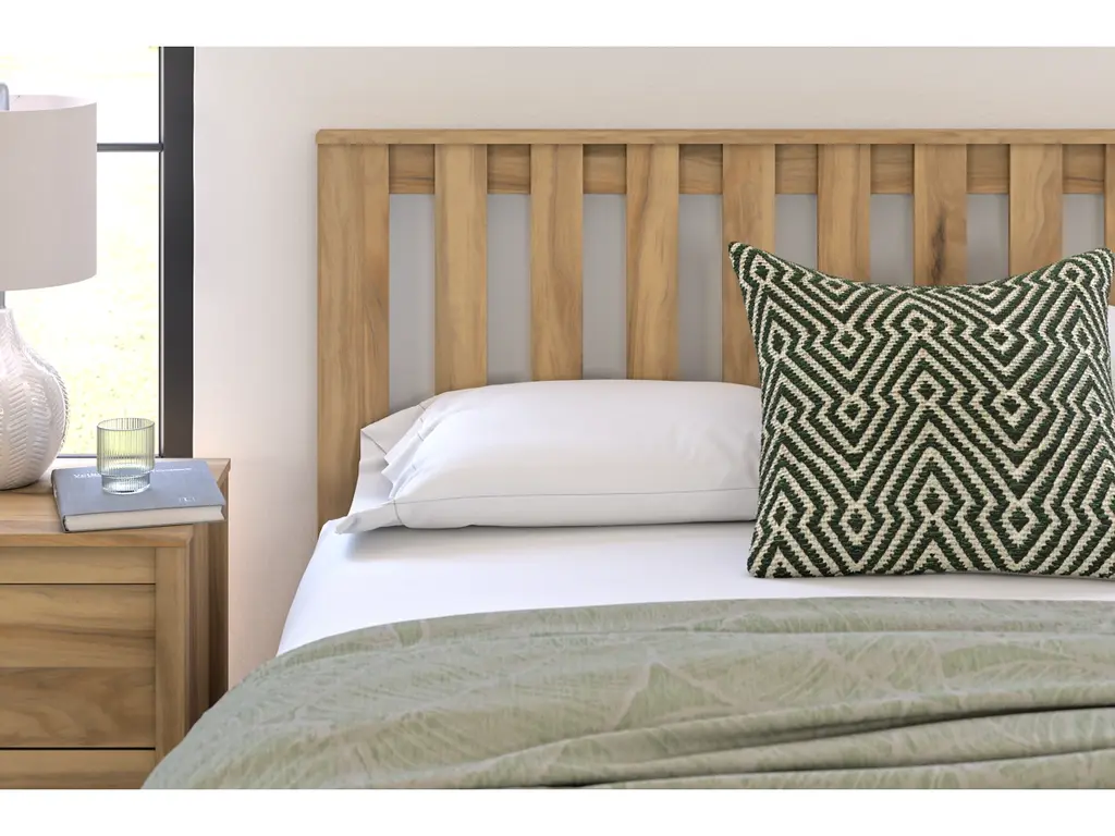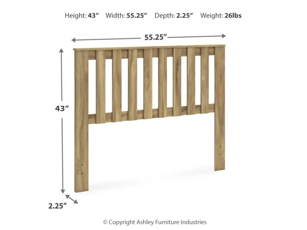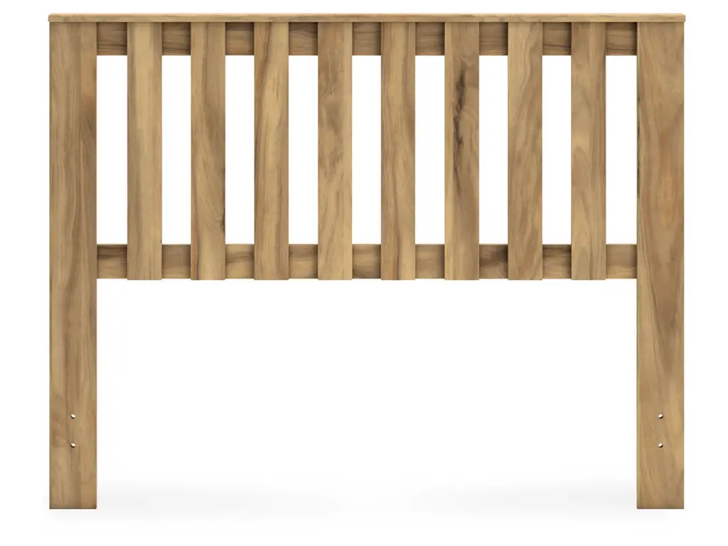 The Bermacy full panel headboard puts the dream of a casual bedroom retreat beautifully within budget. The slatted detailing incorporates rich dimension, and a warm light brown finish over replicated hickory grain exudes a homey vibe. It’s a simply relaxed way to achieve the look you want to wake up to every morning.
