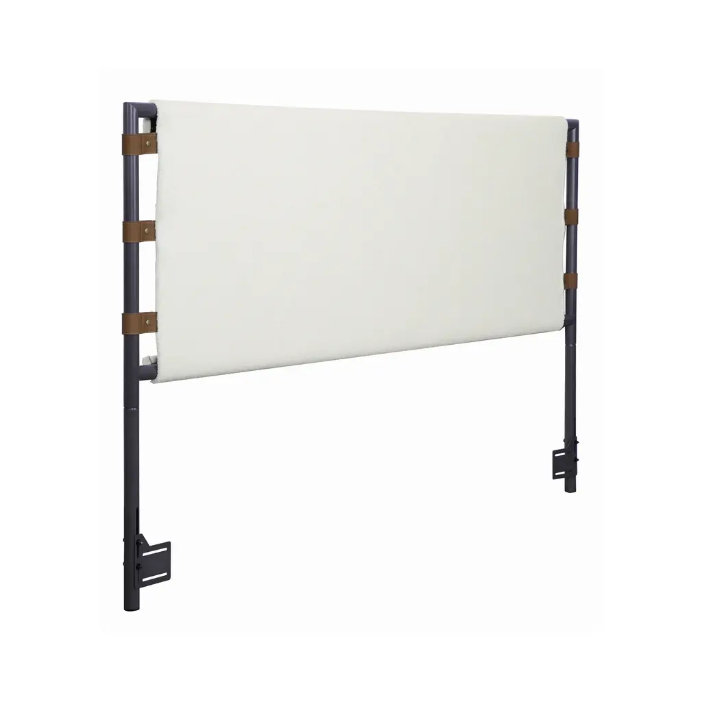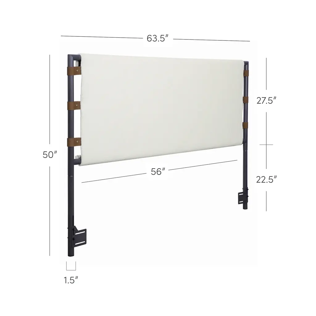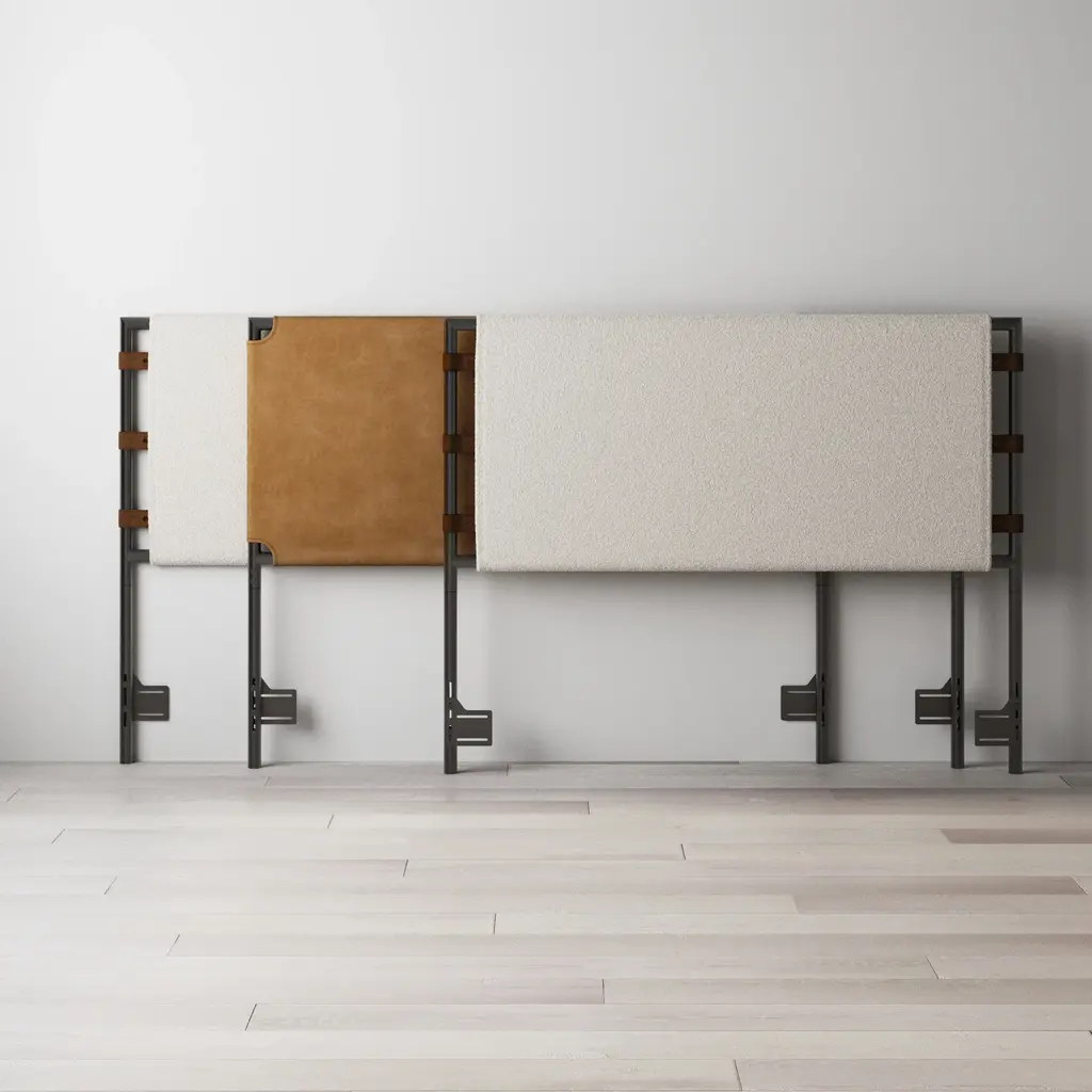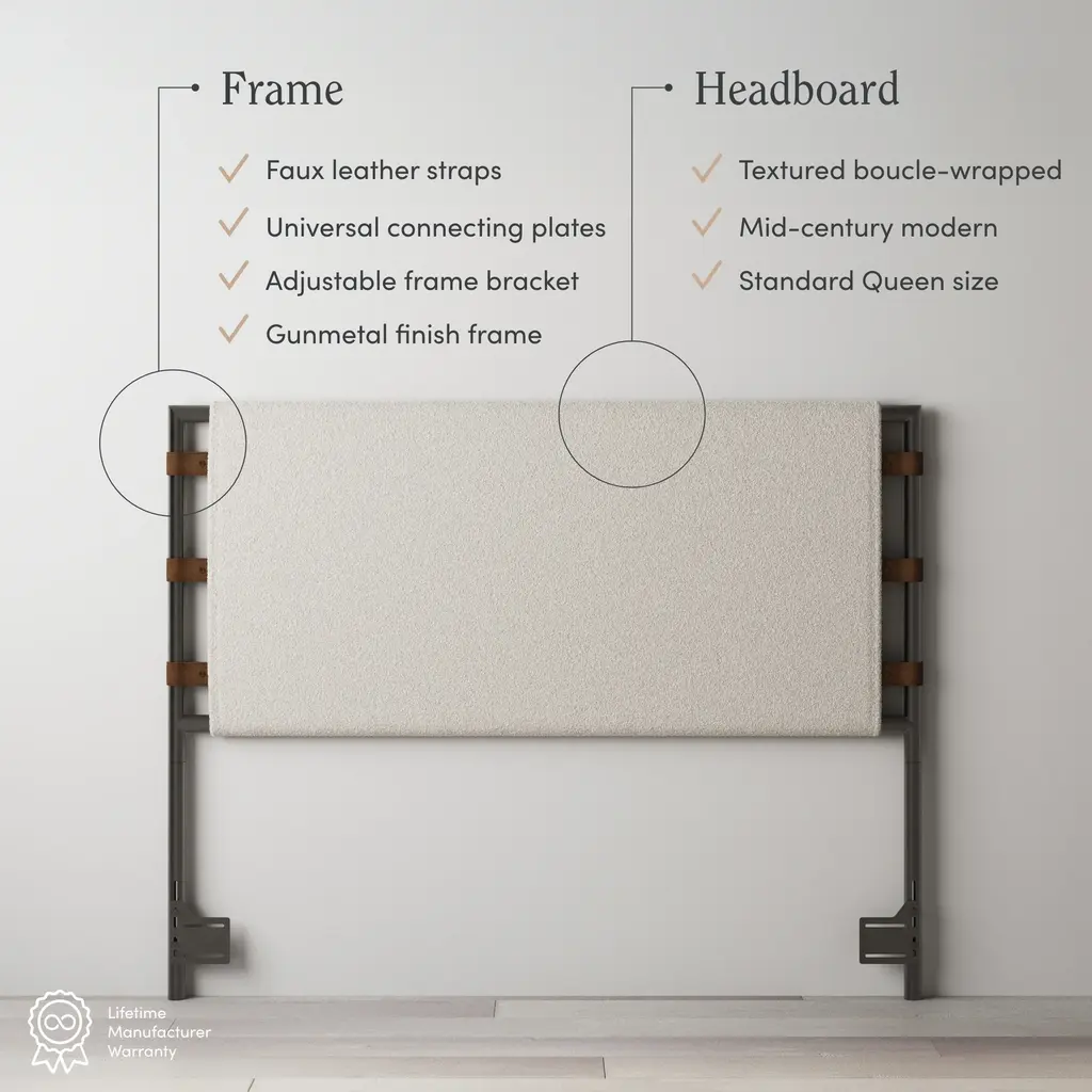 Meet Aspen, our Queen-size headboard featuring boucle panels with distressed Italian Berkshire faux leather straps and a sleek gunmetal frame. Its universal, adjustable frame bracket adjusts to fit your existing bed frame, and the panels velcro and snap over the gunmetal finish frame for easy removal. The perfect combination of beauty and comfort, Aspen is sure to add that perfect boho touch to any bedroom.