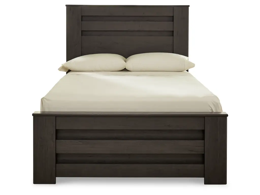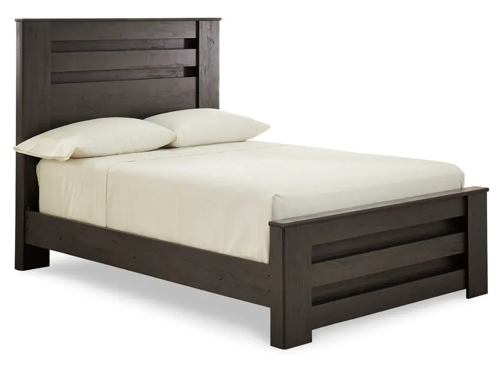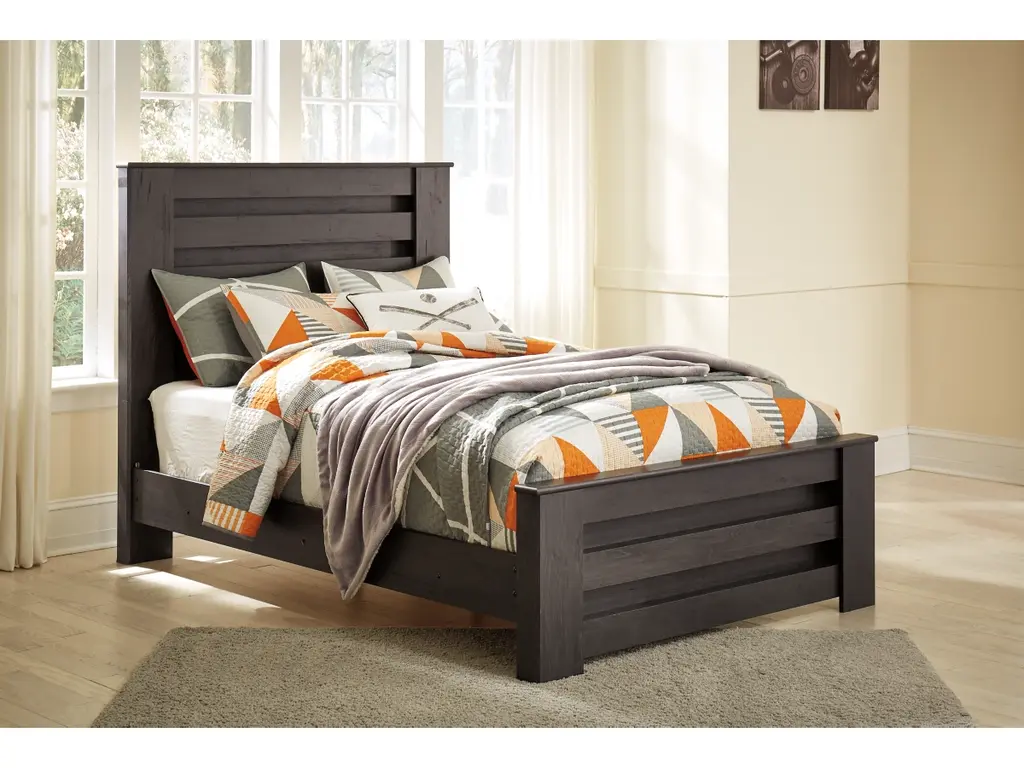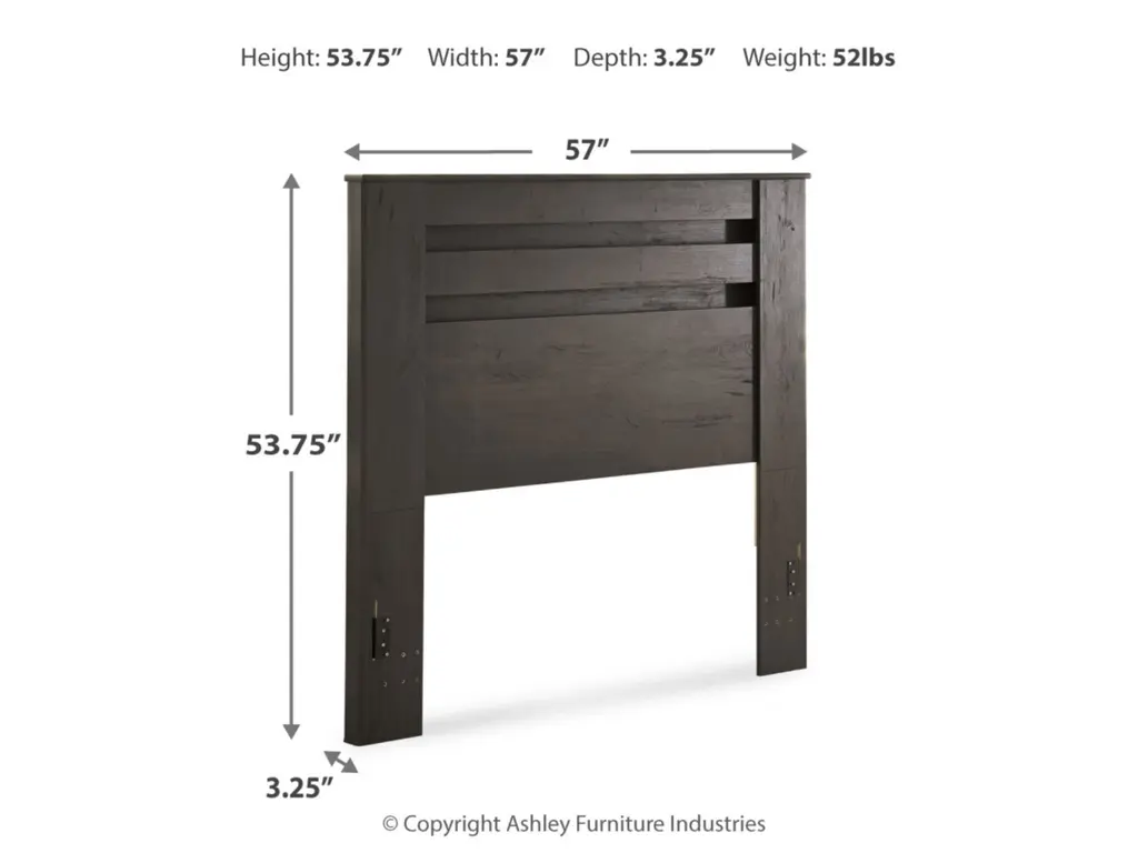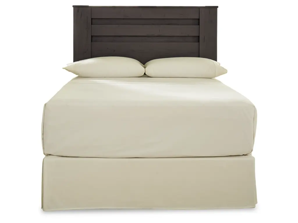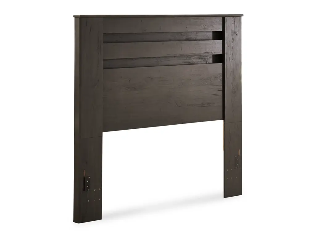 Priced to entice and styled to impress, the alluring Brinxton full headboard is urban sophistication with a decidedly relaxed air. It’s got the crisp, clean lines of a contemporary piece, but with an earthy element. Deep, horizontal grooves infuse depth and dimension, while a replicated oak grain effect gives the charcoal gray finish warmth and character.