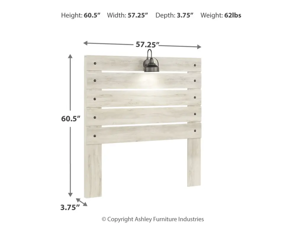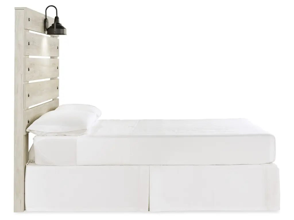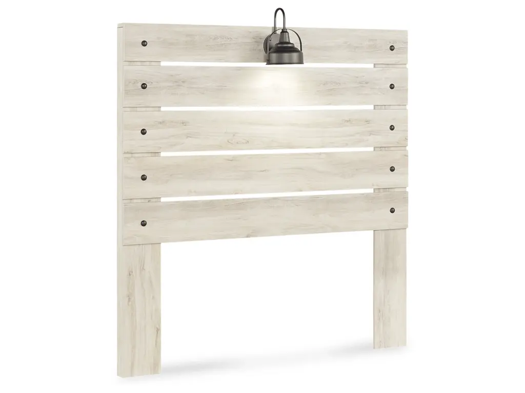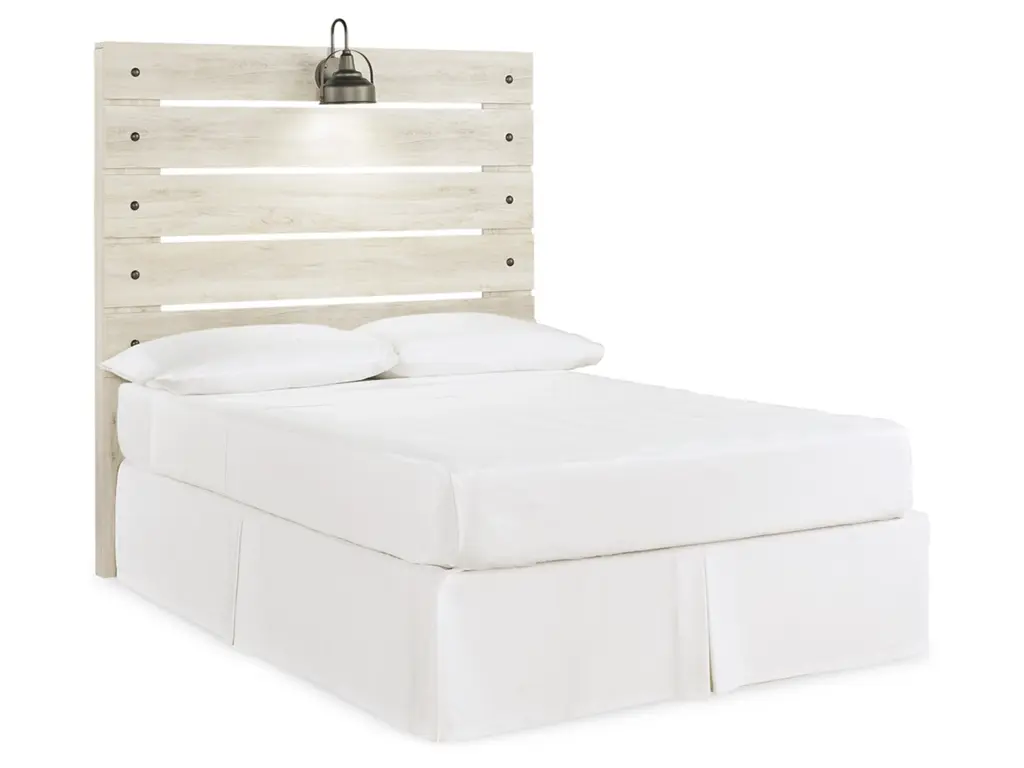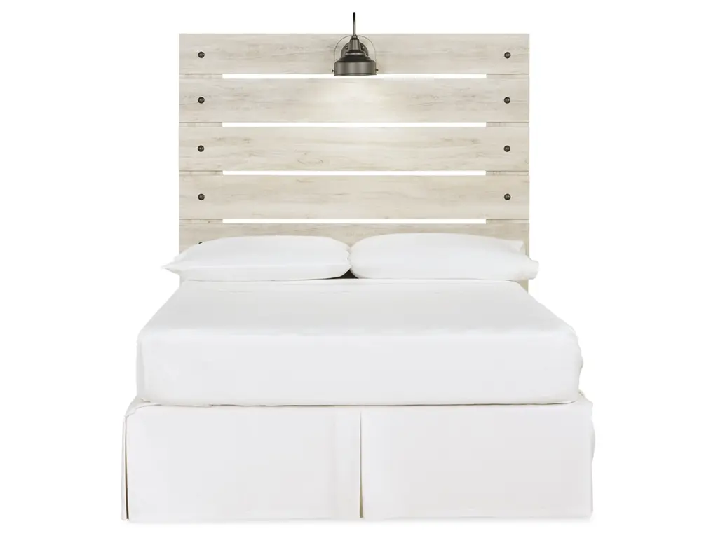 What a delightful take on rustic industrial style. Whether modern loft or modern farmhouse, the Cambeck full panel headboard makes itself at home. The wispy whitewash palette enhances without covering the grain for that weathered look you crave. Love to read in bed? You’re sure to find the retro-chic light sconce and USB plug-ins on the open-slat style headboard such a bright idea.