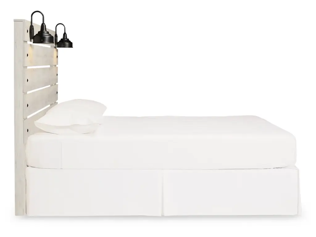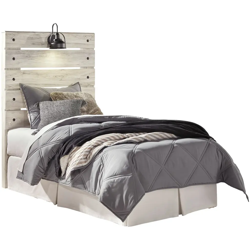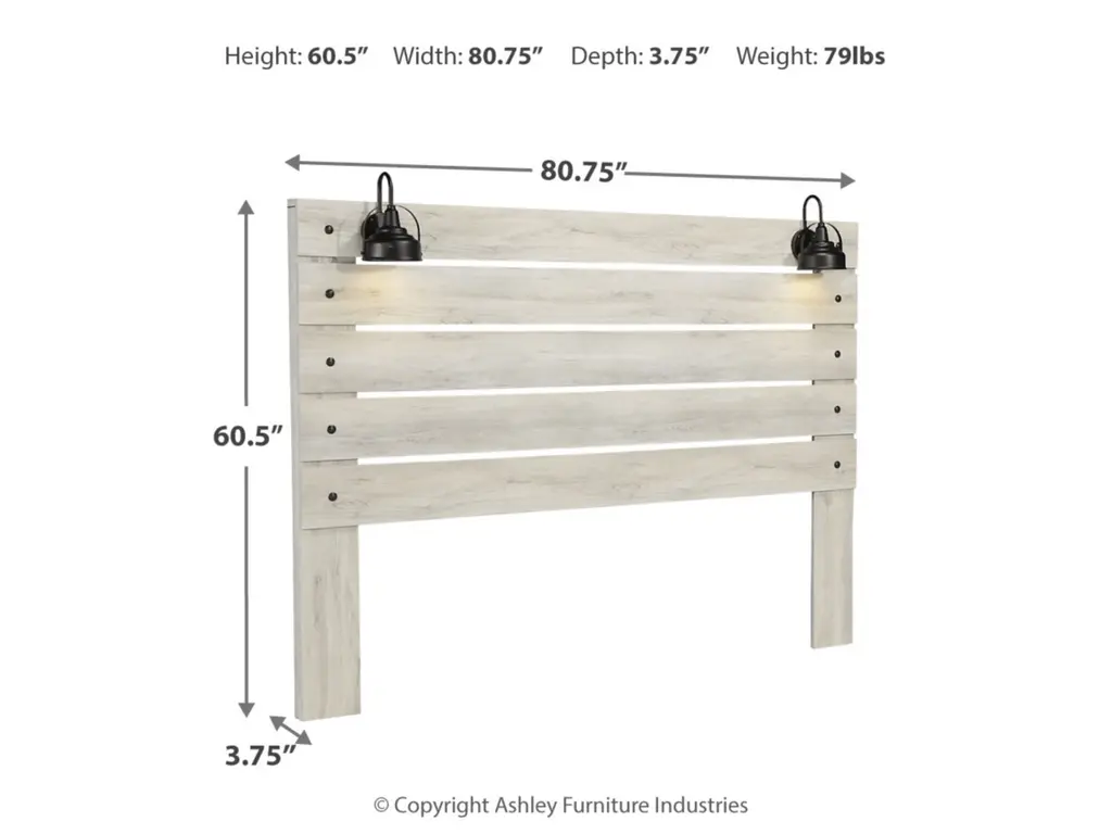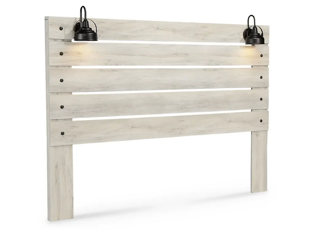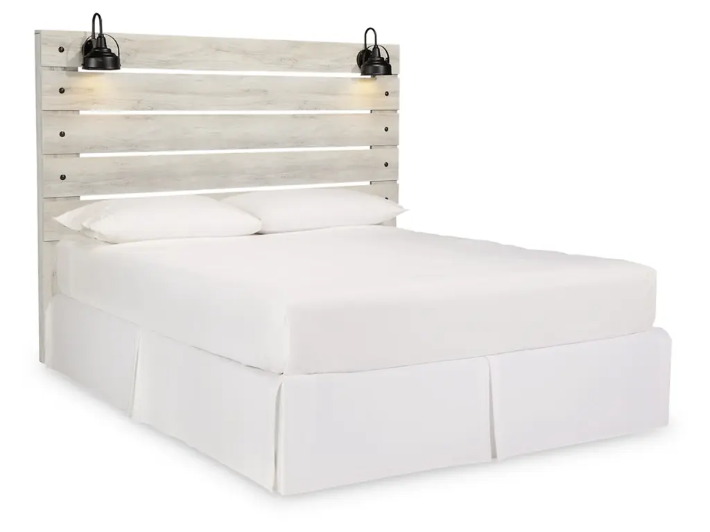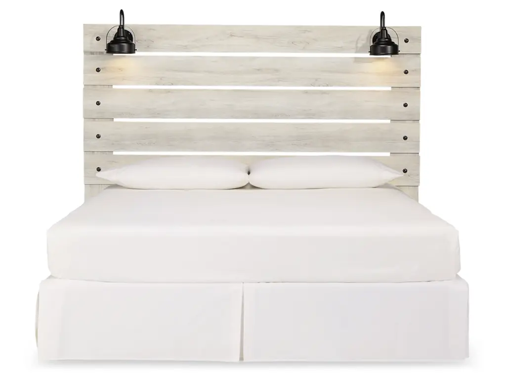 What a delightful take on rustic industrial style. Whether modern loft or modern farmhouse, the Cambeck king panel headboard makes itself at home. The wispy whitewash palette enhances without covering the grain for that weathered look you crave. Love to read in bed? You’re sure to find the retro-chic light sconces and USB plug-ins on the open-slat style headboard such a bright idea.