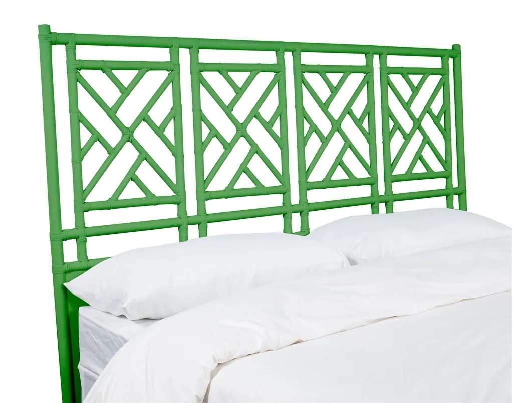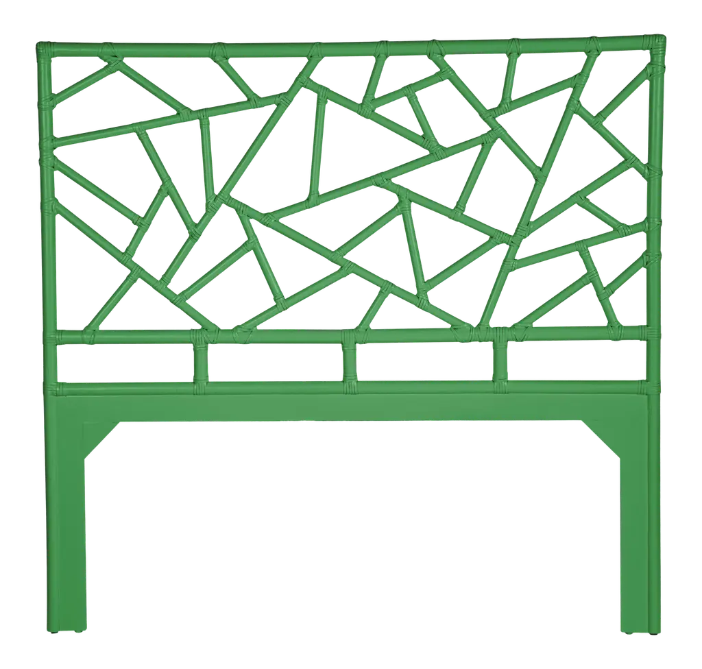 This headboard features classic Rattan design in a geometric pattern. Constructed of solid rattan and hand bound with rawhide bindings. This headboard can be attached to any standard bed frame or hung on the wall. Each headboard is hand finished in the USA and made to order, please allow time for delivery.
