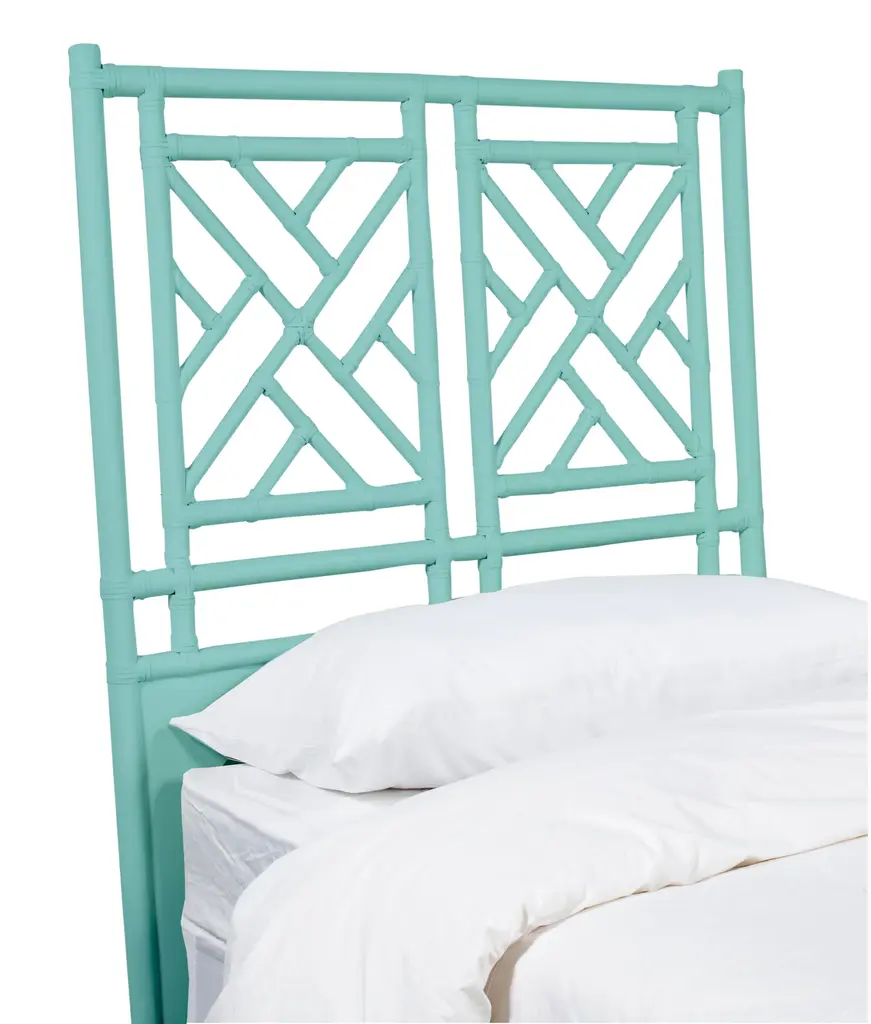 This headboard features classic Rattan design in a geometric pattern. Constructed of solid rattan and hand bound with rawhide bindings. This headboard can be attached to any standard bed frame or hung on the wall. Each headboard is hand finished in the USA and made to order, please allow time for delivery.