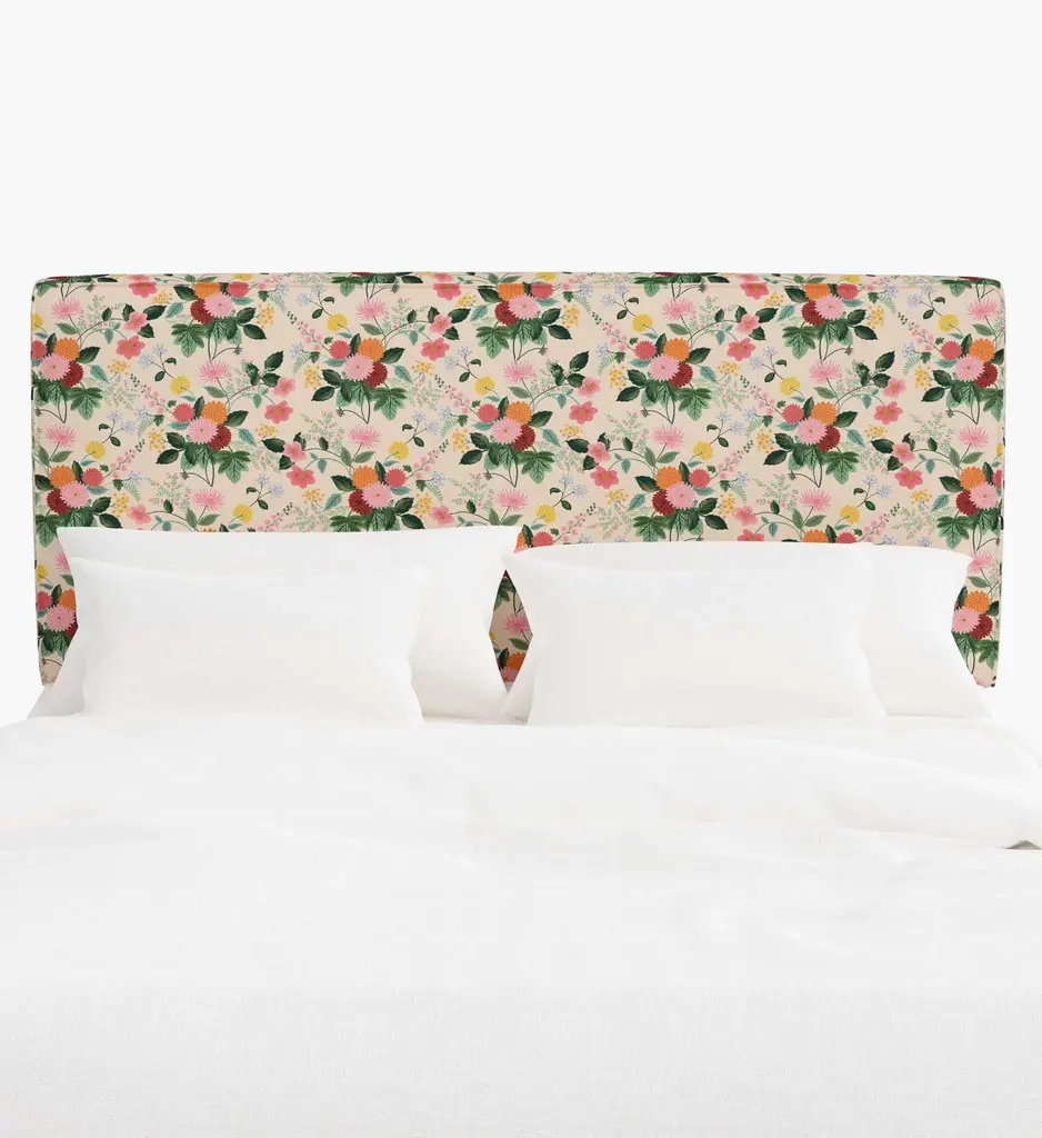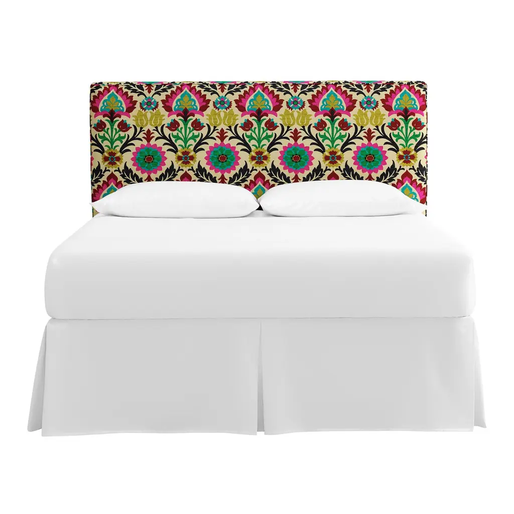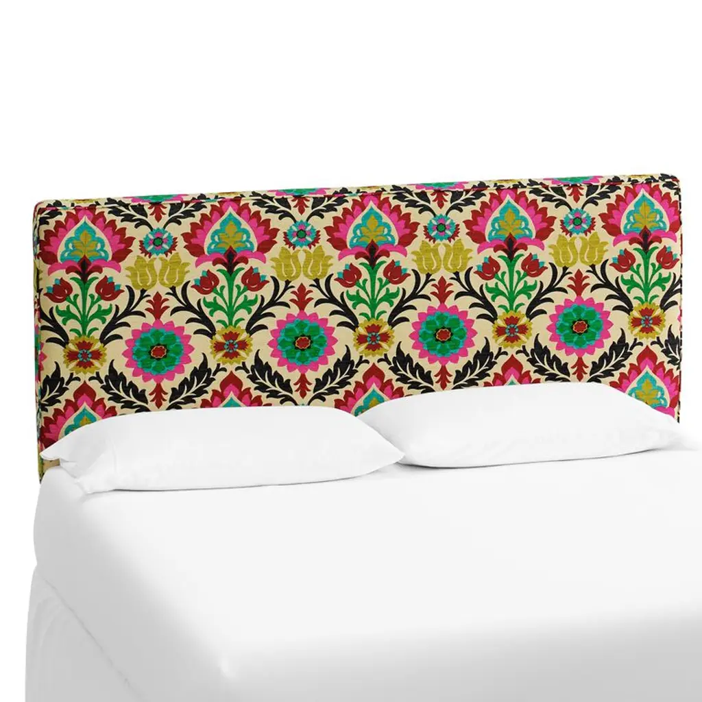 Featuring a bold floral motif with pops of pink, turquoise, green and red on a creamy background, our custom-made headboard is handcrafted with cotton upholstery and sophisticated welt trim. It makes a beautifully vibrant statement as the focal point of your sanctuary.