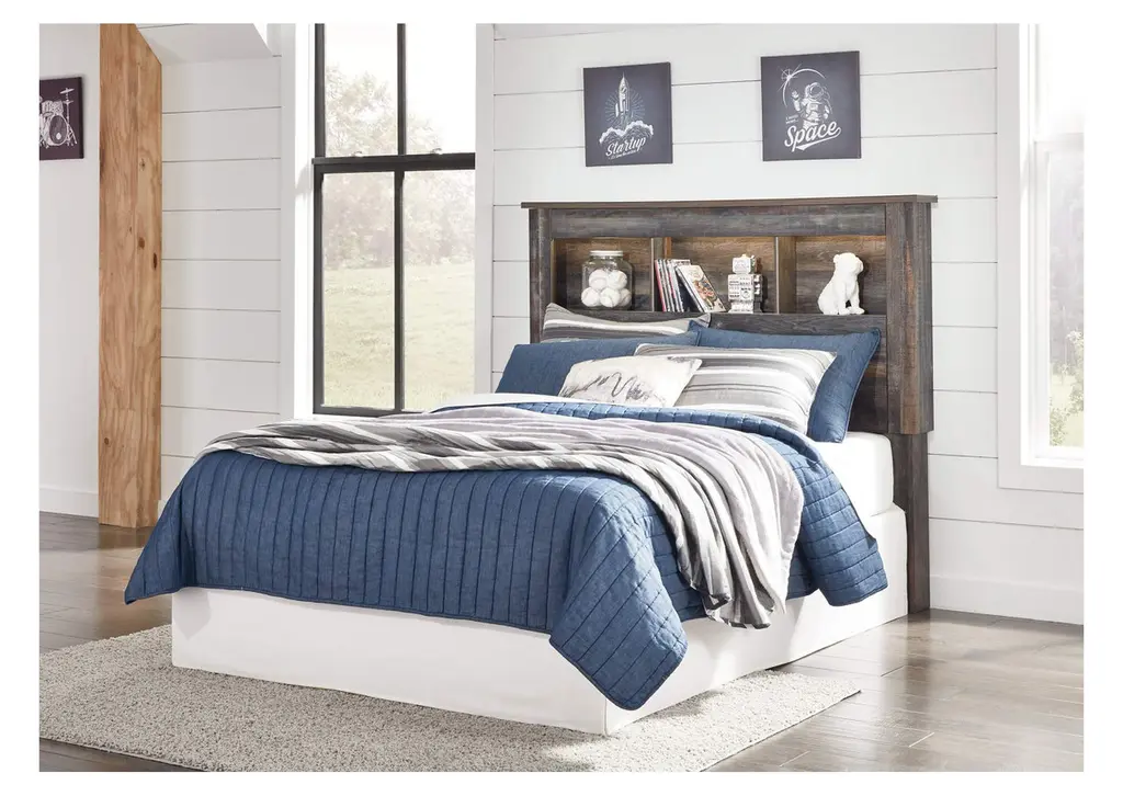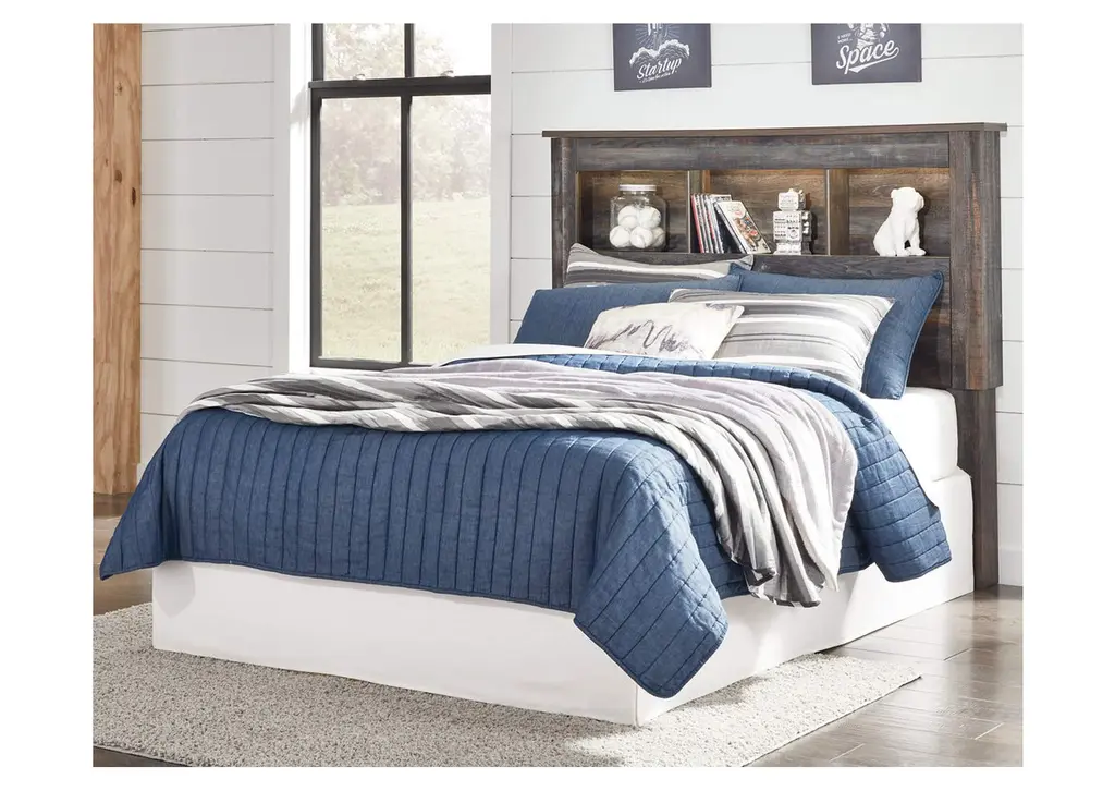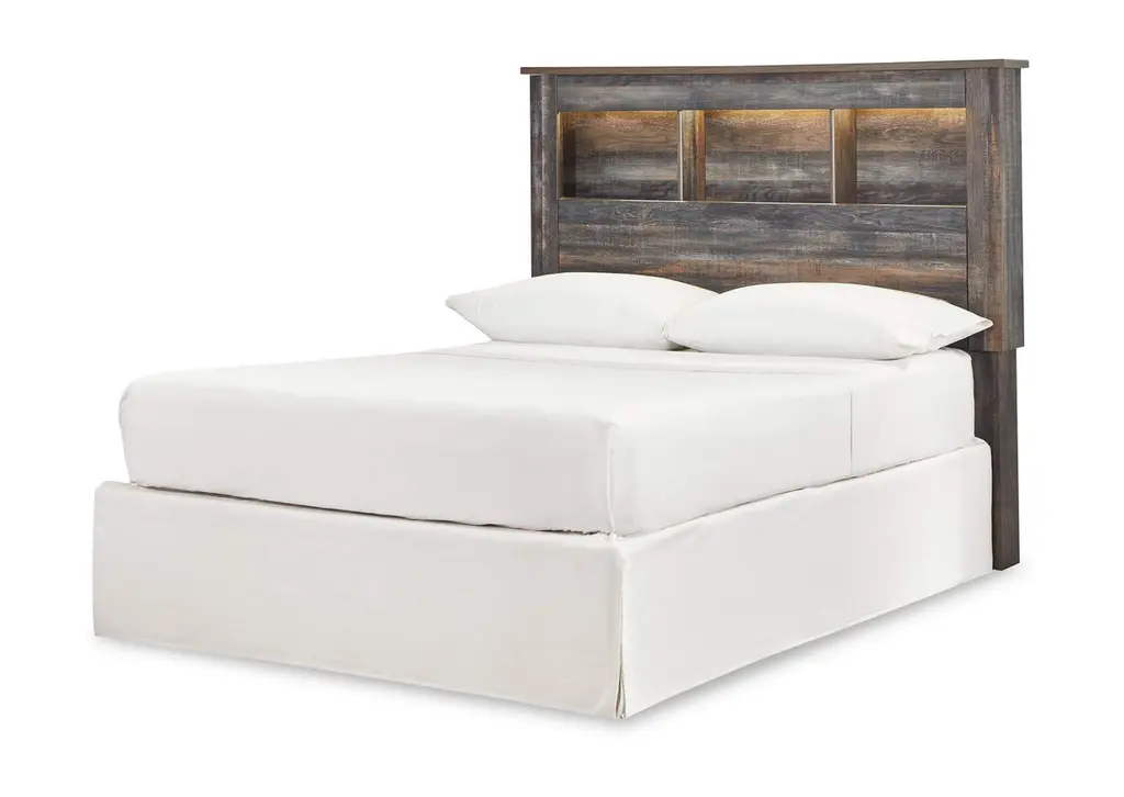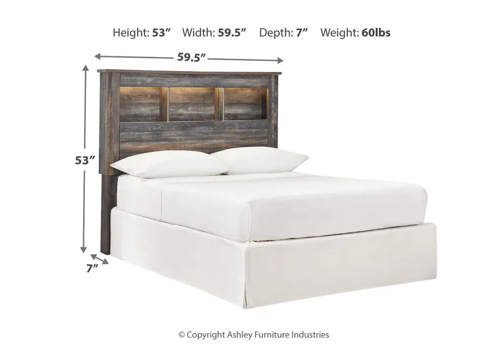 When merged in just the right way, rustic and industrial styles can make one happy marriage. Case in point: the Drystan full bookcase headboard. A refined take on barn board beauty, its complex, replicated wood grain showcases hints of burnt orange and teal tones for a sense of weatherworn authenticity. Three open cubbies lined with a dimming LED light strip keep bedtime reads top of mind. Weight 74.000 lbs. (33.3kgs.)
